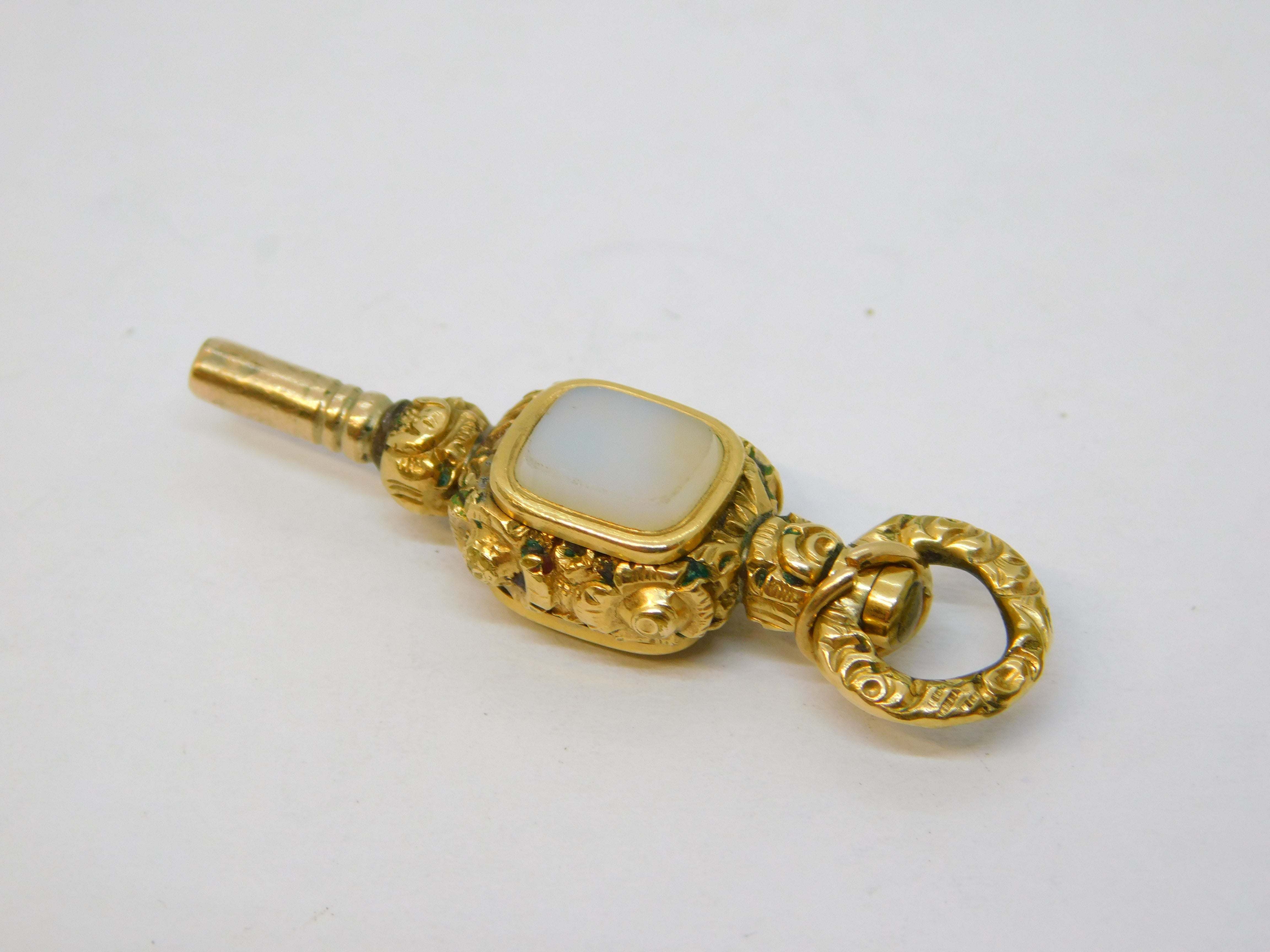 Details: A fantastic and wonderfully designed antique Victorian yellow metal watch key set with bloodstone & chalcedony c1860, the metal is untested and unmarked. This is a wonderful item that would make a perfect gift or addition to any collection.