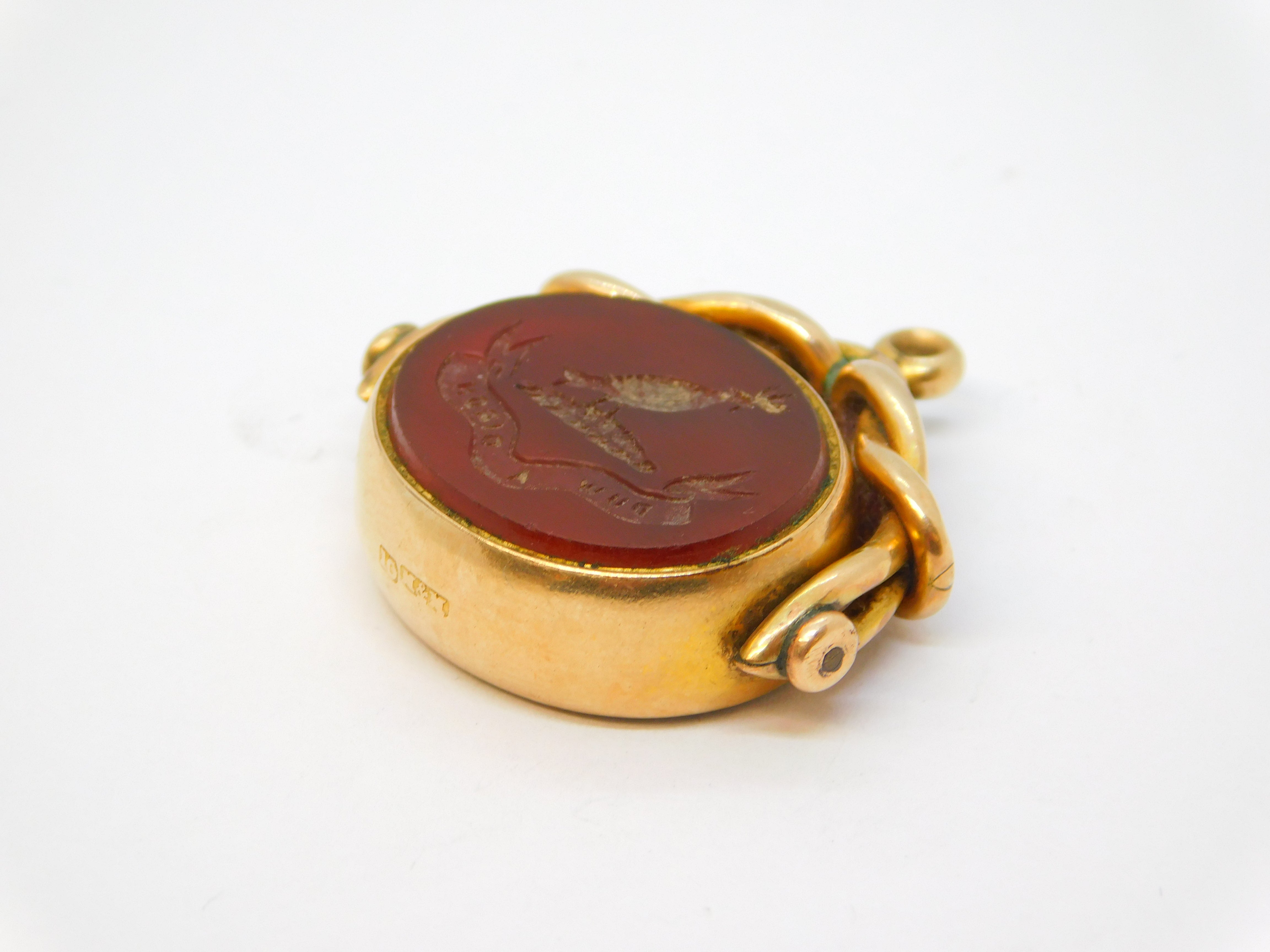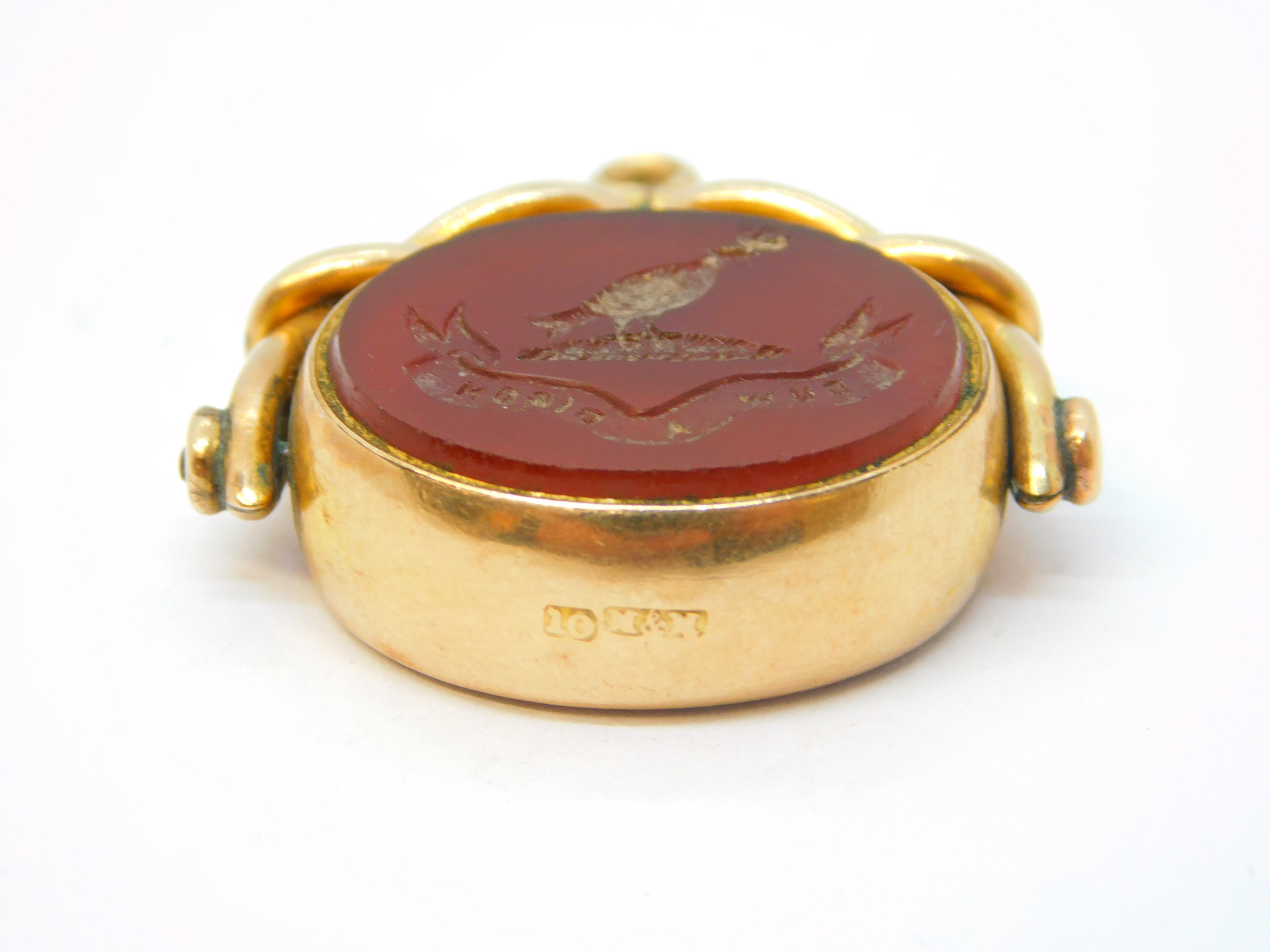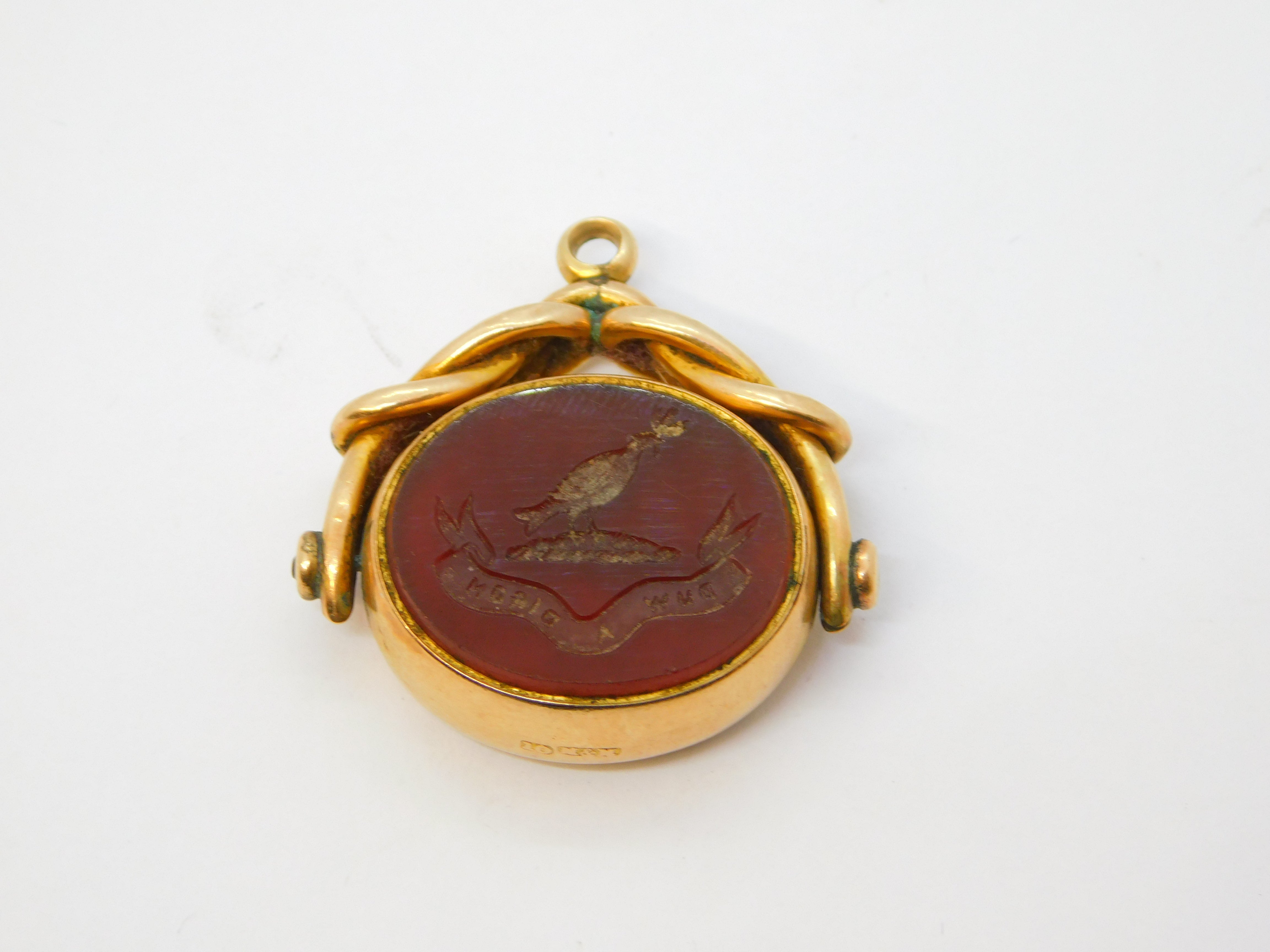 Details: A fantastic and wonderfully designed antique Victorian 10ct rose gold mounted Welsh heraldic carnelian & bloodsone intaglio spinner fob with bird holding an olive branch above 'Duw A Digon' or 'God is Enough' heraldic motto, potentially for the Williams family although provenance is unknown, superior quality spinner with superb detail c1840s. This is a wonderful item that would make a perfect gift or addition to any collection. We are more than happy to provide XRF reports for items upon request.