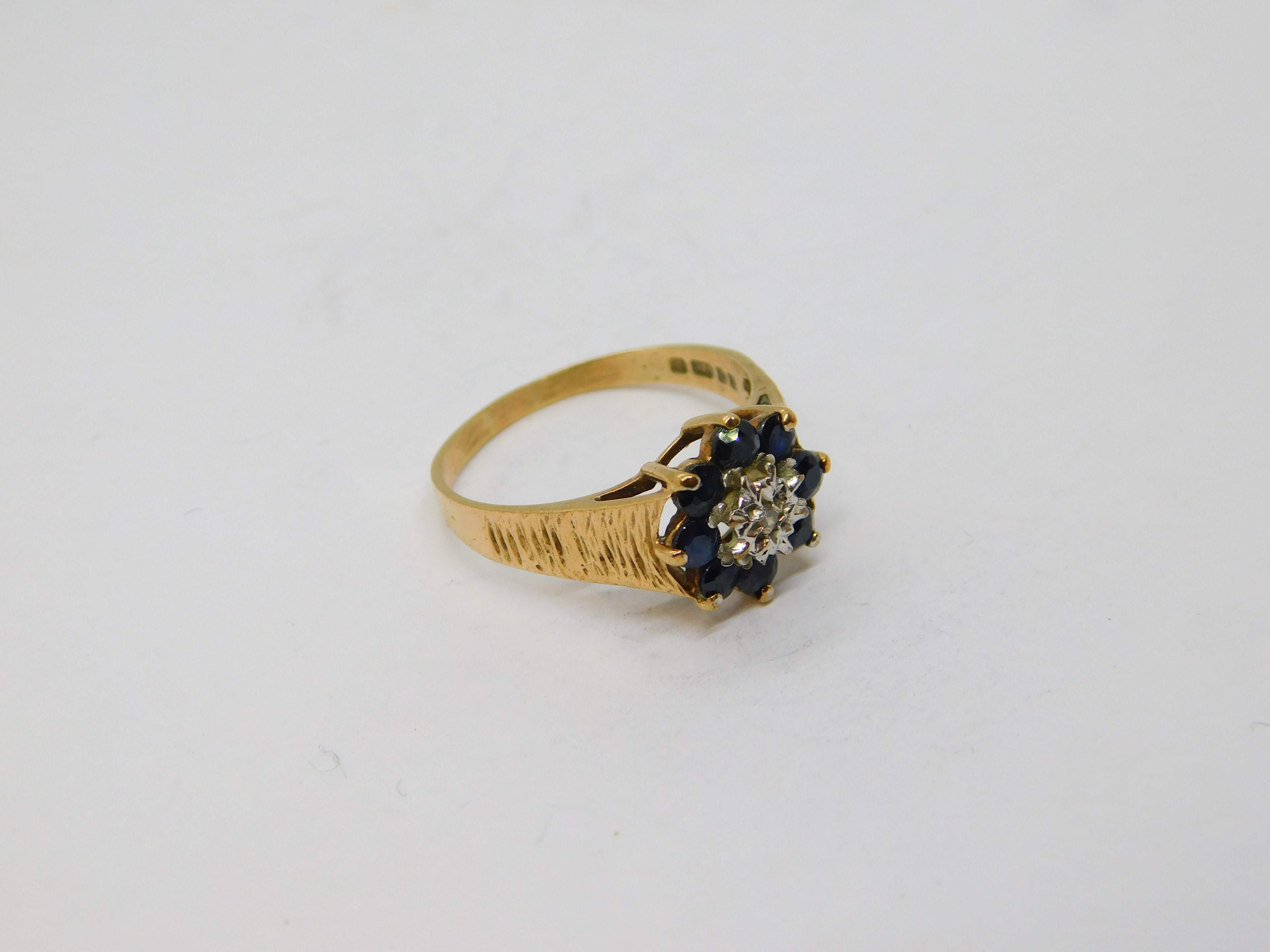 Details: A fantastic and wonderfully designed vintage 9ct yellow gold eight sapphire and single diamond cluster dress ring with textured shoulders hallmarked 1980 London.  The stones have been tested. This is a wonderful item that would make a perfect gift or addition to any collection. We are more than happy to provide XRF reports for items upon request.