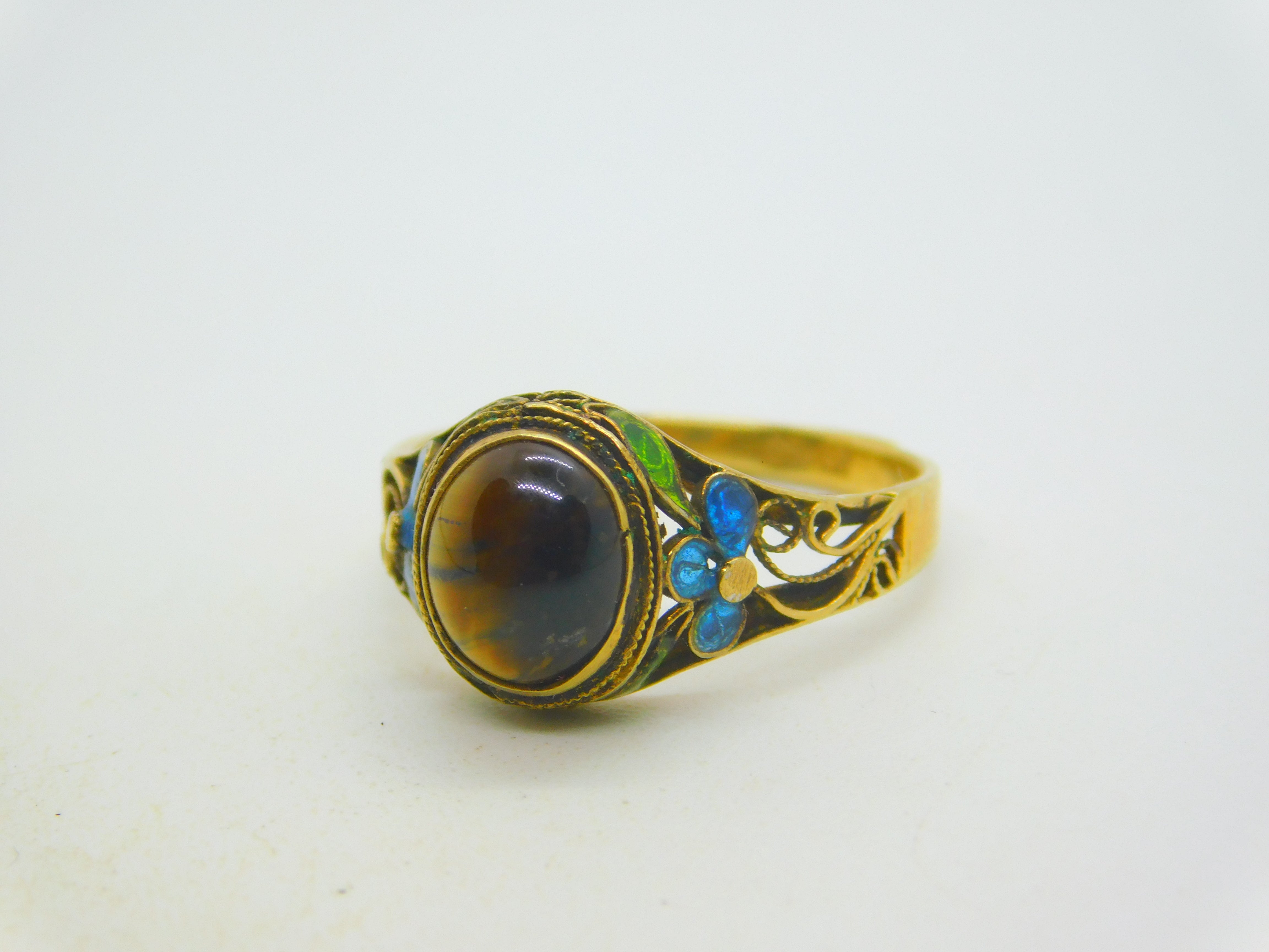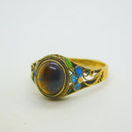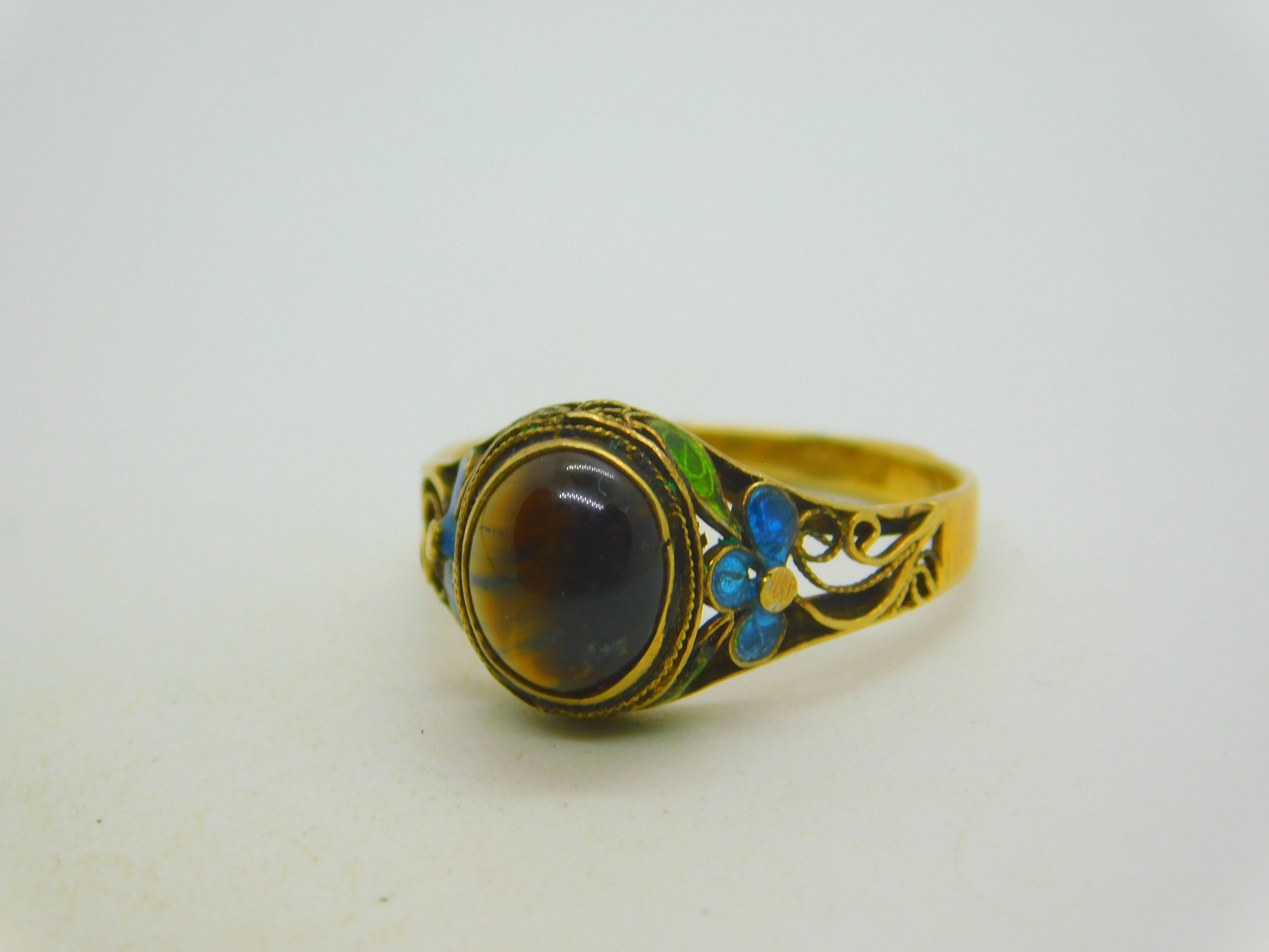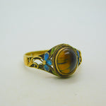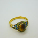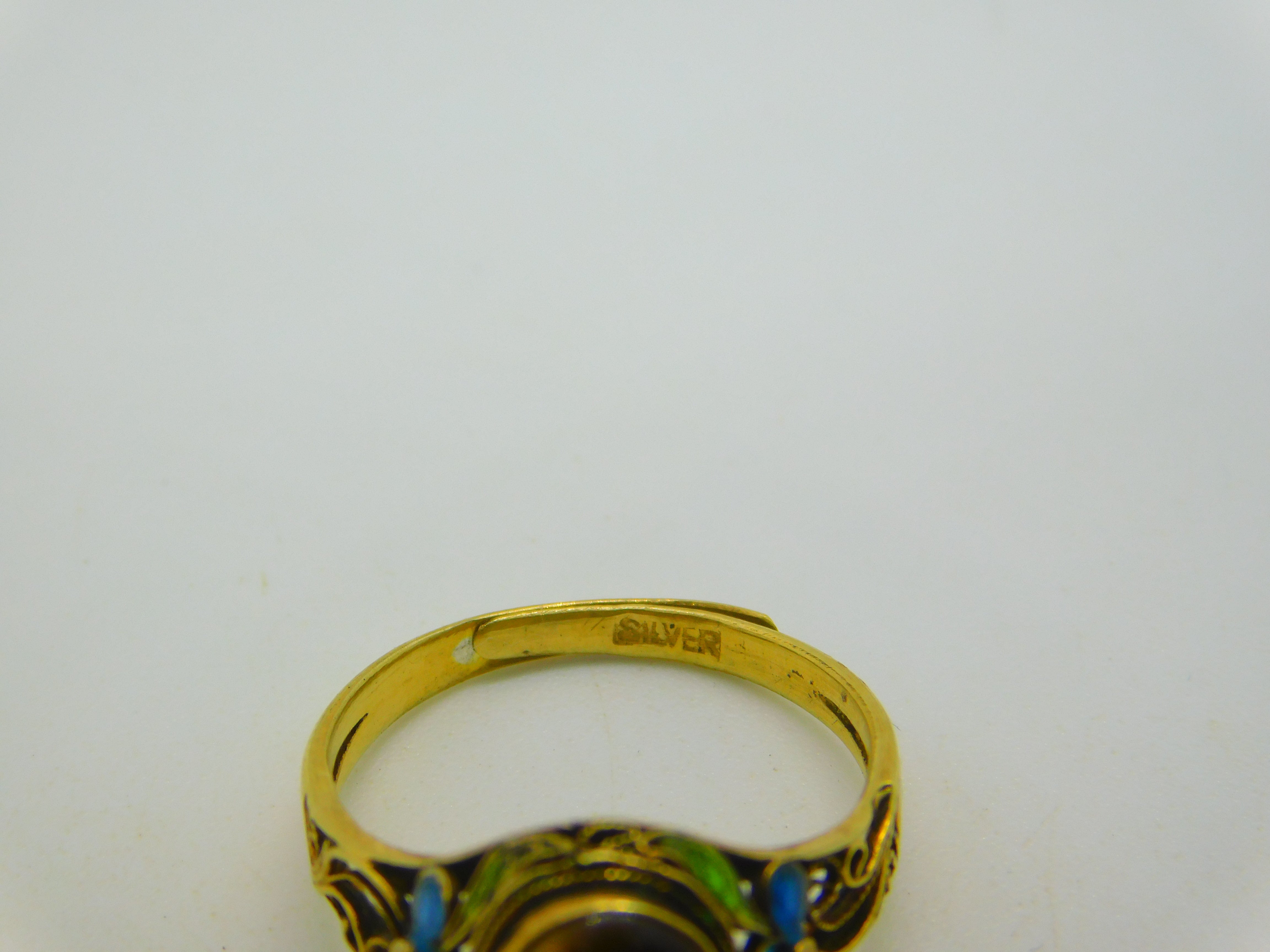 Chinese Sterling Silver Gilt, Cabochon Tiger's Eye & Enamel Floral Dress Ring c1950