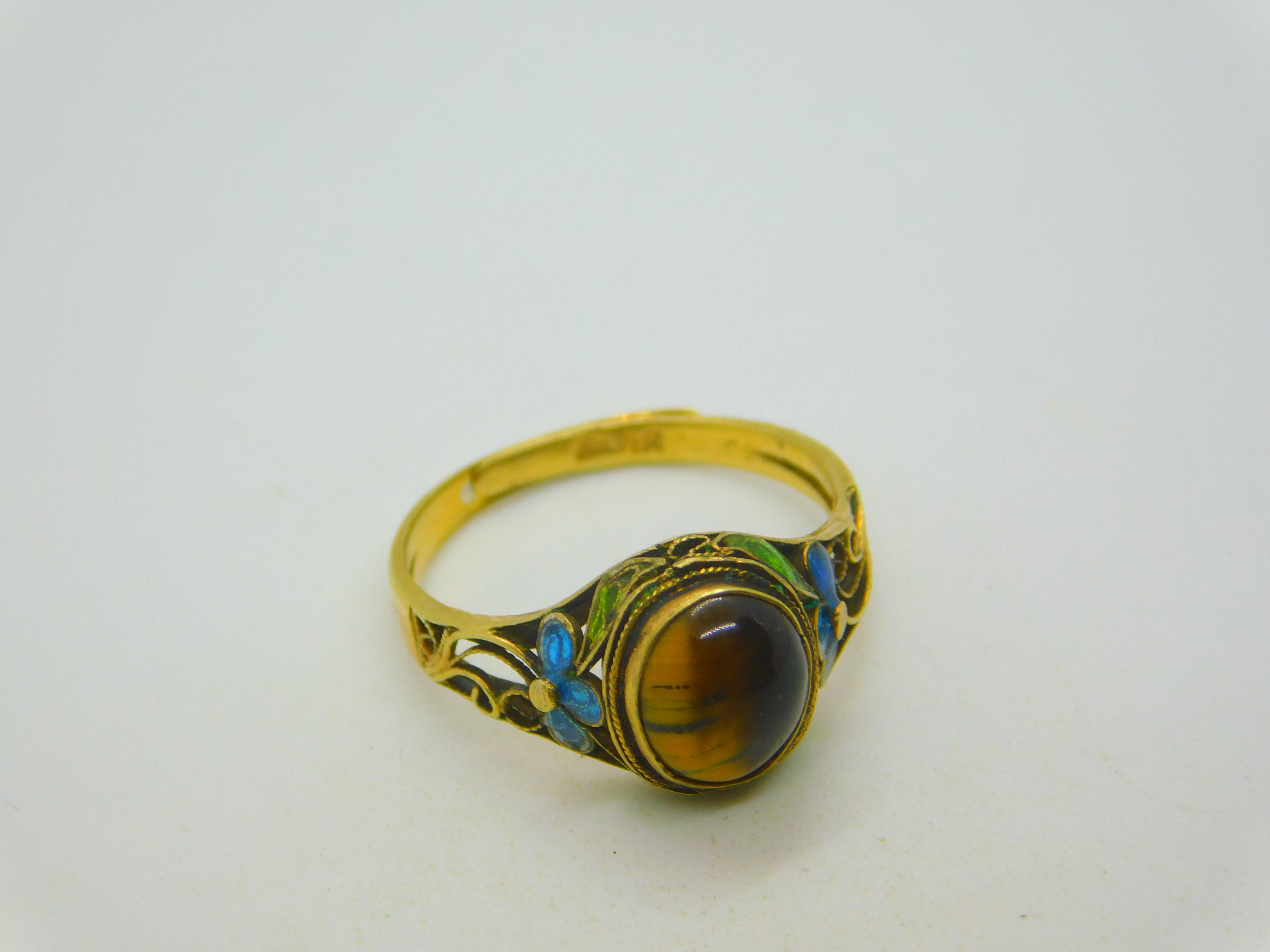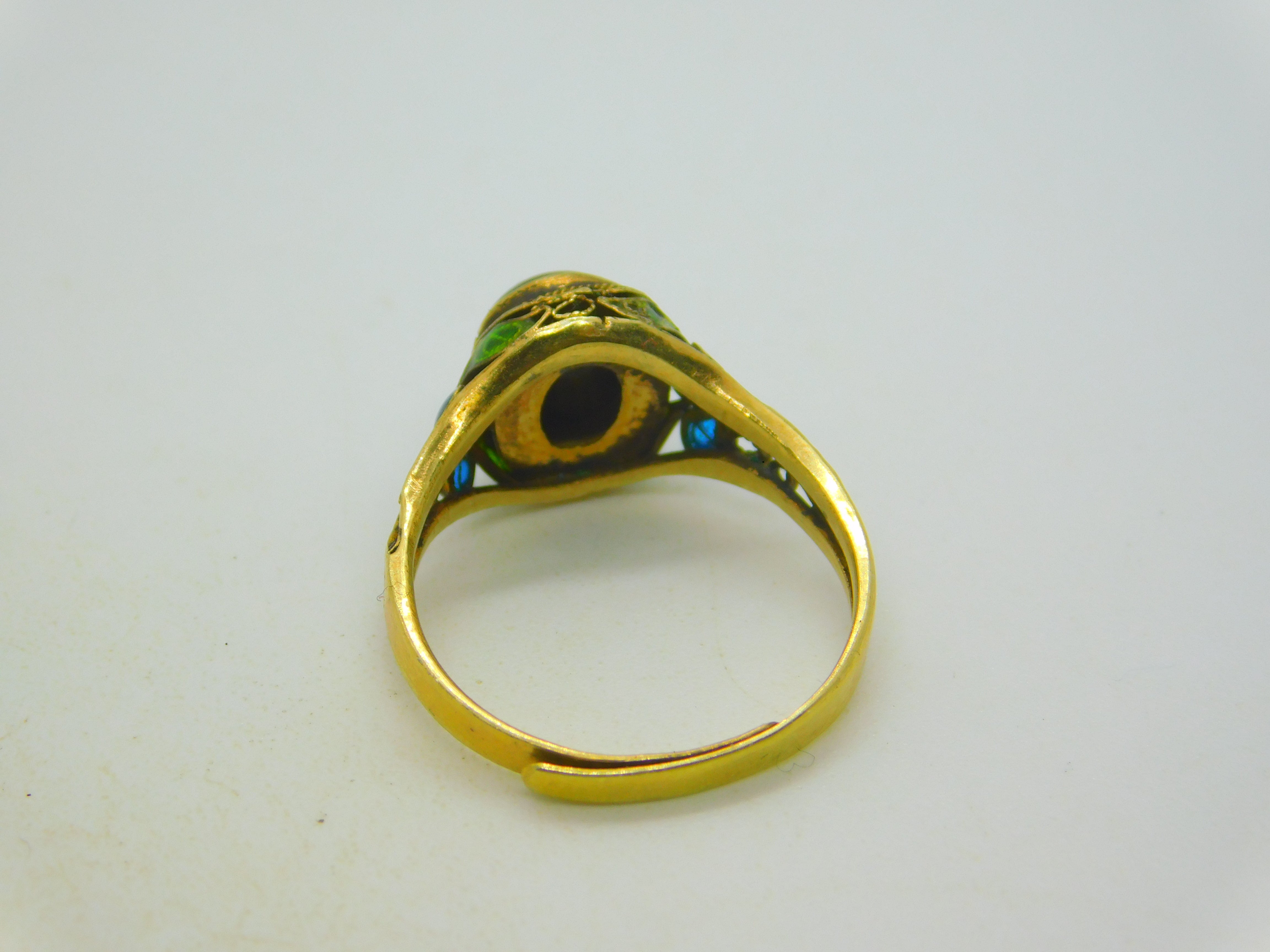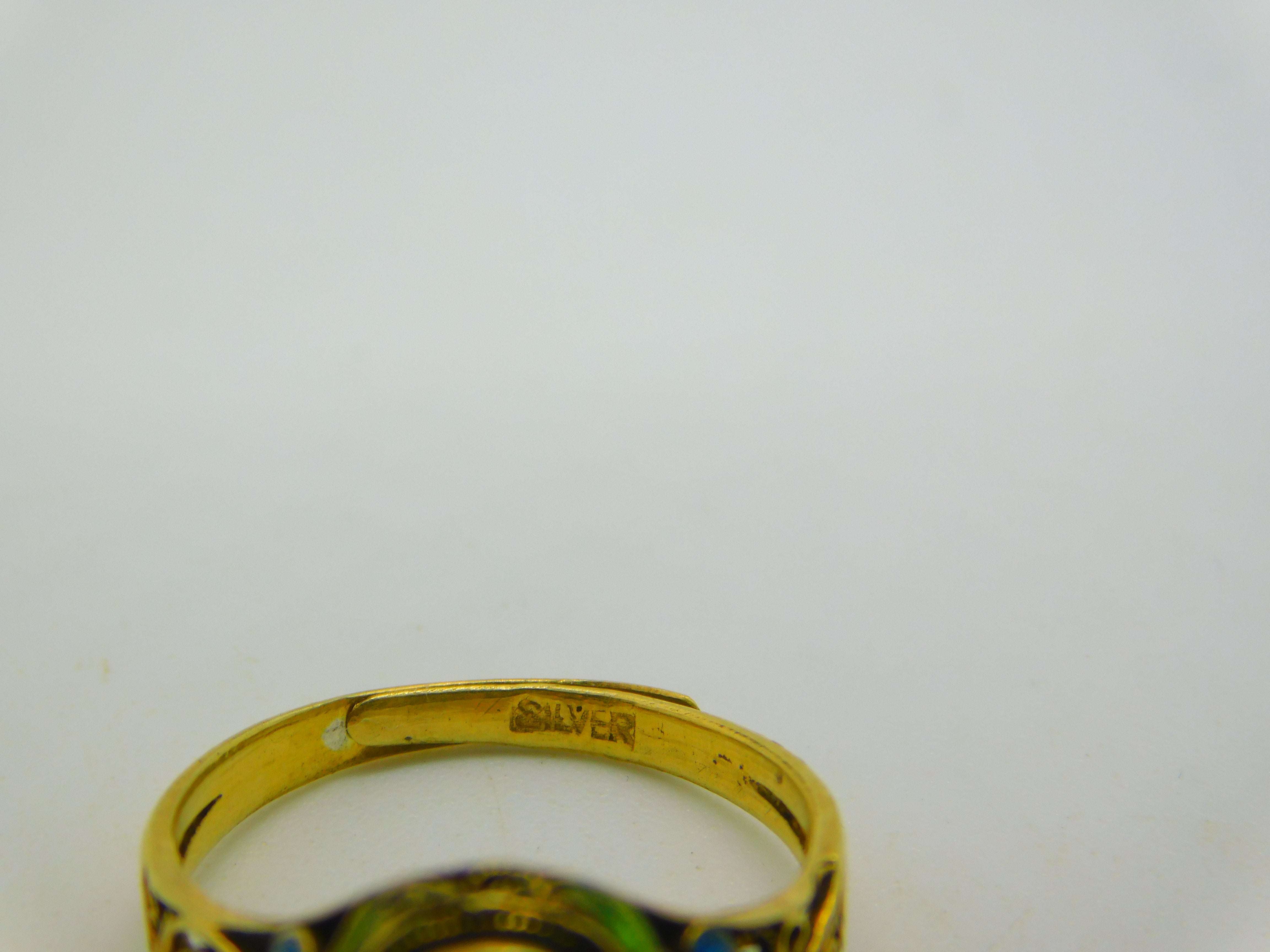 Chinese Sterling Silver Gilt, Cabochon Tiger's Eye & Enamel Floral Dress Ring c1950