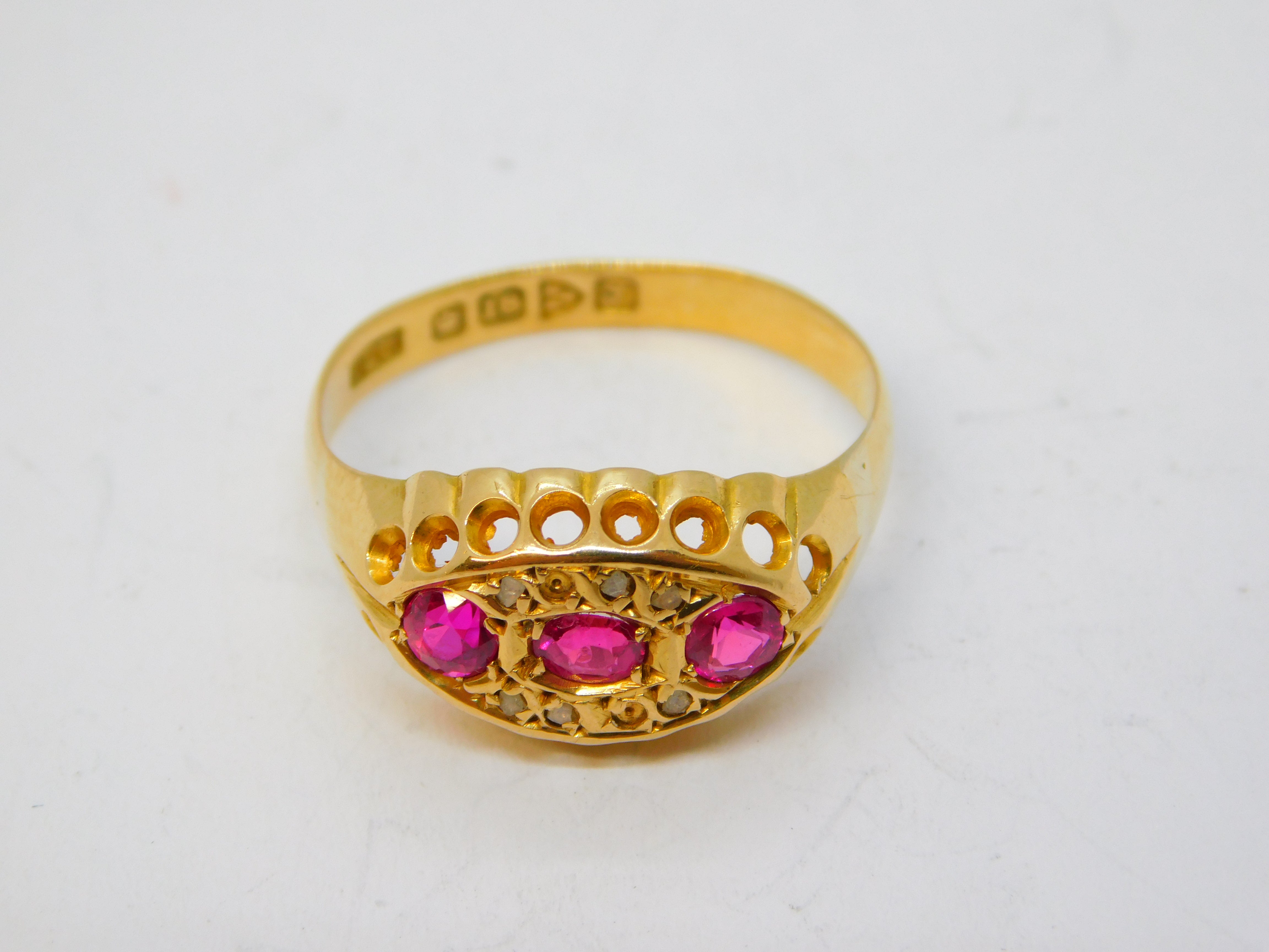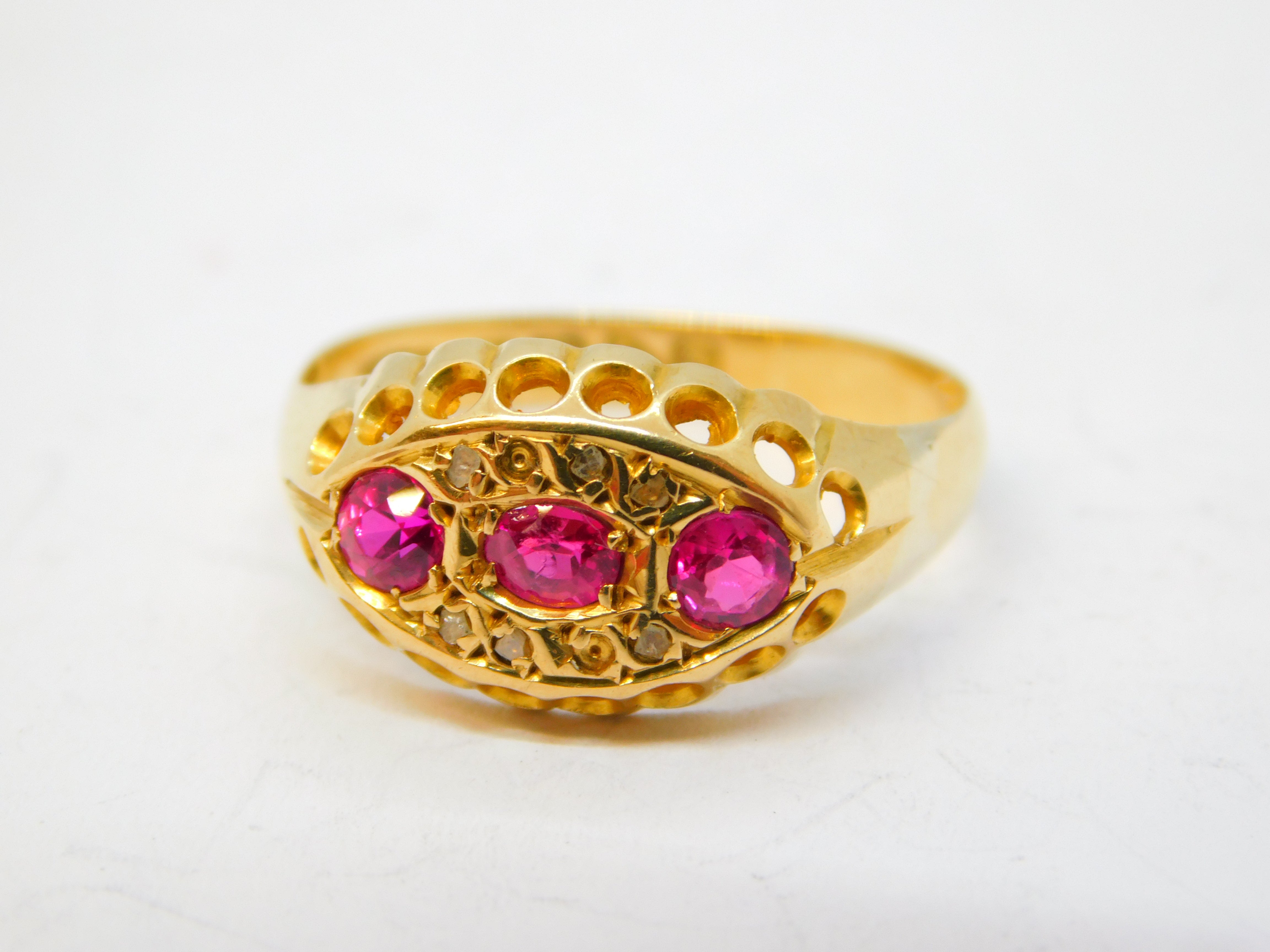 Details: A fantastic and wonderfully designed antique Edwardian 18ct yellow gold boat ring set with rubies & small diamonds hallmarked Chester 1909 to the interior, missing two of the tiny diamonds please note. This is a wonderful item that would make a perfect gift or addition to any collection. We are more than happy to provide XRF reports for items upon request.