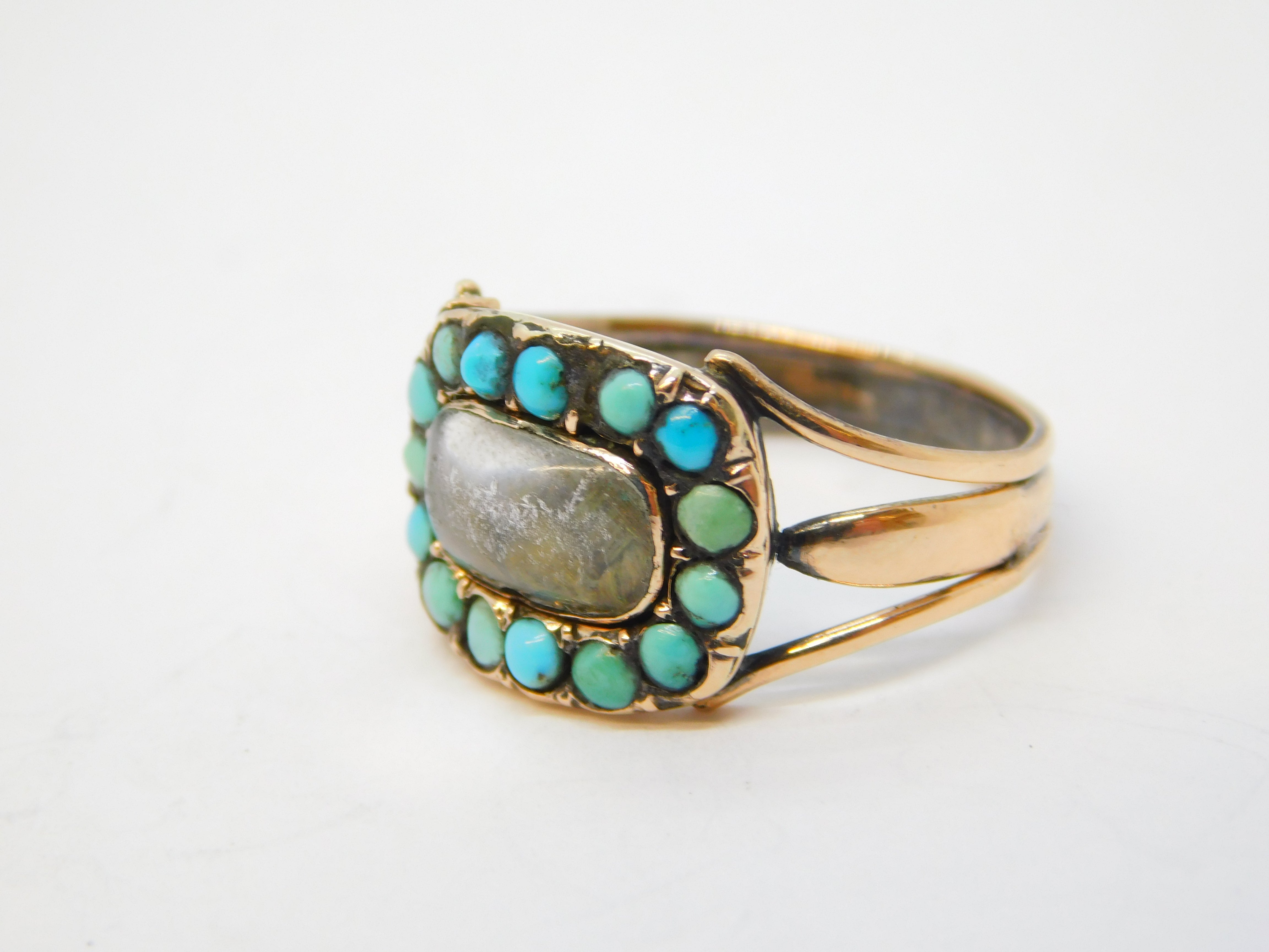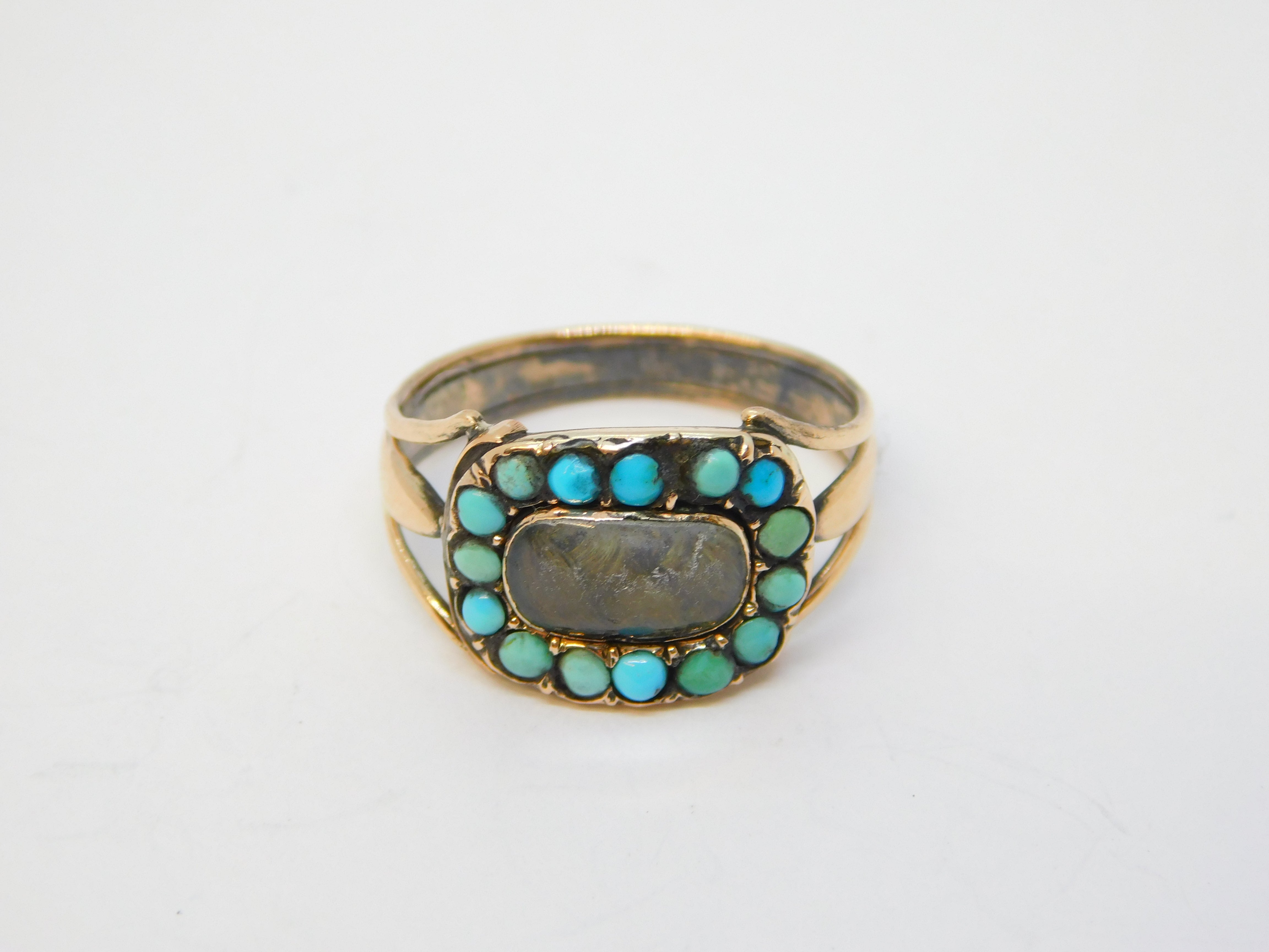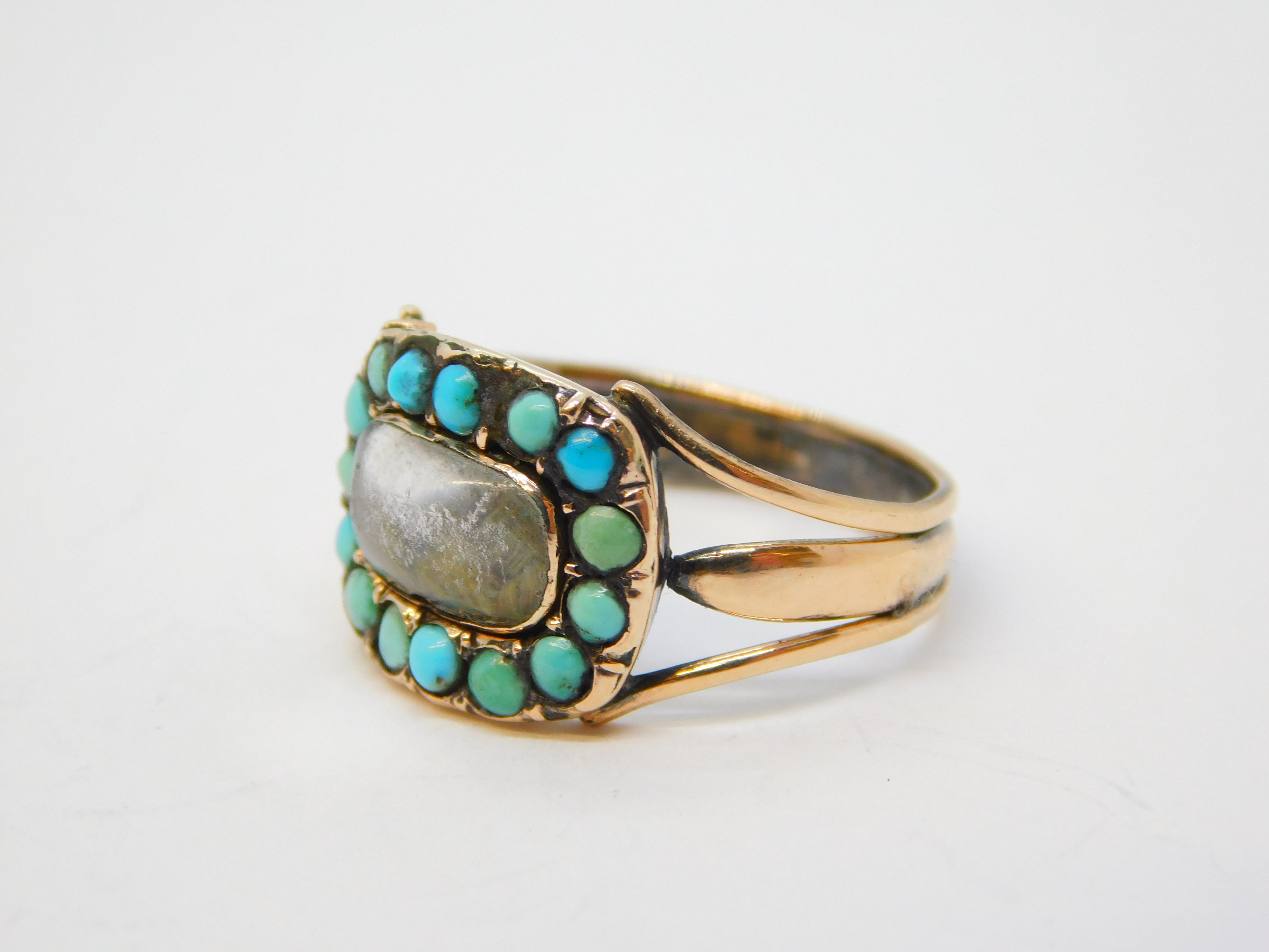 Details: A fantastic and wonderfully designed antique georgian 9ct rose gold, turquoise & hair set mourning ring with lovely detailing engraved to the reverse 'Dearest Brian, Died. 9th Sep. 1812, Aged 68' - the gold has been XRF tested, minor scratching to the front locket. This is a wonderful item that would make a perfect gift or addition to any collection. We are more than happy to provide XRF reports for items upon request.