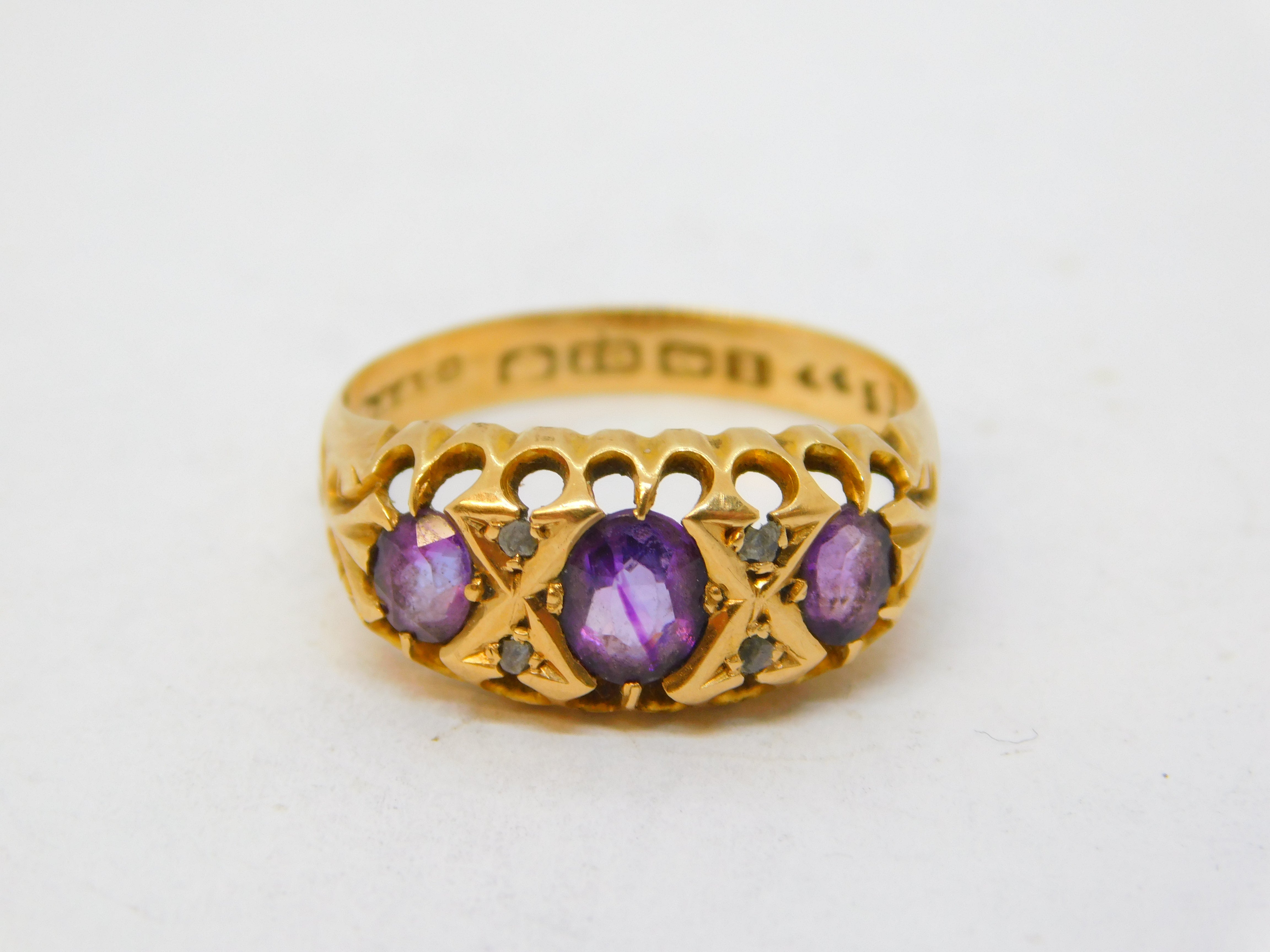 Details: A fantastic and wonderfully designed antique edwardian 18ct yellow gold boat ring set with amethysts & diamonds, hallmarked for Birmingham 1910 by Sampson Mordan & Co. Inclusion to the central amethyst. This is a wonderful item that would make a perfect gift or addition to any collection. We are more than happy to provide XRF reports for items upon request.