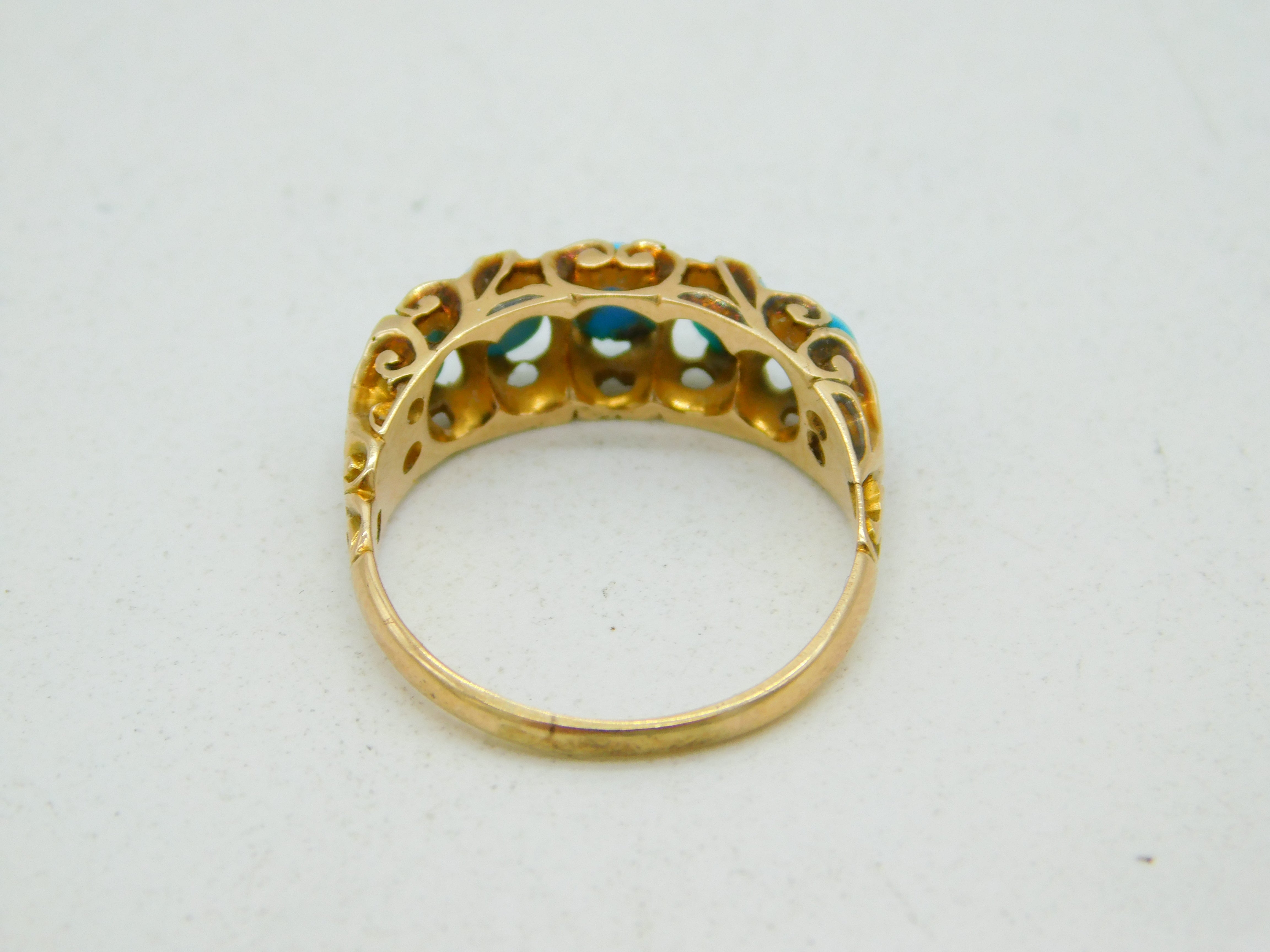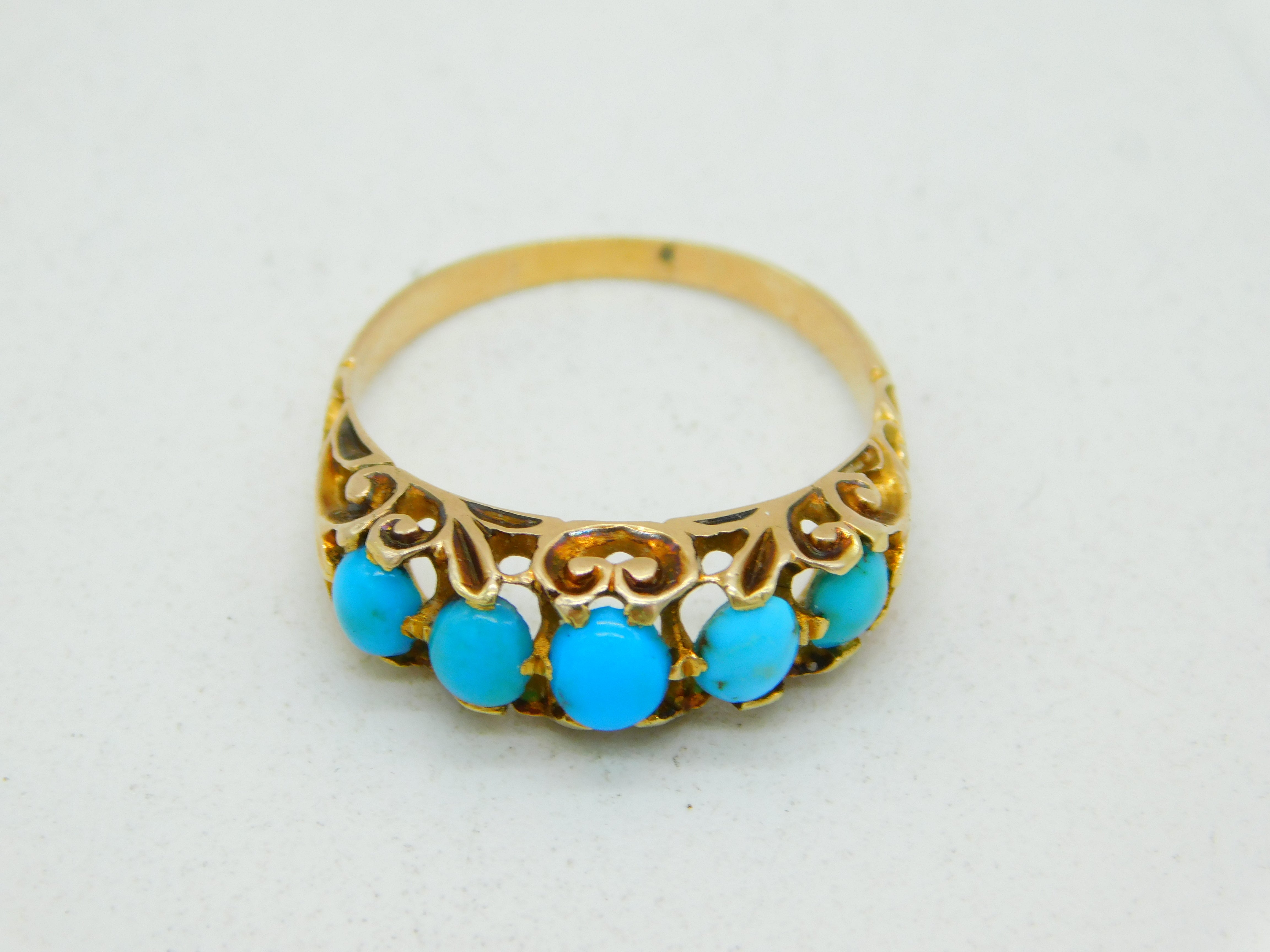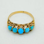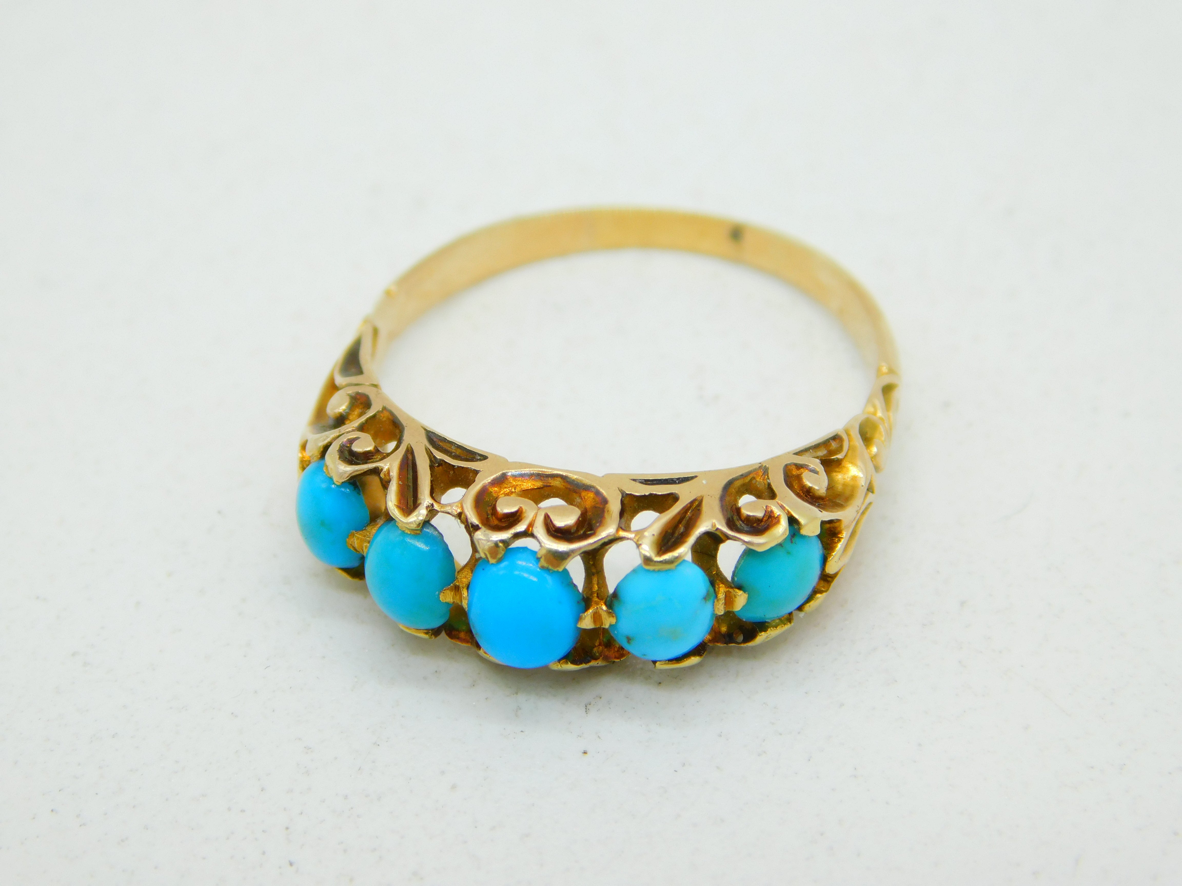 Details: A fantastic and wonderfully designed antique Victorian 12ct yellow gold boat ring decorated with floral patterns to the shoulders and set with five graduated cabochon cut turquoise stones. The gold has been XRF tested as it is unmarked. This is a wonderful item that would make a perfect gift or addition to any collection. We are more than happy to provide XRF reports for items upon request.