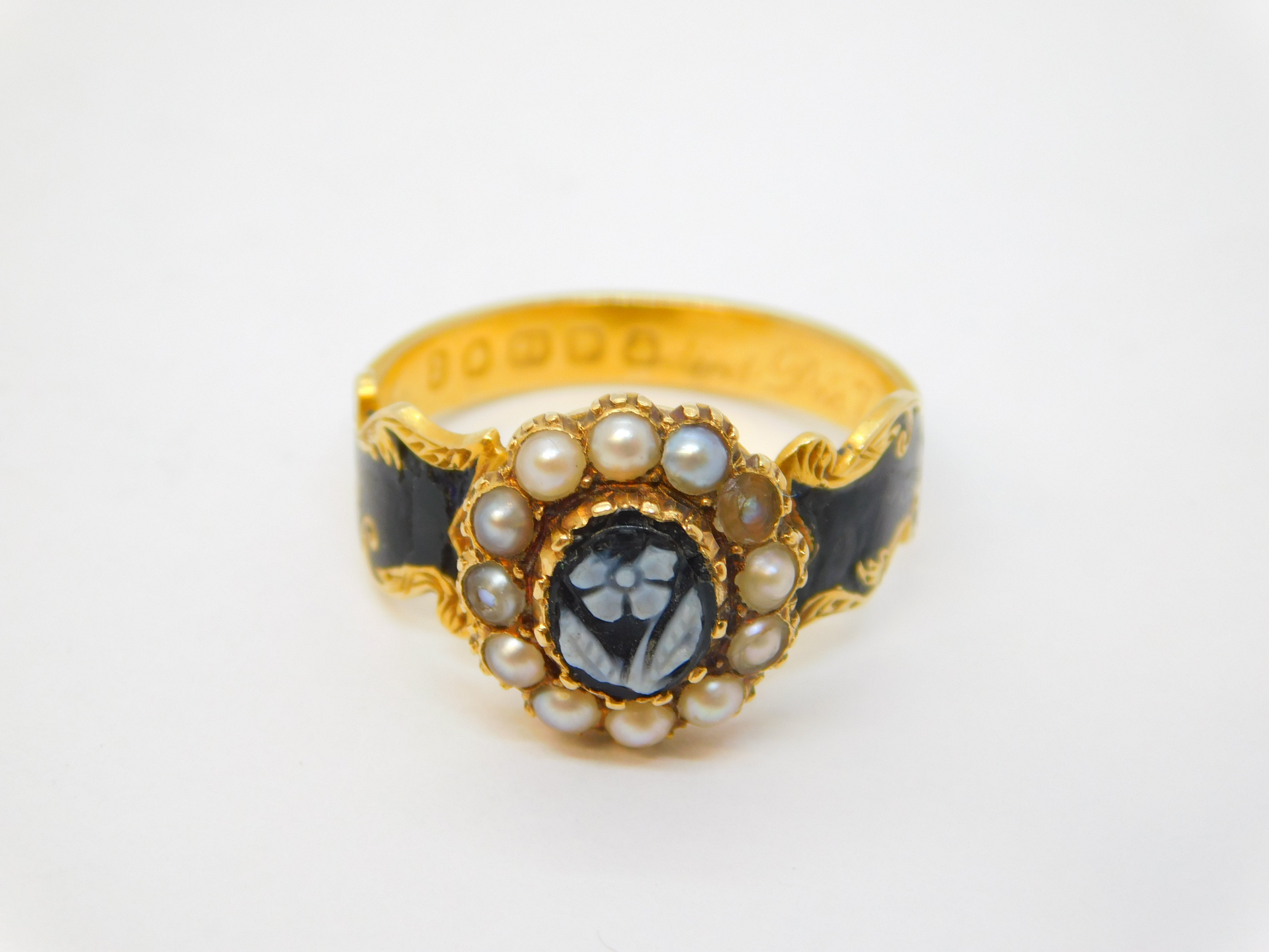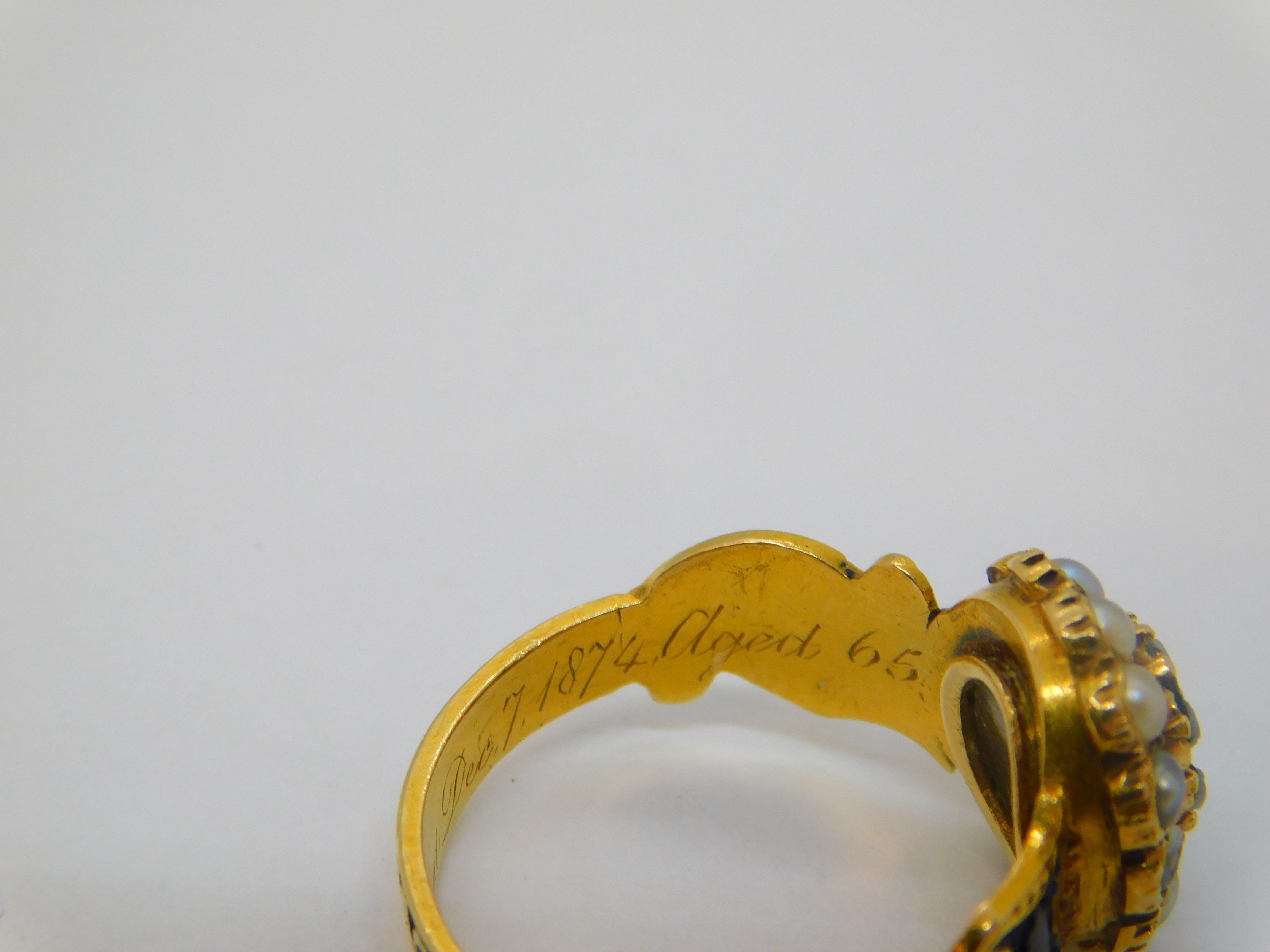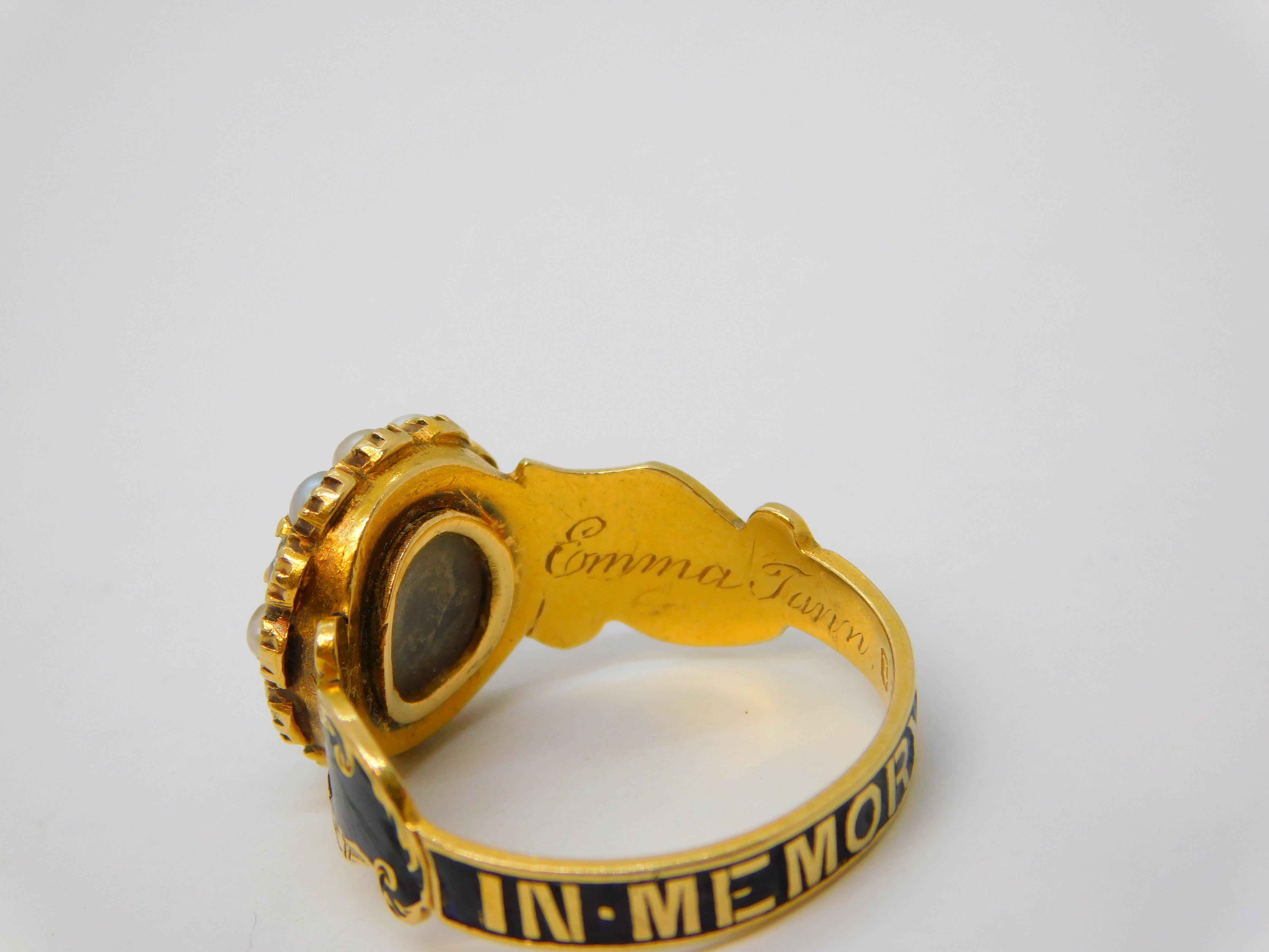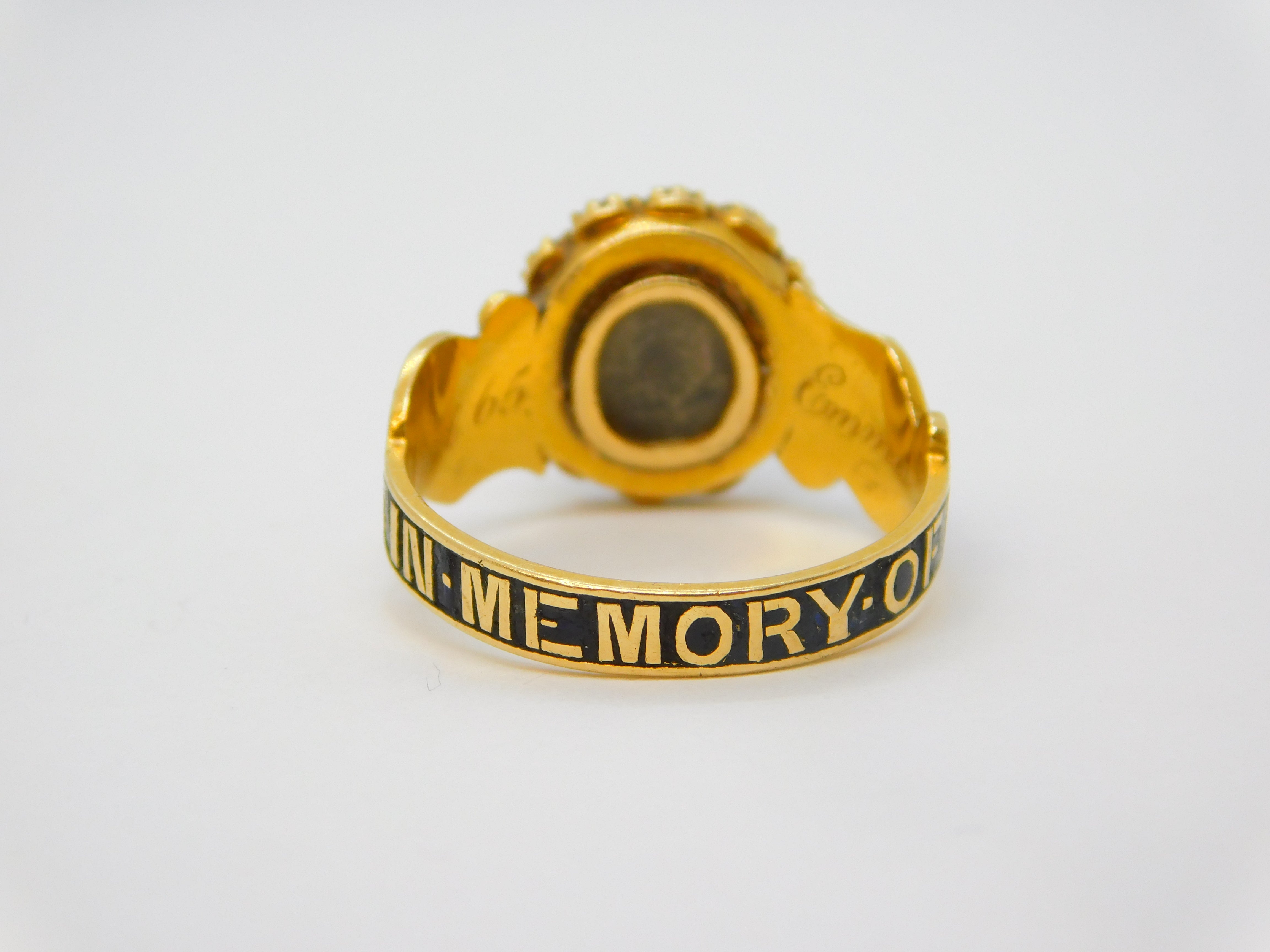 Details: A fantastic and wonderfully designed antique Victorian 18ct yellow gold mourning ring adorned throughout with black enamel, the reverse of the shank bearing the words 'In Memory Of'. The central cartouche is set with a black hardstone carved flower cameo surrounding by seed pearls symbolic of tears. The interior of the band is set with a small locket to hold a section of hair and is engraved with the words 'Emma Jann, Died 7th Dec 1874, Aged 65'. The ring is fully hallmarked for London 1874. Minor enamel loss in areas and a small chip to the central hardstone. This is a wonderful item that would make a perfect gift or addition to any collection. We are more than happy to provide XRF reports for items upon request.
