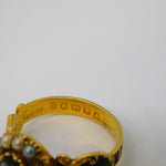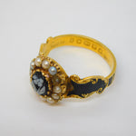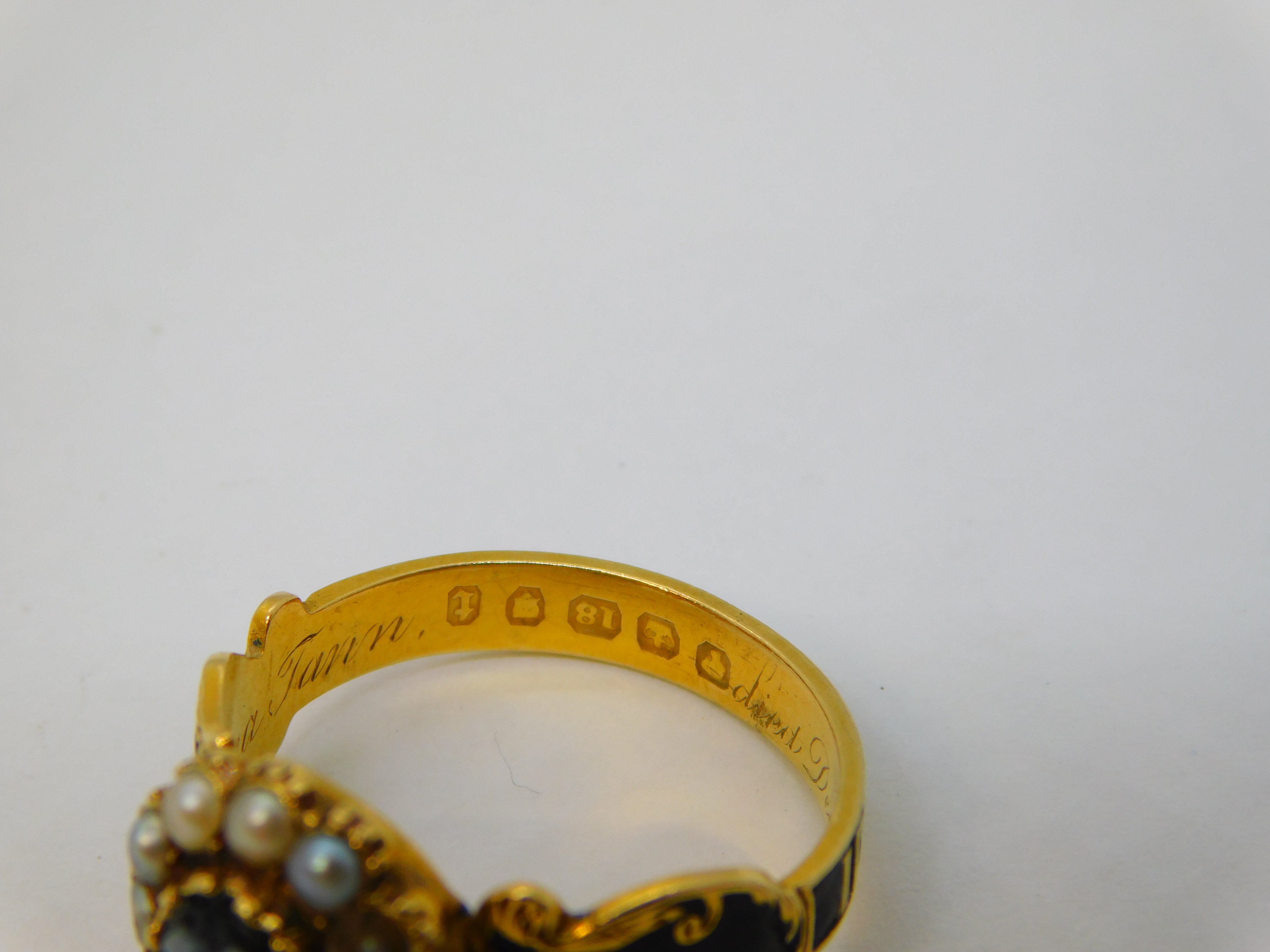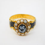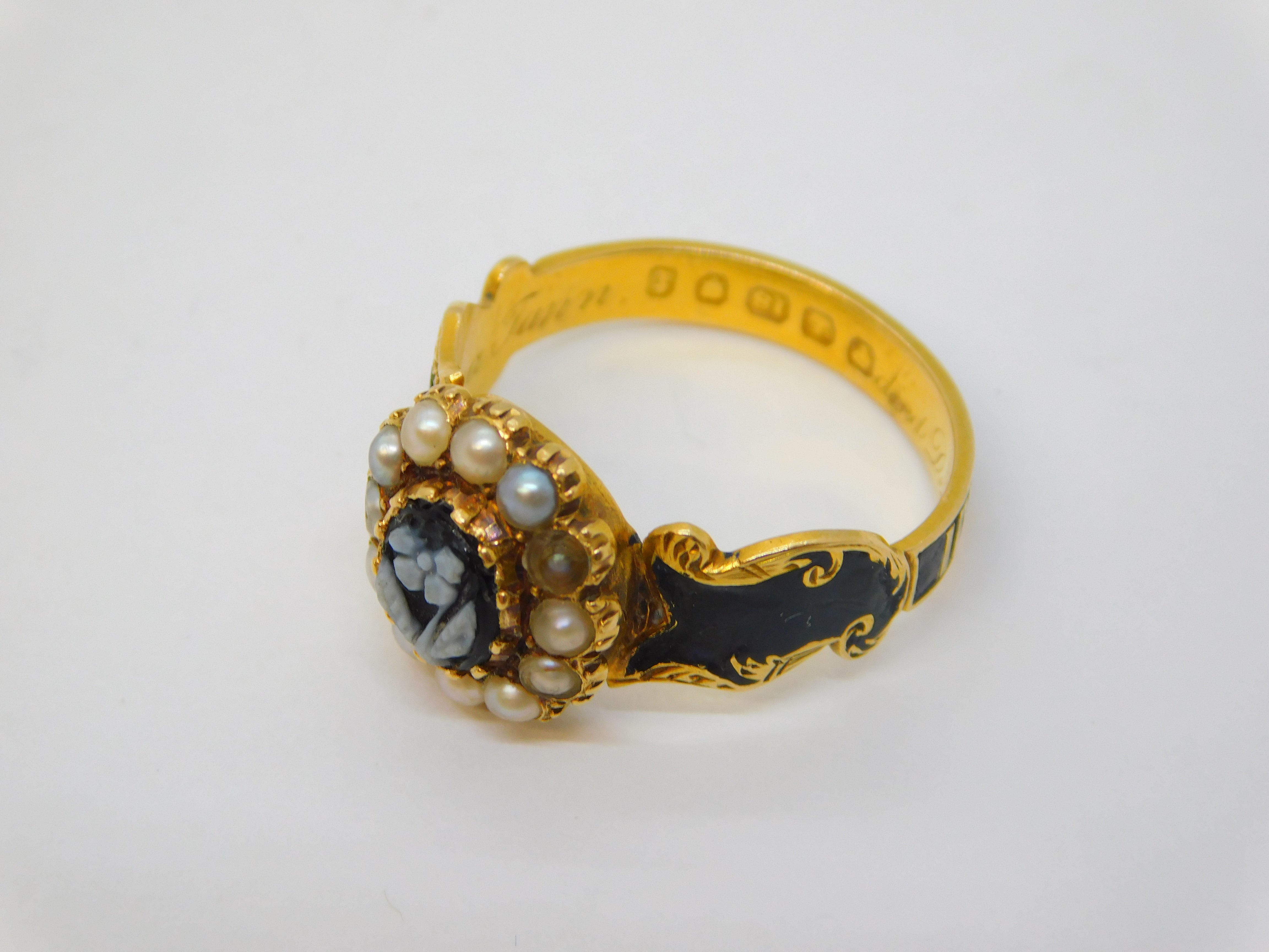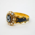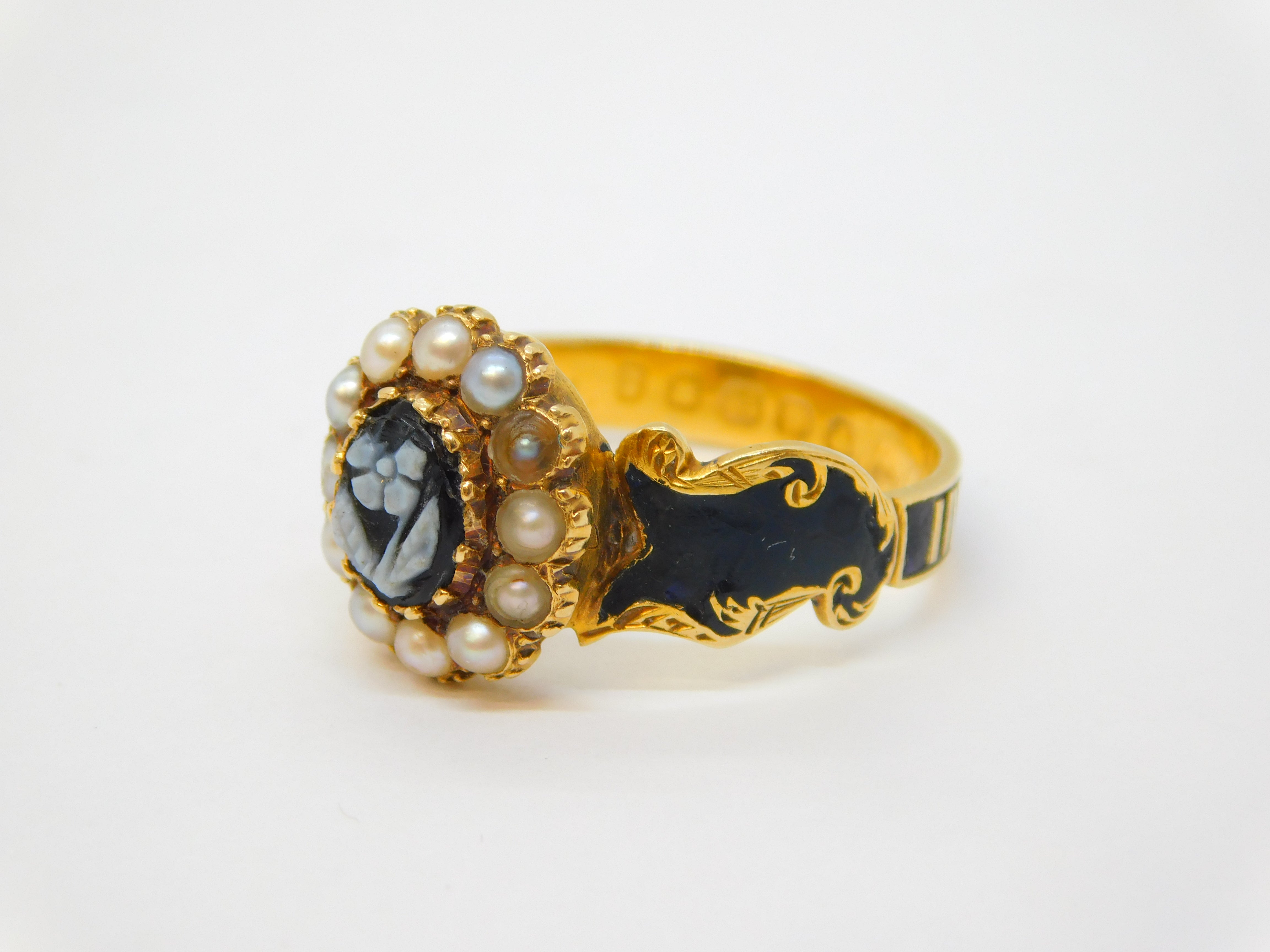 Details: A fantastic and wonderfully designed antique Victorian 18ct yellow gold mourning ring adorned throughout with black enamel, the reverse of the shank bearing the words 'In Memory Of'. The central cartouche is set with a black hardstone carved flower cameo surrounding by seed pearls symbolic of tears. The interior of the band is set with a small locket to hold a section of hair and is engraved with the words 'Emma Jann, Died 7th Dec 1874, Aged 65'. The ring is fully hallmarked for London 1874. Minor enamel loss in areas and a small chip to the central hardstone. This is a wonderful item that would make a perfect gift or addition to any collection. We are more than happy to provide XRF reports for items upon request.
