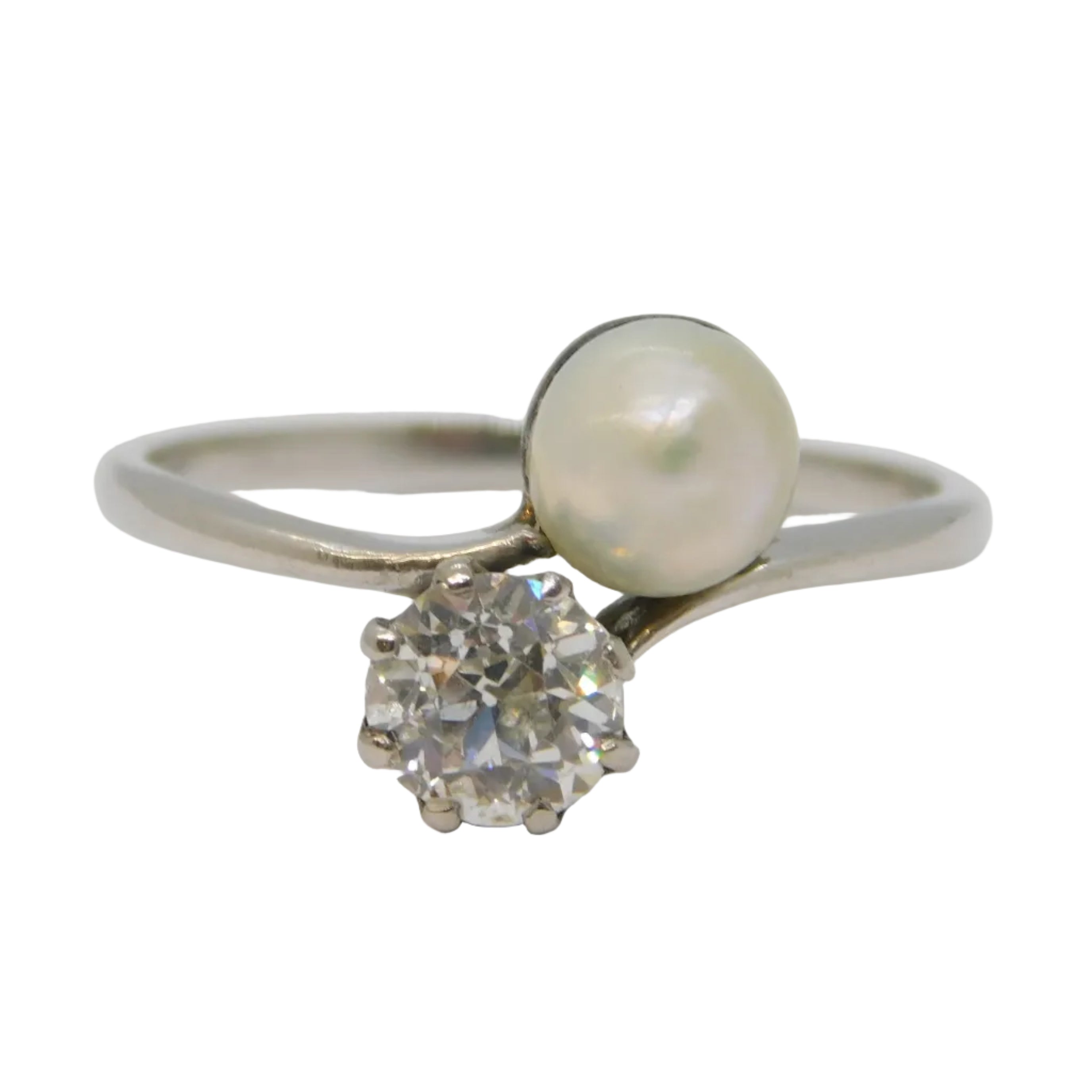 Platinum 0.6ct Claw Set European Cut Diamond & Pearl Crossover Ring Antique Art Deco