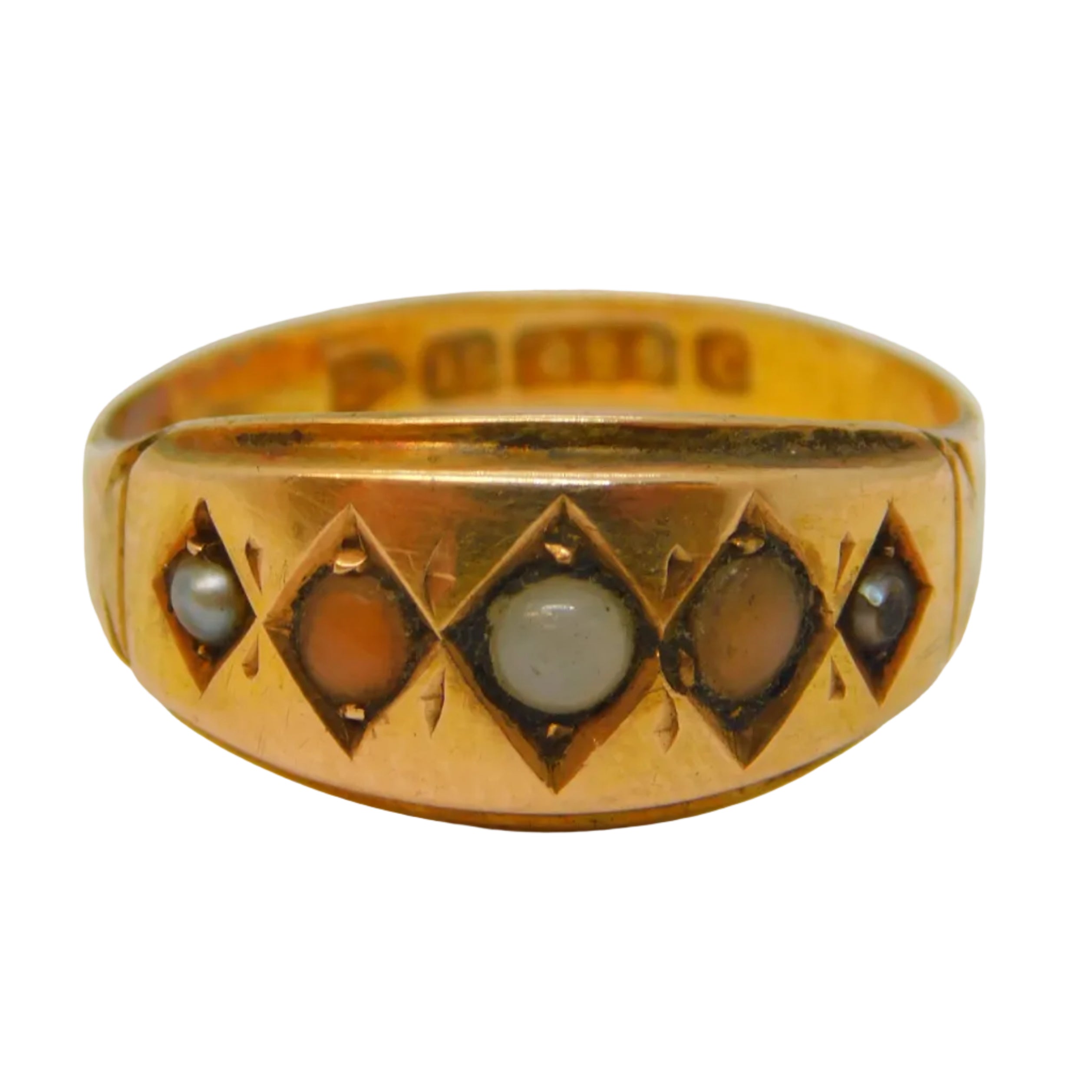 Victorian 15ct Yellow Gold, Seed Pearl & Coral Boat Ring 1886 Chester Antique