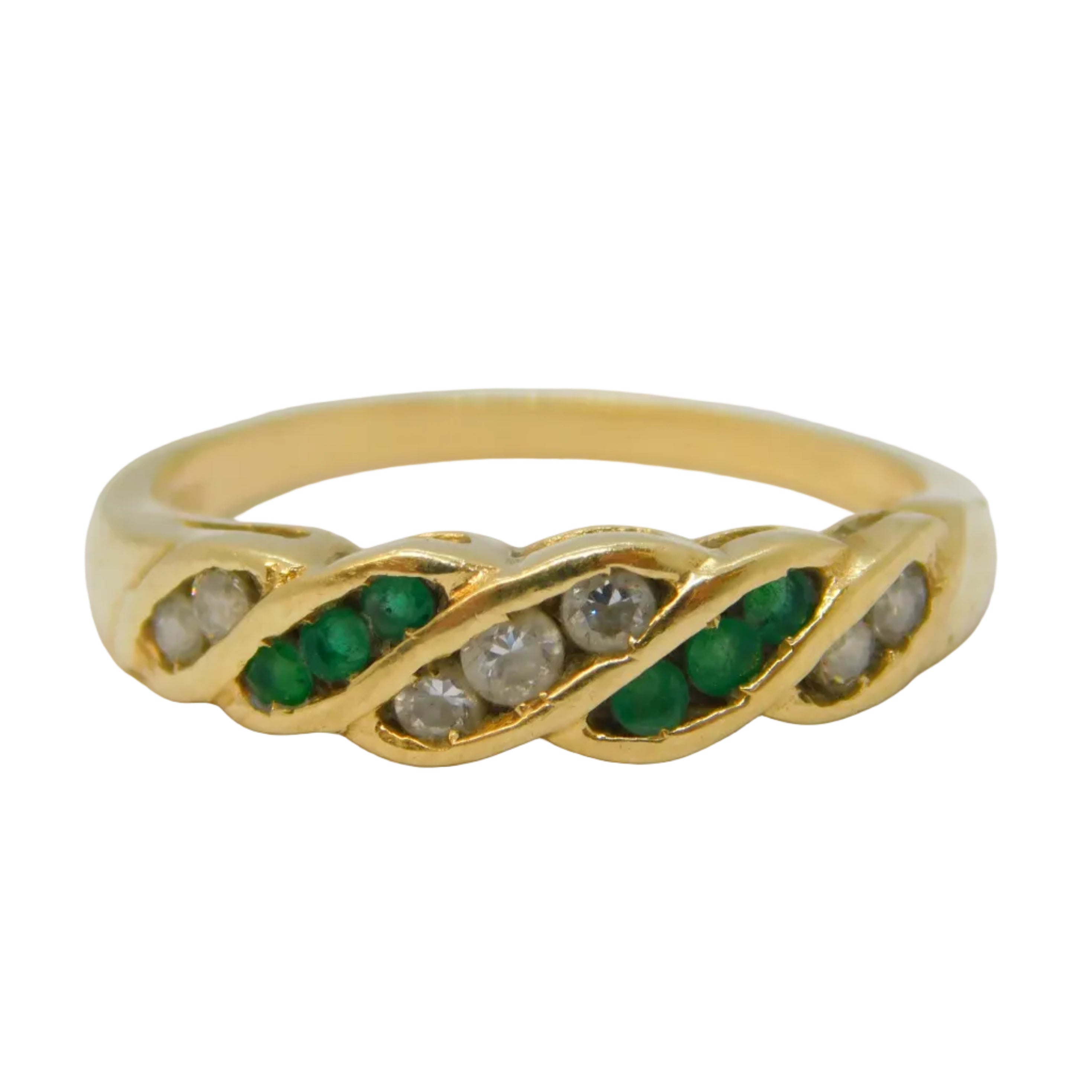 14ct Yellow Gold, Emerald & White Spinel Set Swirl Band Ring Vintage c1980