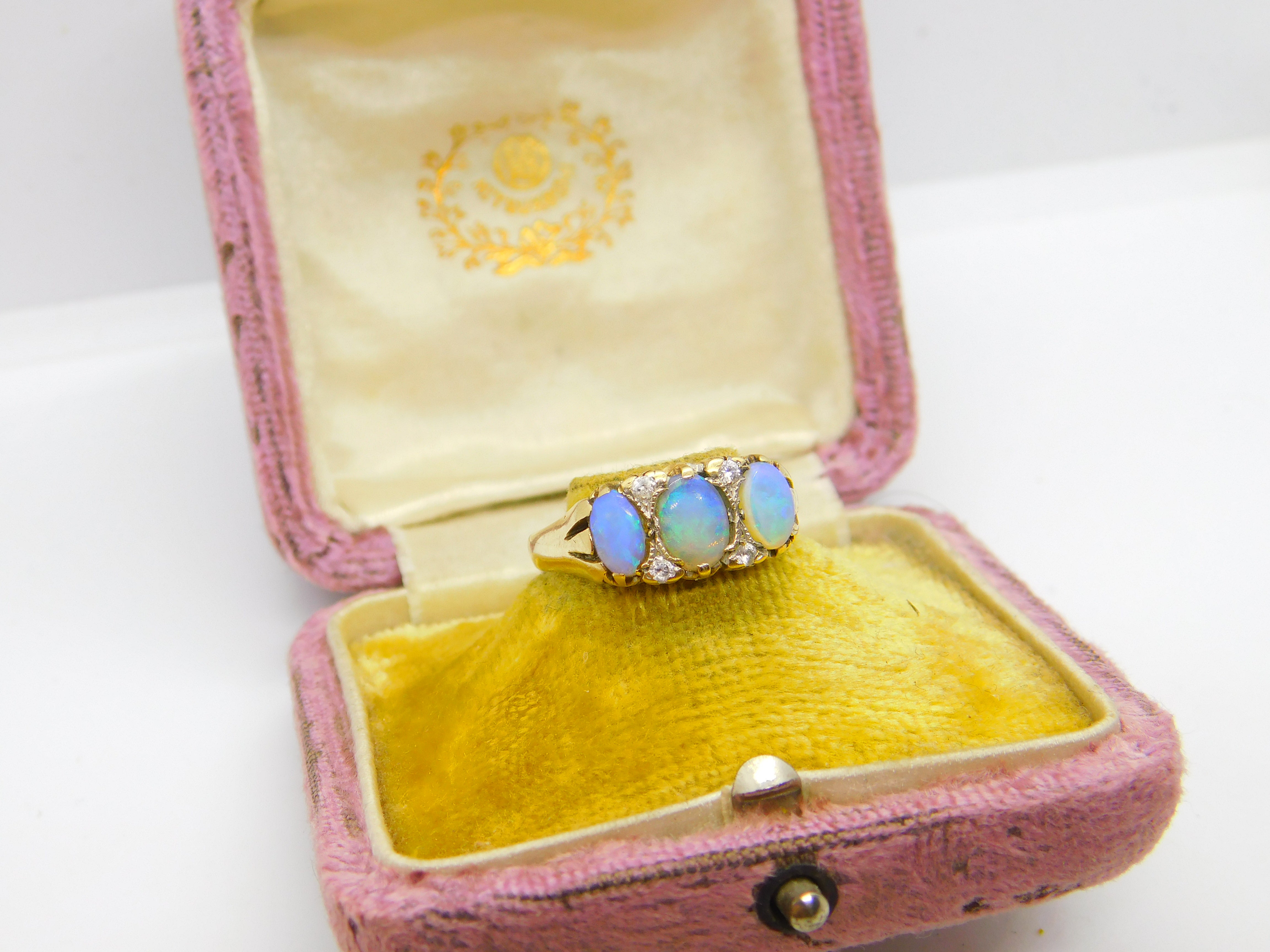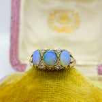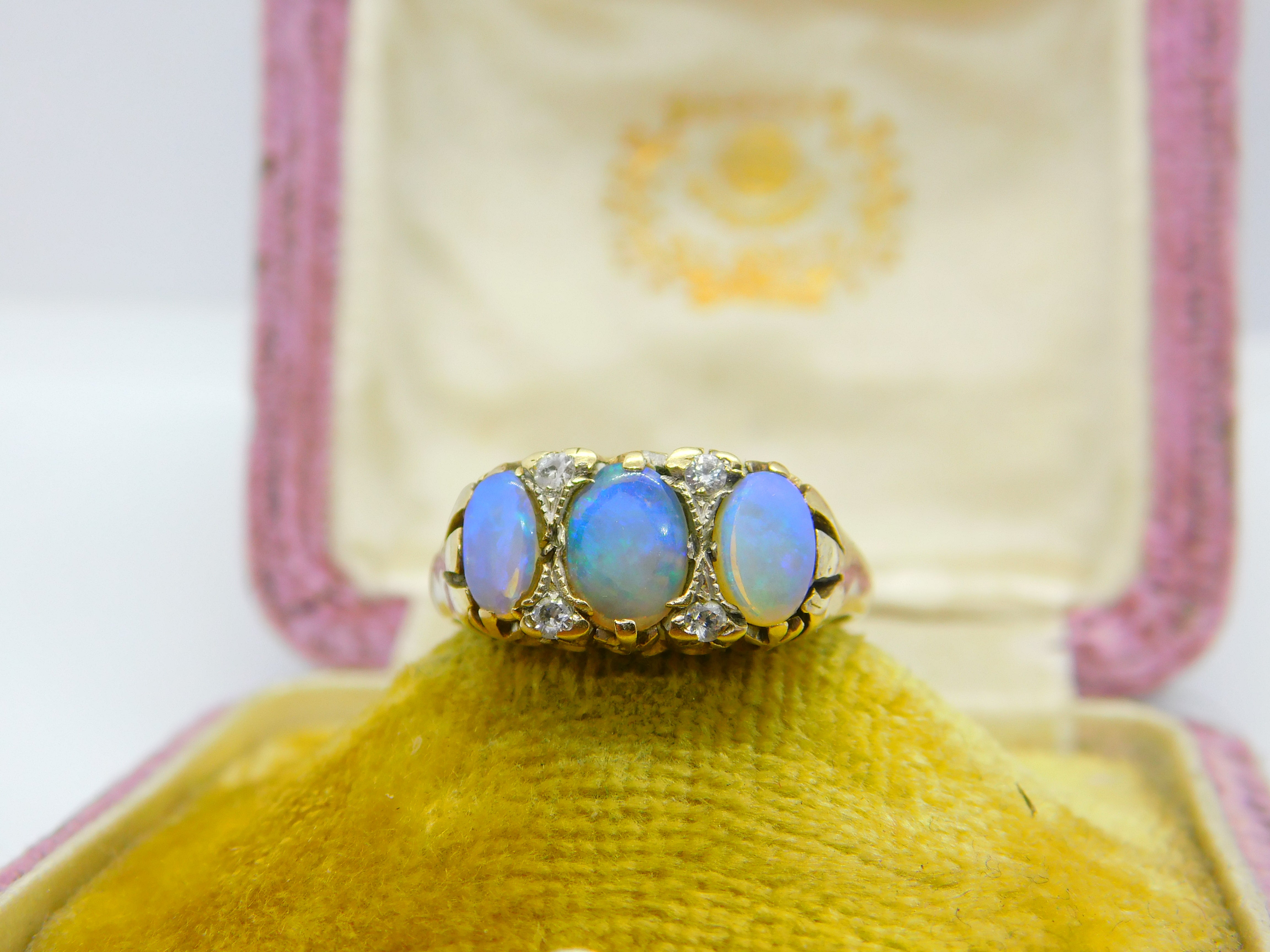 Details: A fantastic and wonderfully designed vintage 9ct yellow gold victorian style boat ring set with cabochon water opals surrounded by spinels hallmarked Birmingham 1962 to the interior band. This is a wonderful item that would make a perfect gift or addition to any collection. The BOX pictured is for PRESENTATION ONLY and is NOT included in the listings but used to frame the pictures unless specifically stated otherwise.