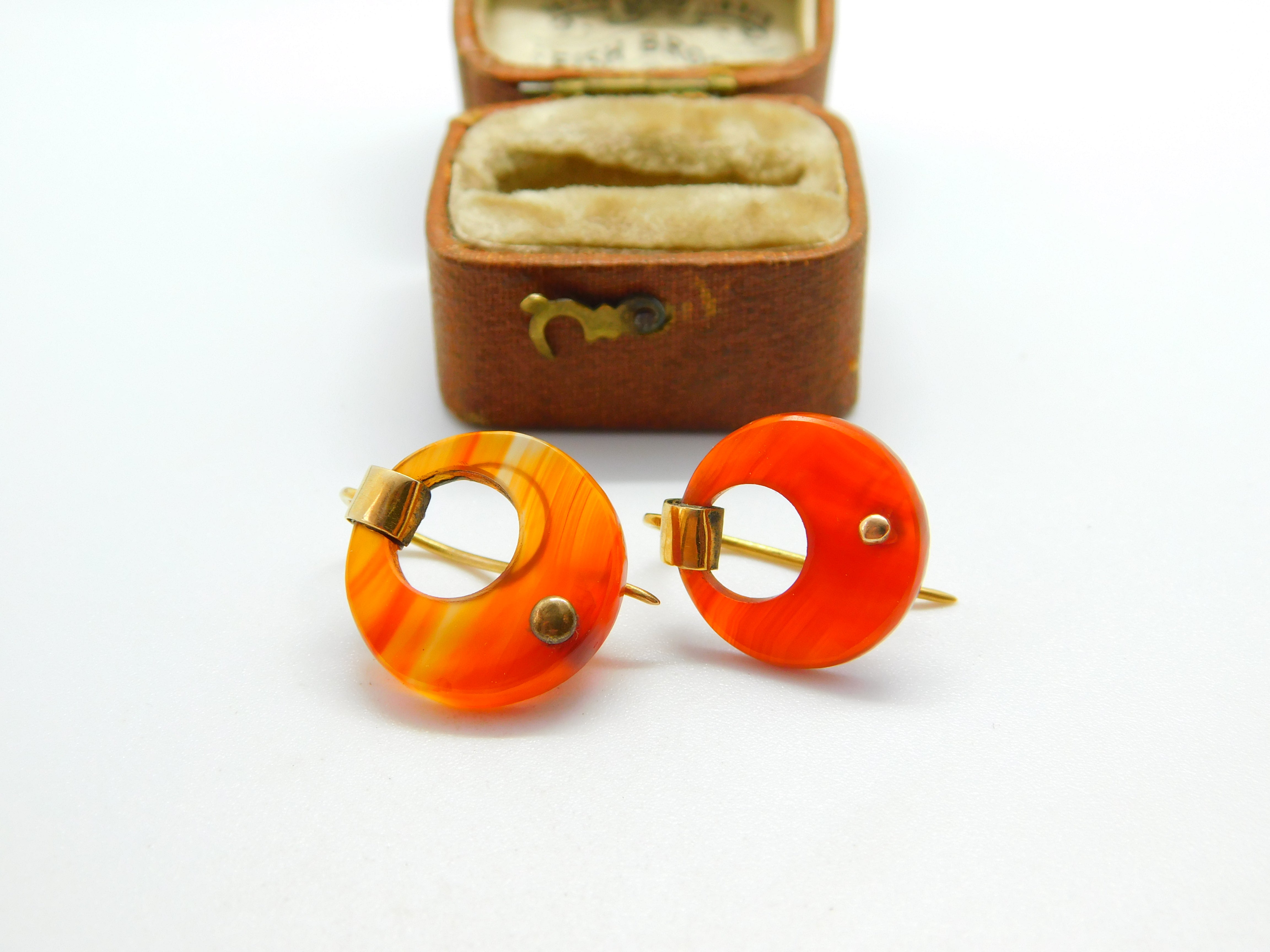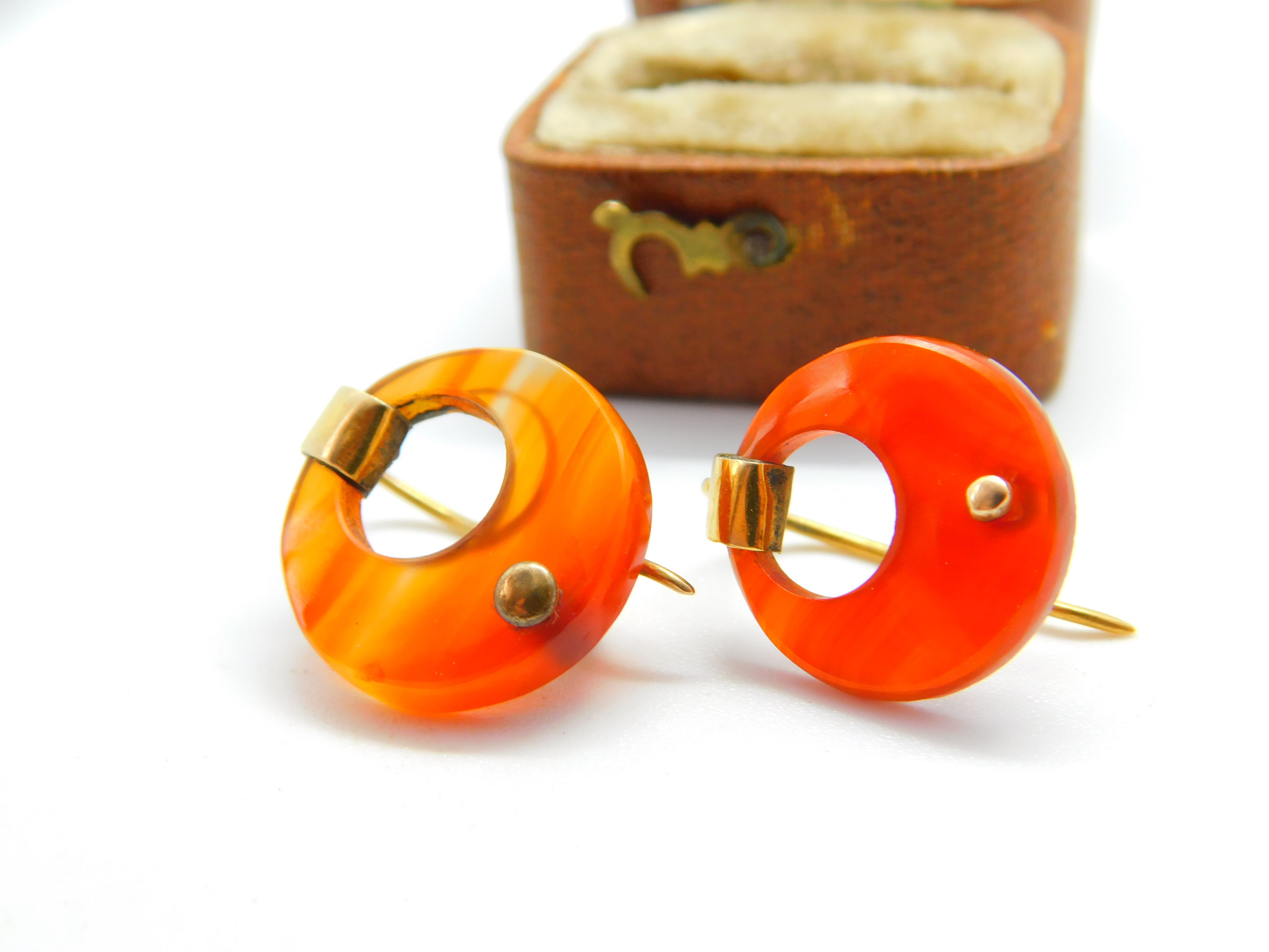 Details: A fantastic and wonderfully designed antique Victorian 14ct yellow gold hook earrings set with carved carnelian agate discs c1850, the gold has been XRF tested as it is unmarked. The clip to the left earrings is slightly loose but generally good. This is a wonderful item that would make a perfect gift or addition to any collection. The BOX pictured is for PRESENTATION ONLY and is NOT included in the listings but used to frame the pictures unless specifically stated otherwise.