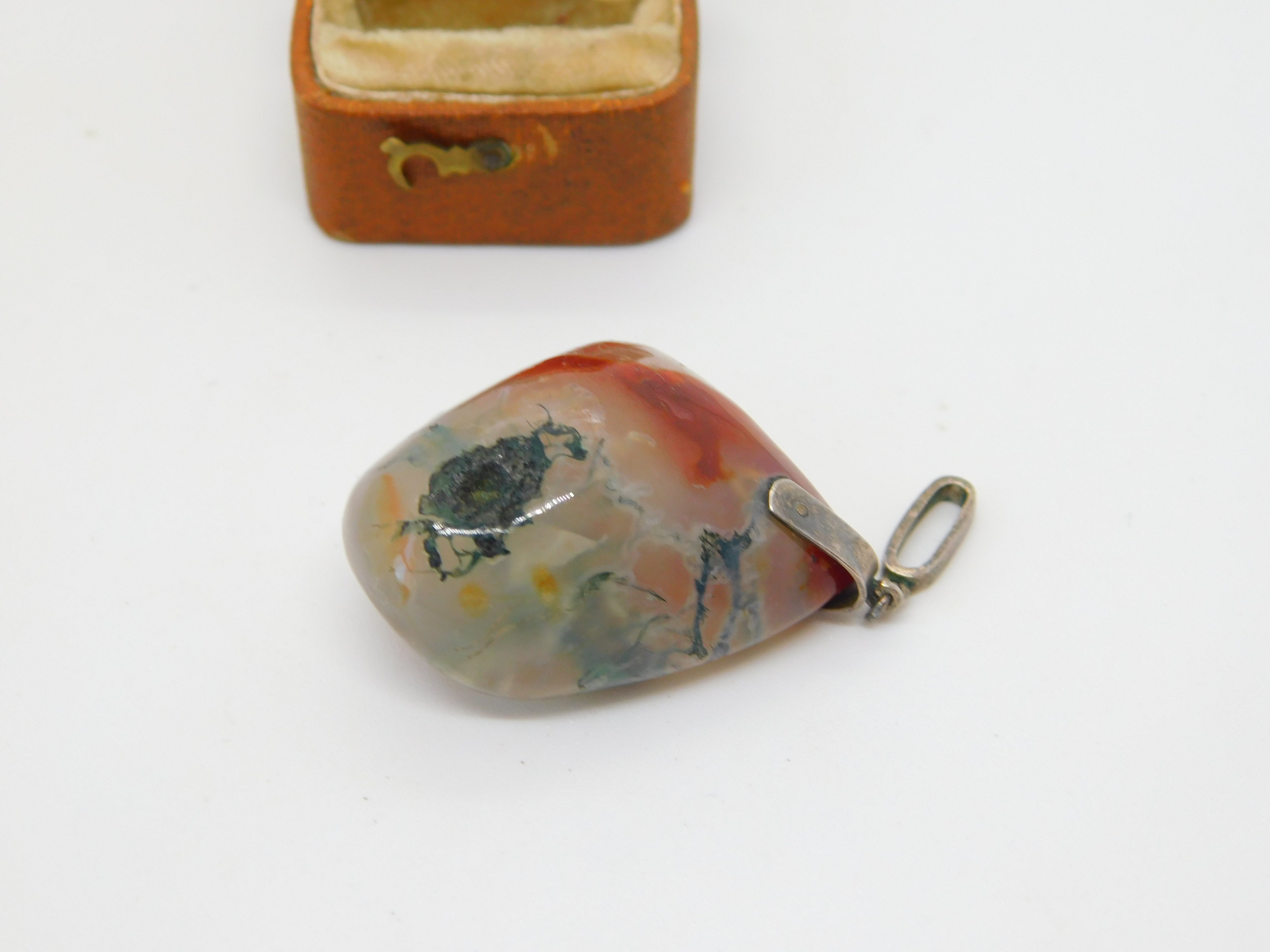 Large Victorian Sterling Silver Moss Agate Drop Pendant Antique c1880