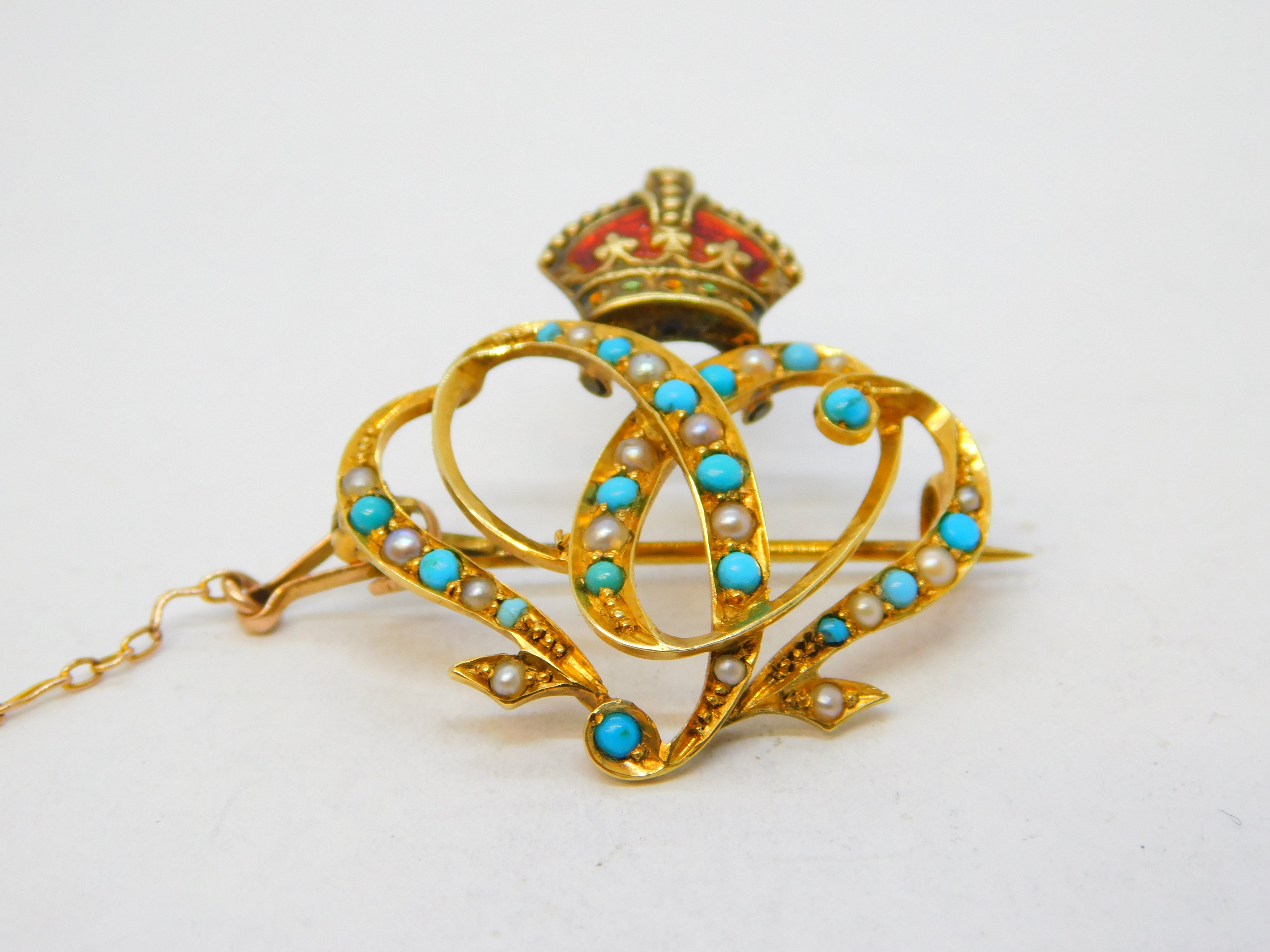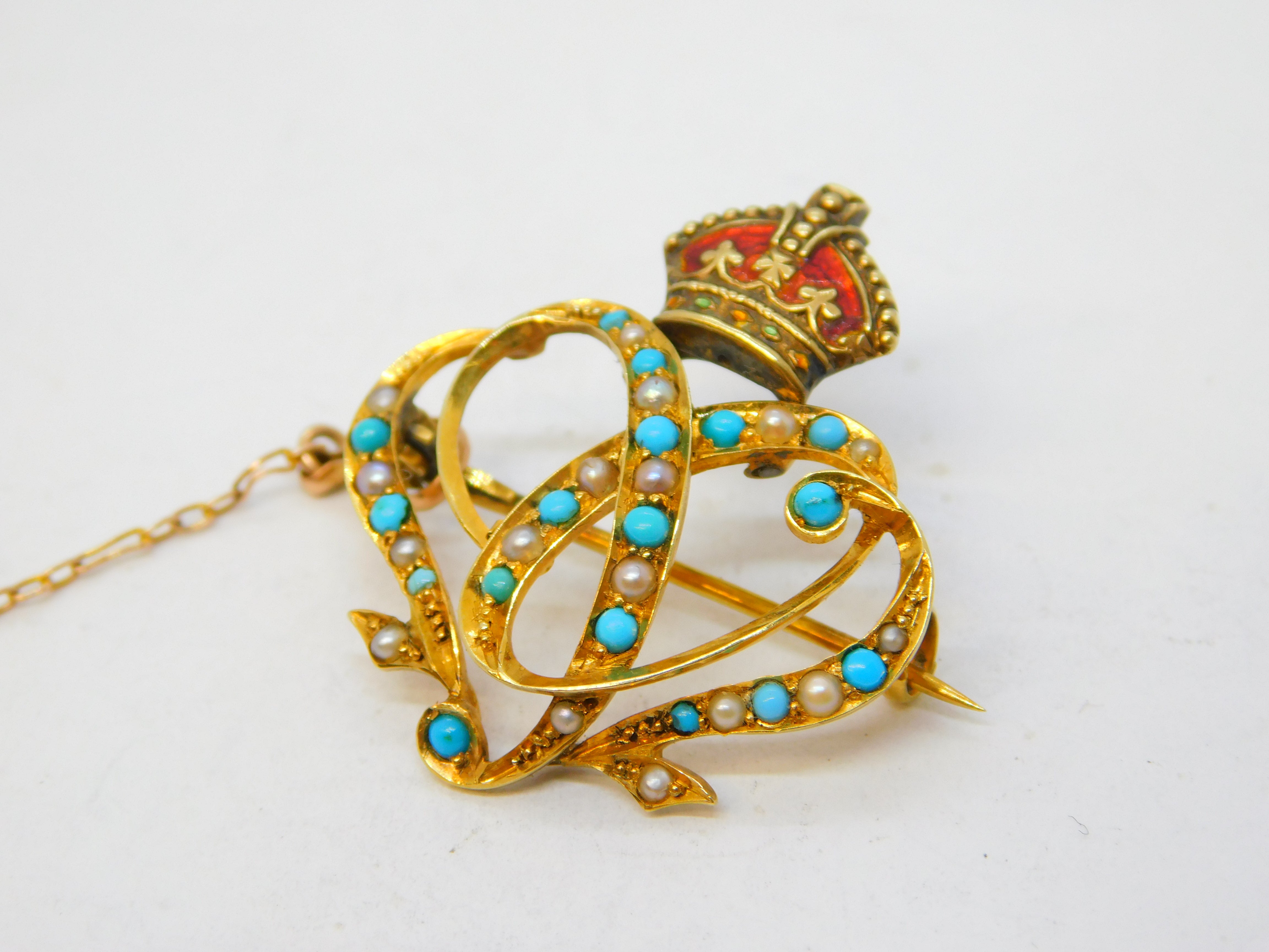 Details: A fantastic and wonderfully designed antique Victorian 15ct yellow gold, enamel, seed pearl & turquoise romantic sweetheart brooch with crown over love hearts c1880s, the gold has been XRF tested as it is unmarked. This is a wonderful item that would make a perfect gift or addition to any collection. We are more than happy to provide XRF reports for items upon request.
