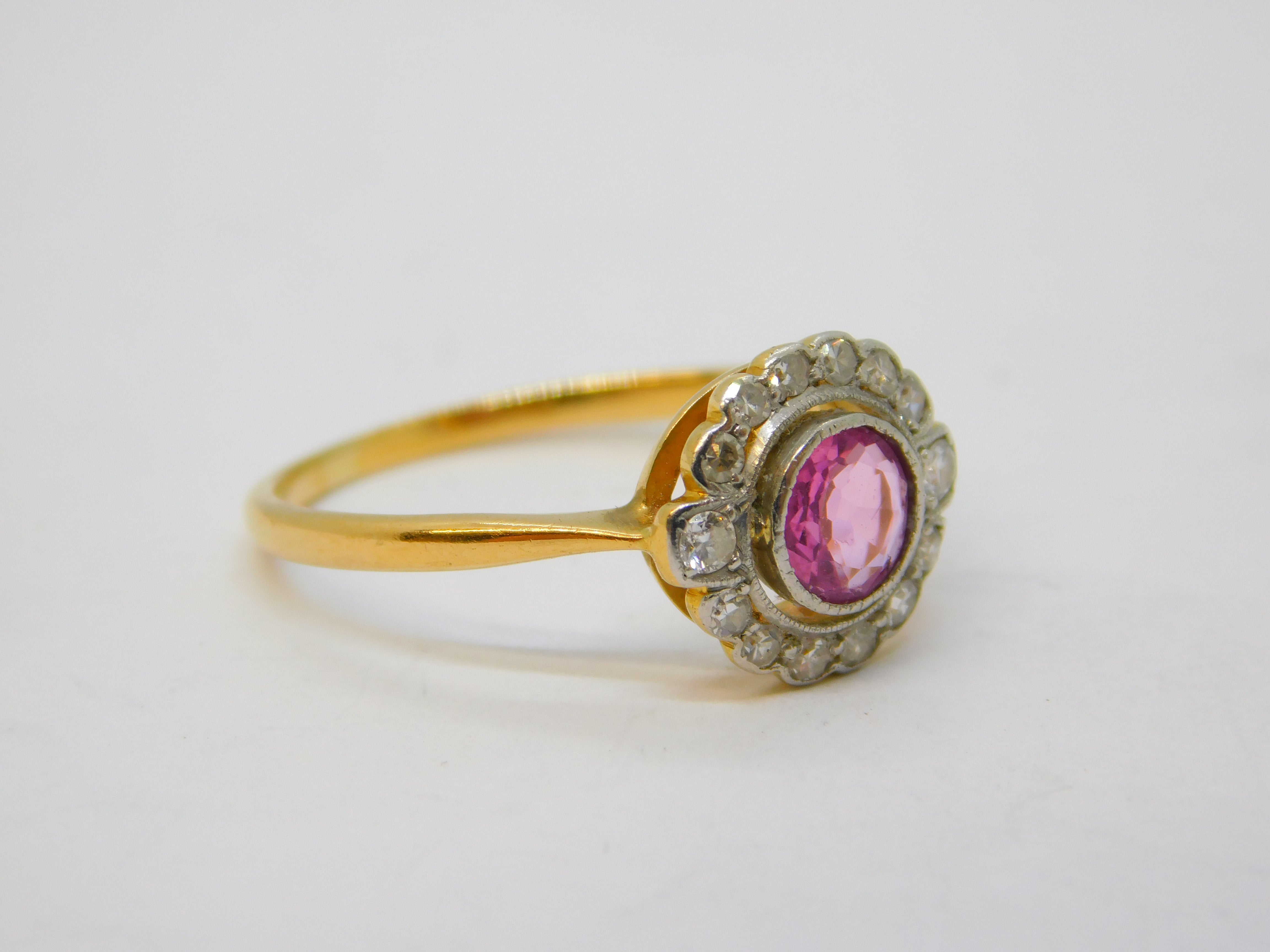 Details: A fantastic and wonderfully designed antique late-Victorian 18ct yellow gold floral cluster engagement ring set with brilliant cut 0.5ct natural pink sapphire flanked by old-cut diamonds c1880s. The gold has been XRF tested as it is unmarked. The central sapphire is unheated and presents with excellent clarity and colour. This is a wonderful item that would make a perfect gift or addition to any collection. We are more than happy to provide XRF reports for items upon request.