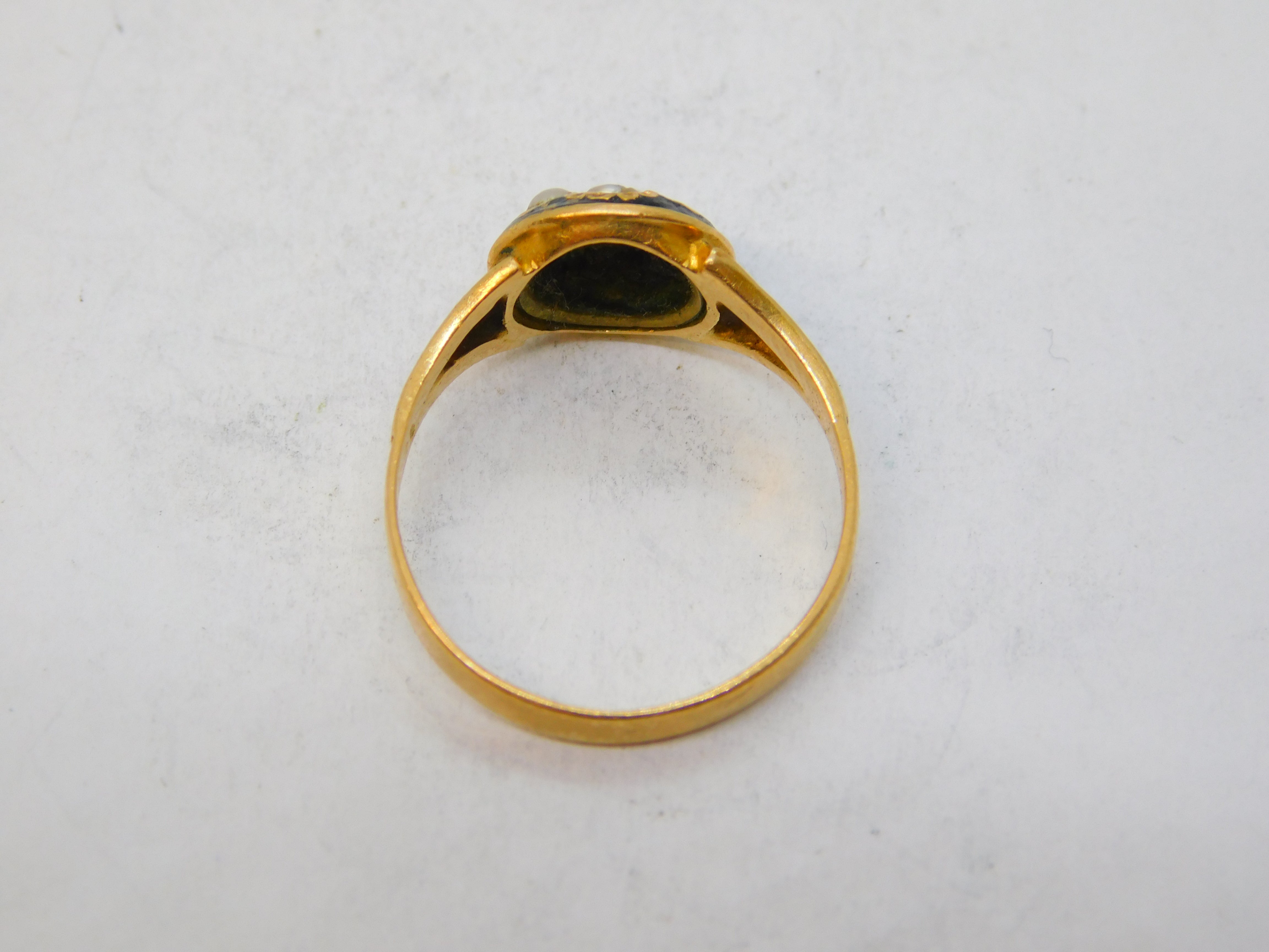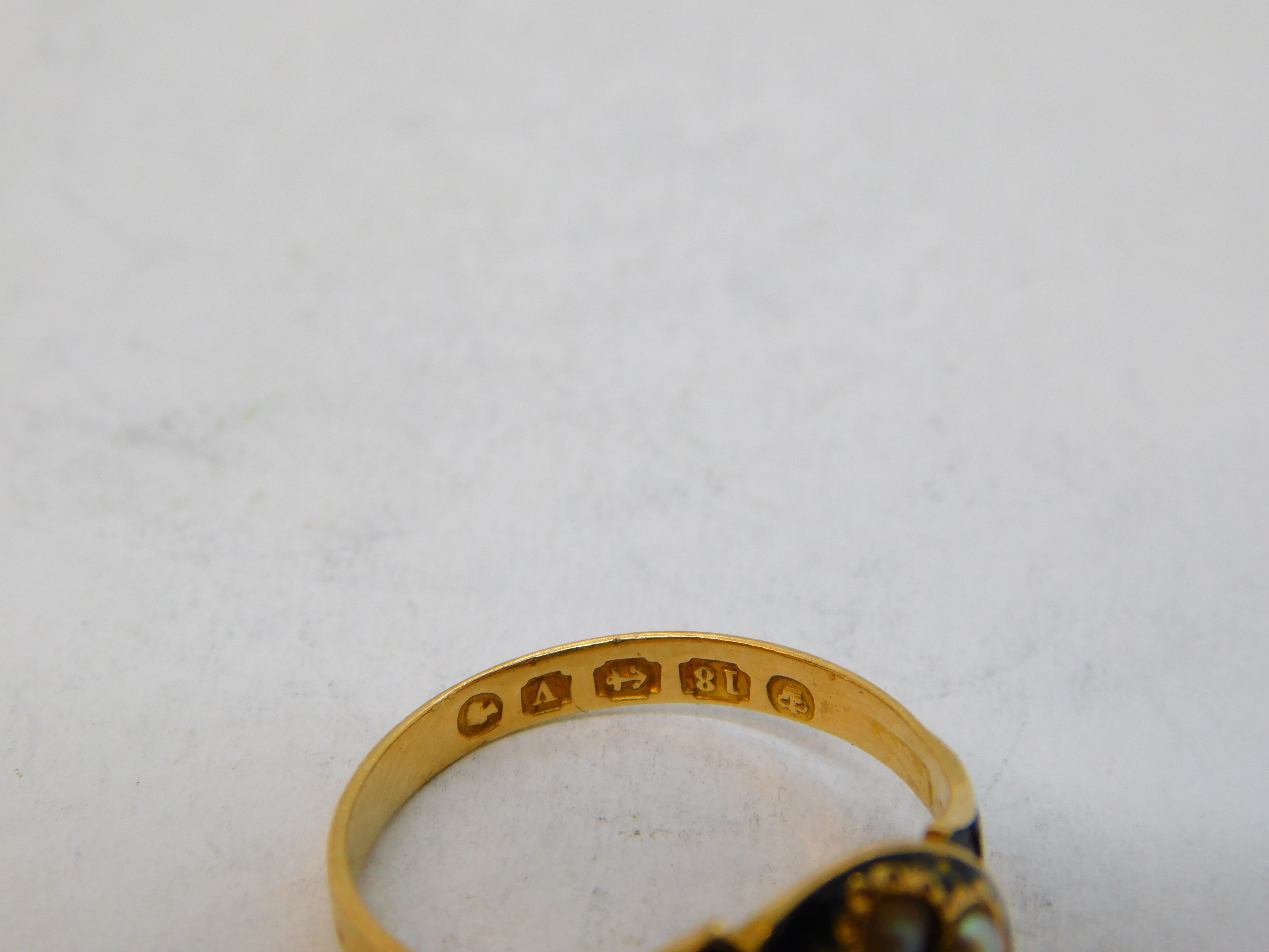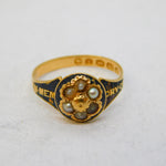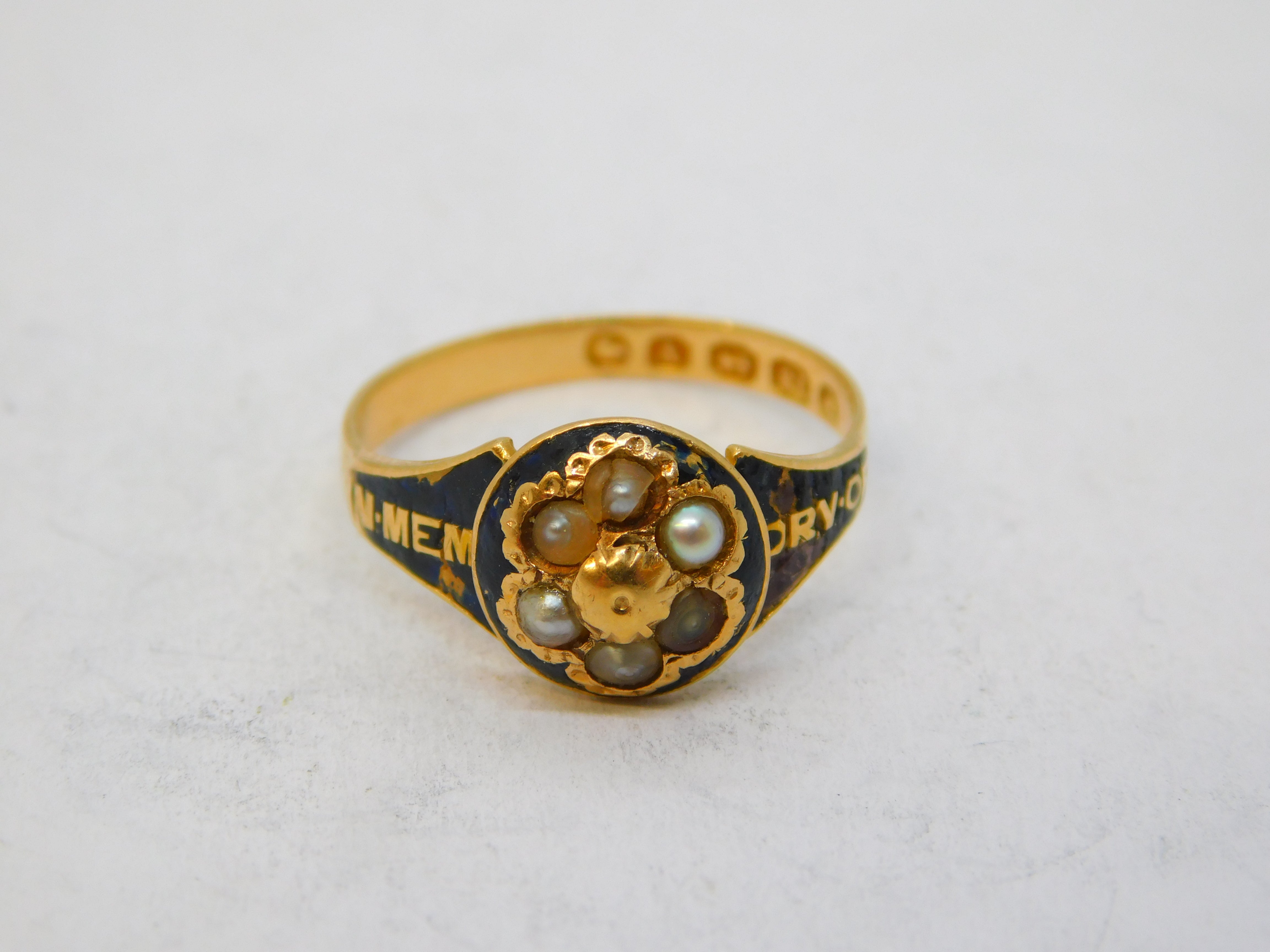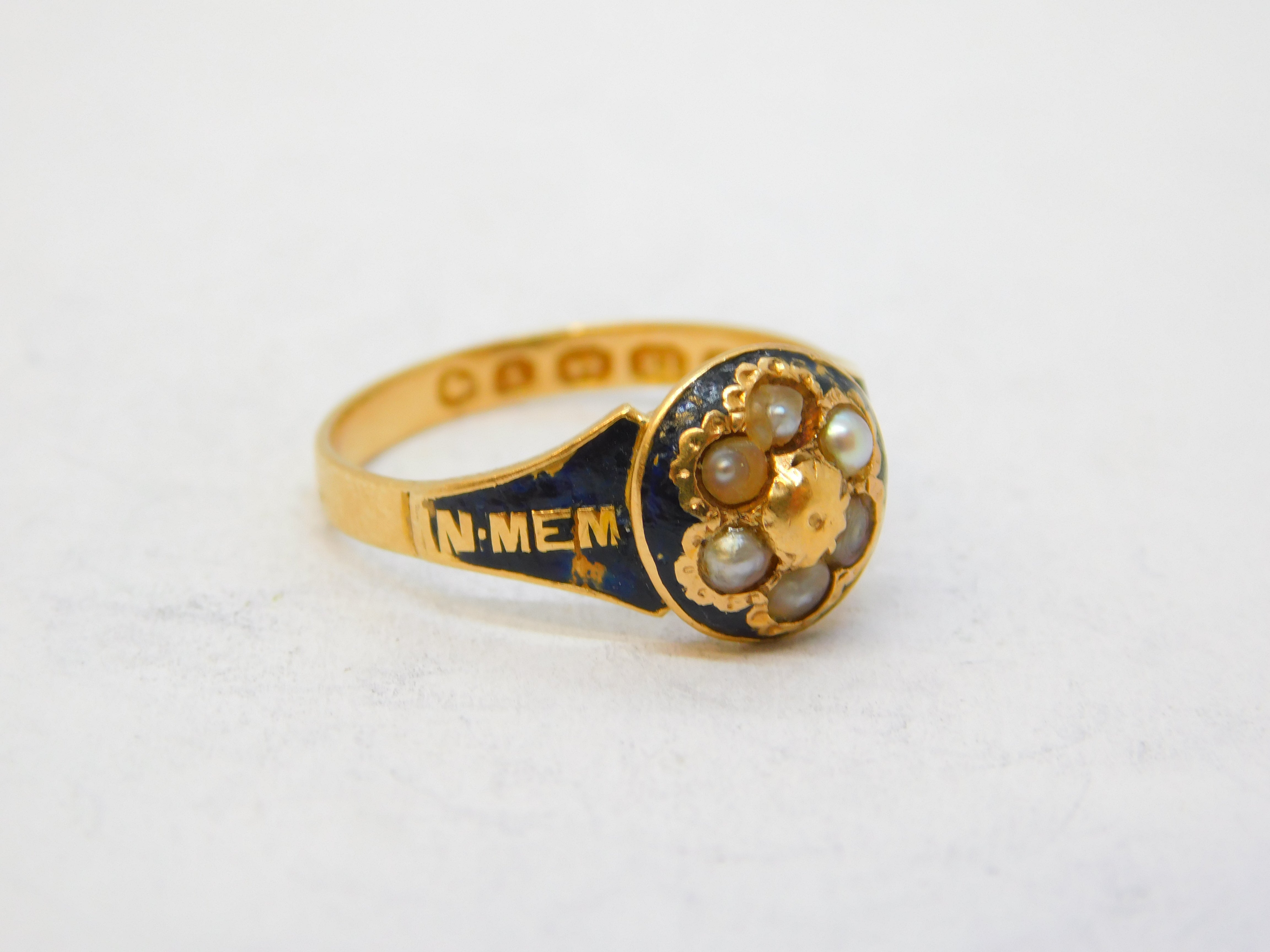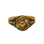 Details: A fantastic and wonderfully designed antique mid-Victorian 18ct yellow gold mourning ring with black enamel decoration reading 'In Memory Of' flanking the central seed pearl set floral cluster clearly hallmarked Birmingham 1870 to the interior. The pearls are worn and could be replaced. This is a wonderful item that would make a perfect gift or addition to any collection. We are more than happy to provide XRF reports for items upon request.