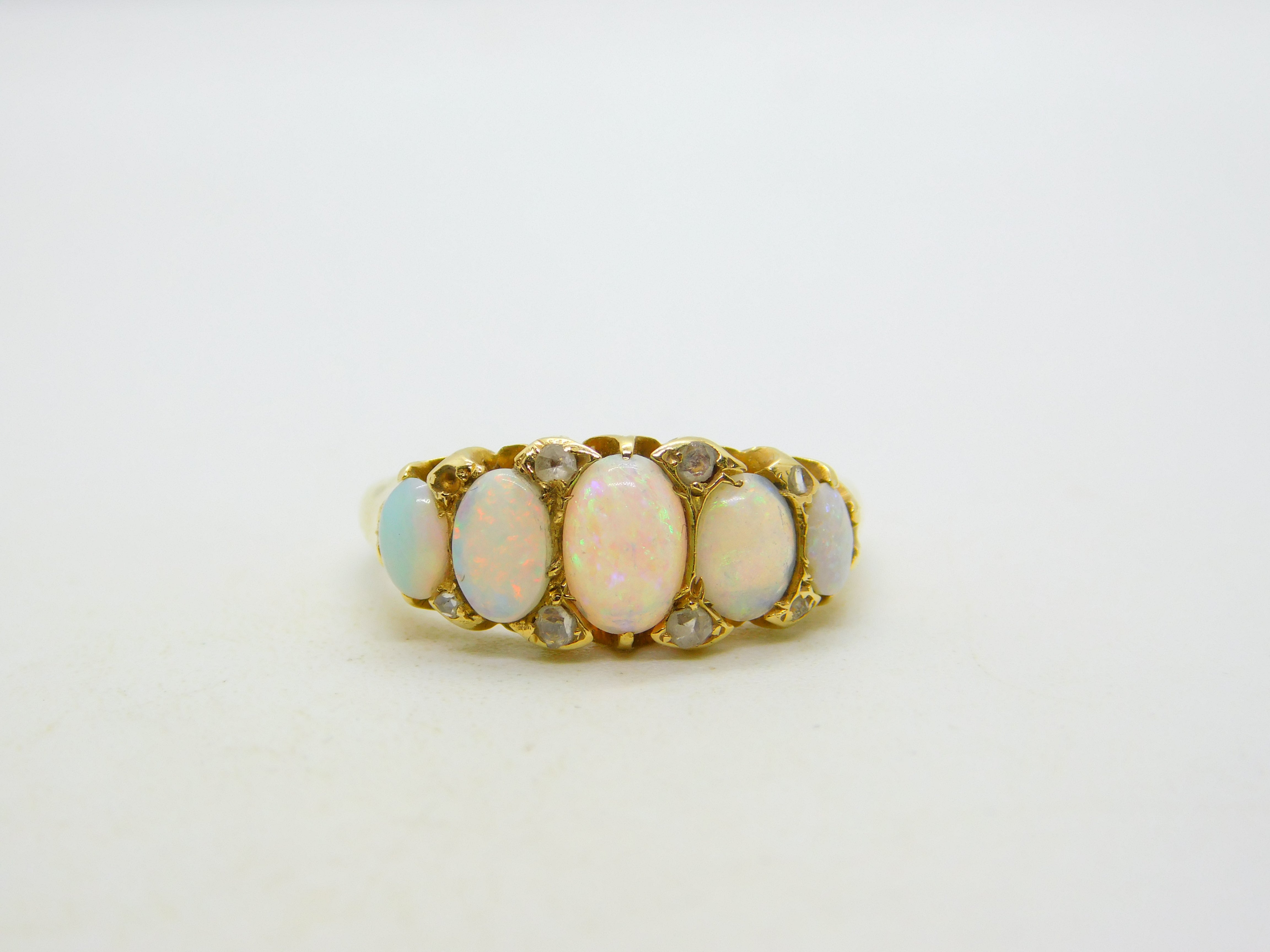 Details: A fantastic and wonderfully designed antique Victorian 18ct yellow gold boat ring set with five graduating cabochon cut opals flanked with old-cut diamonds, hallmarked Birmingham c1880 to the interior very rubbed marks, the gold has been XRF tested, the stones have been tested. This is a wonderful item that would make a perfect gift or addition to any collection.