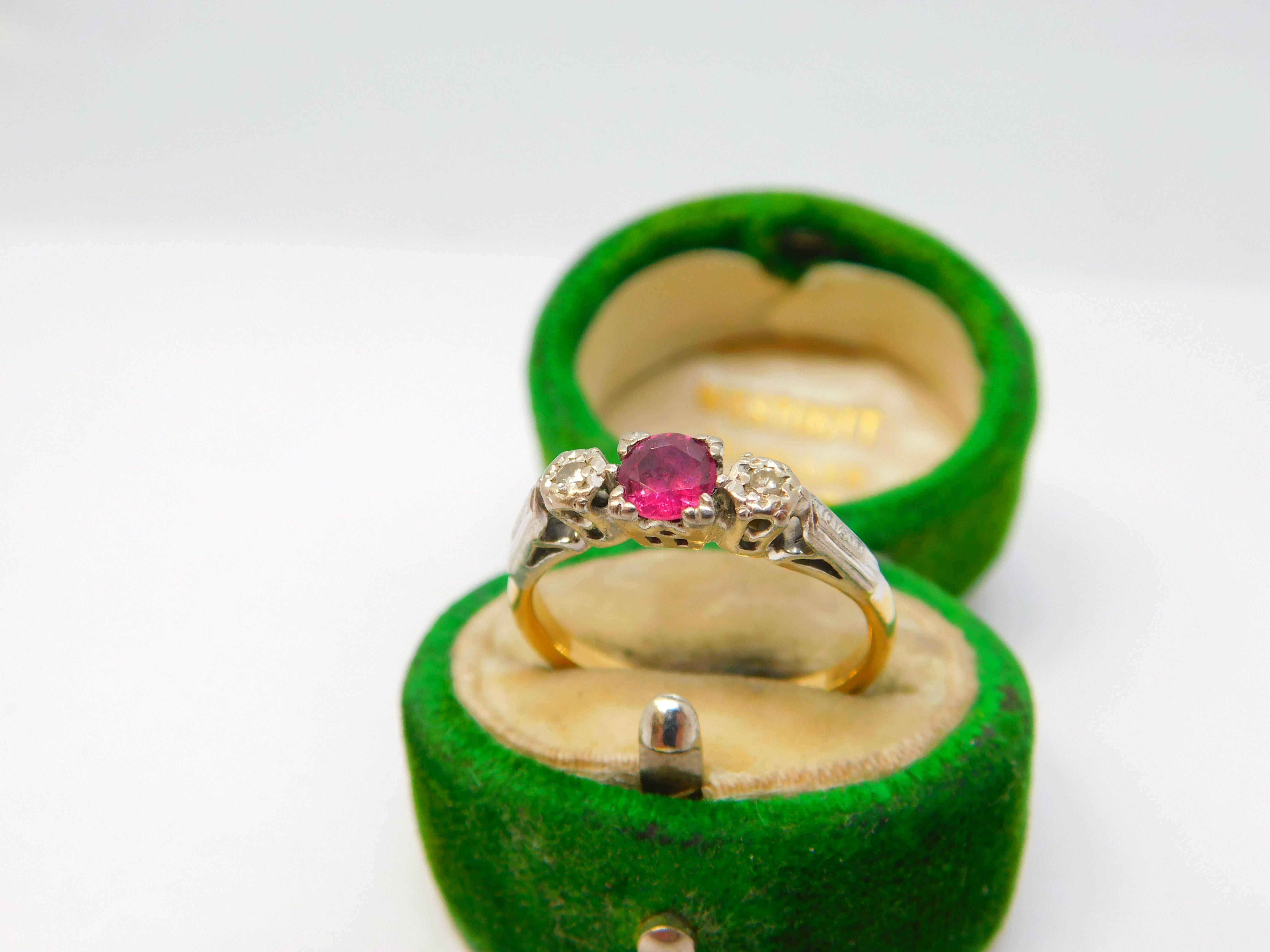 Details: A fantastic and wonderfully designed antique Victorian 18ct yellow gold dress ring set with central 0.2ct ruby flanked with two smaller diamonds hallmarked to the interior c1890, the stones have been tested. This is a wonderful item that would make a perfect gift or addition to any collection. The BOX pictured is for PRESENTATION ONLY and is NOT included in the listings but used to frame the pictures unless specifically stated otherwise.