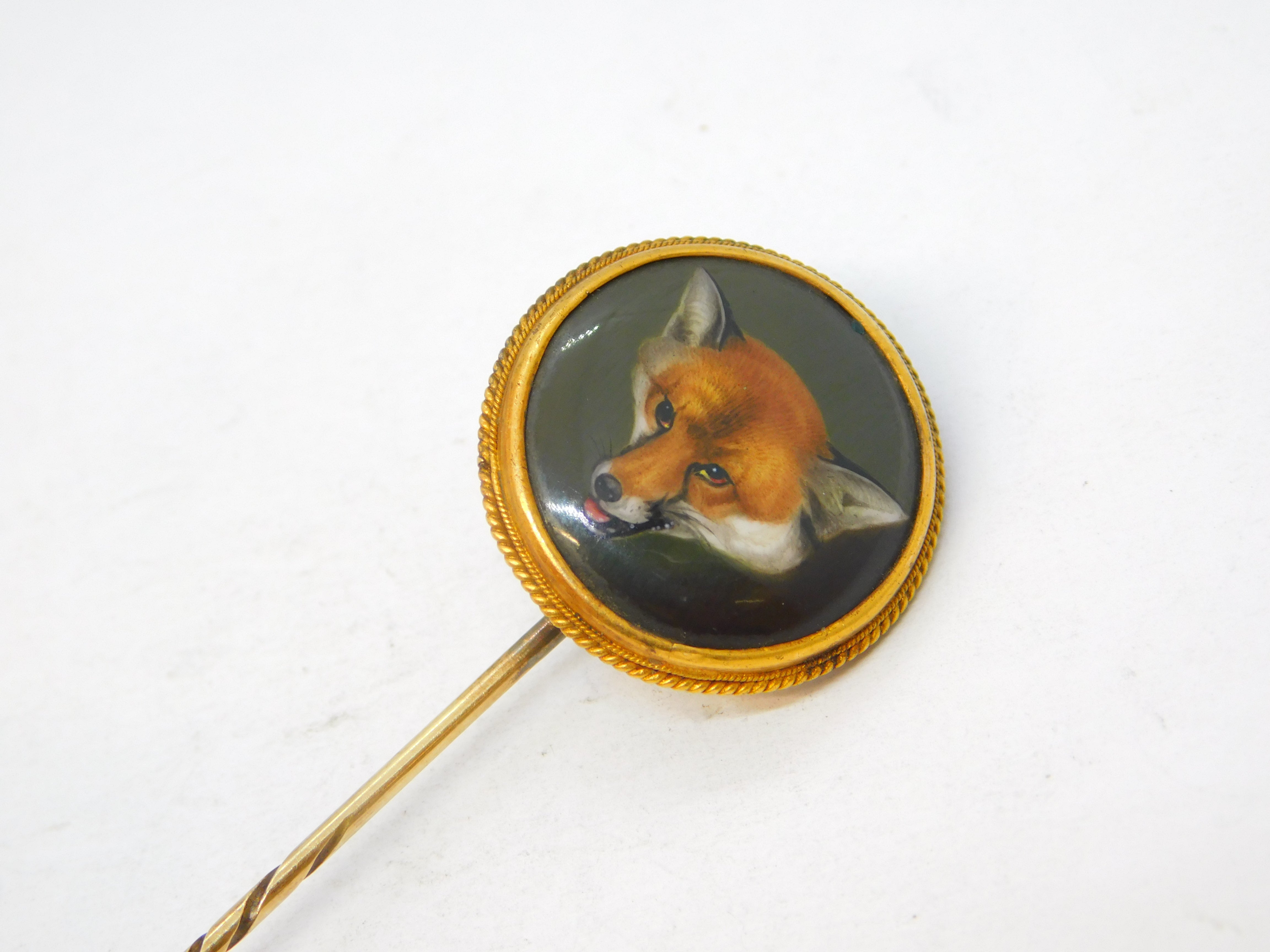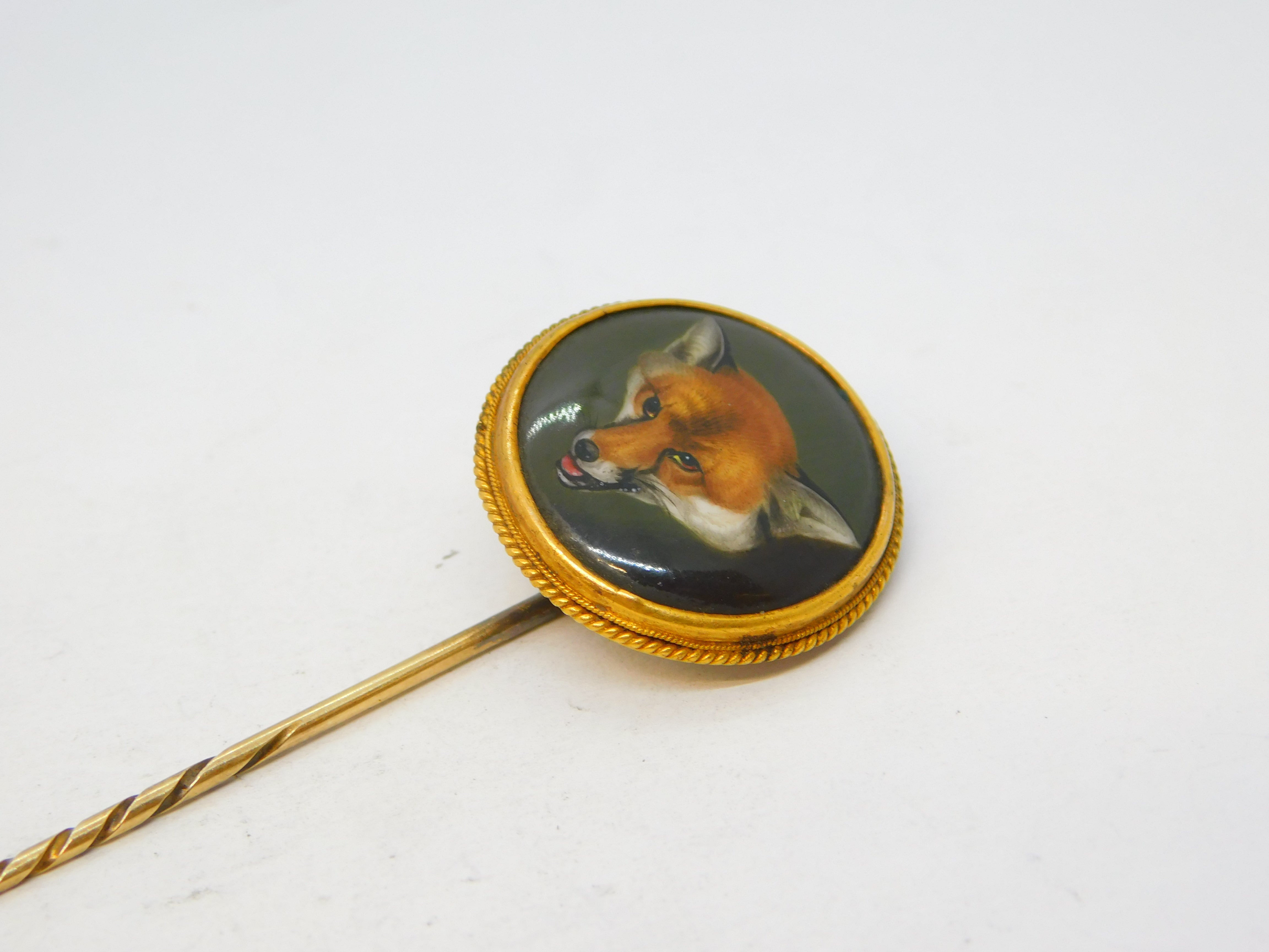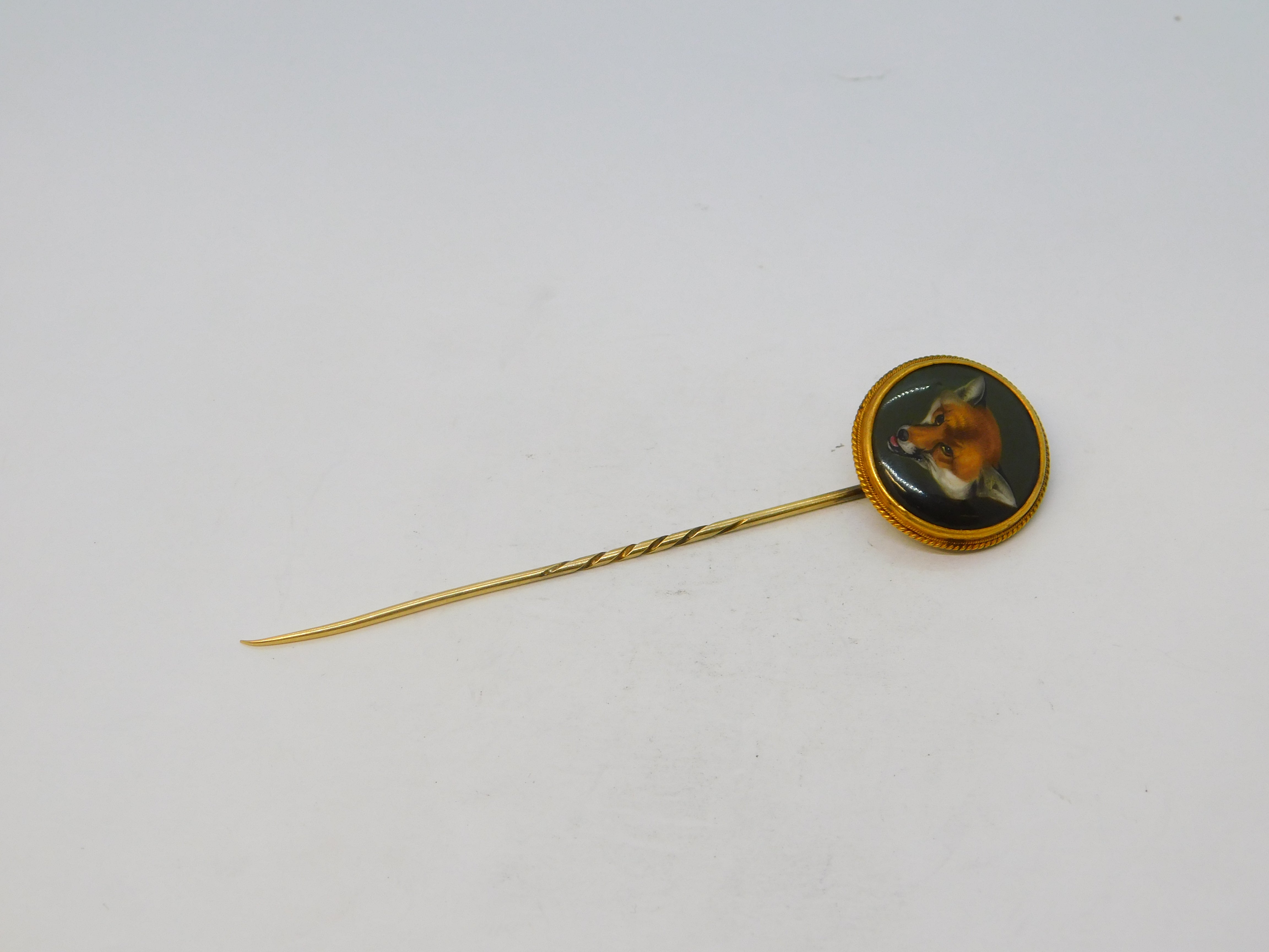 Details: A fantastic and wonderfully designed antique mid-Victorian large 18ct yellow gold mounted stick pin set with stunning enamel terminal in the form of a fox head or mask with lovely detailing, the gold has been XRF tested as it is unmarked - the top is 18ct and the pin is 9ct. This is a wonderful item that would make a perfect gift or addition to any collection.