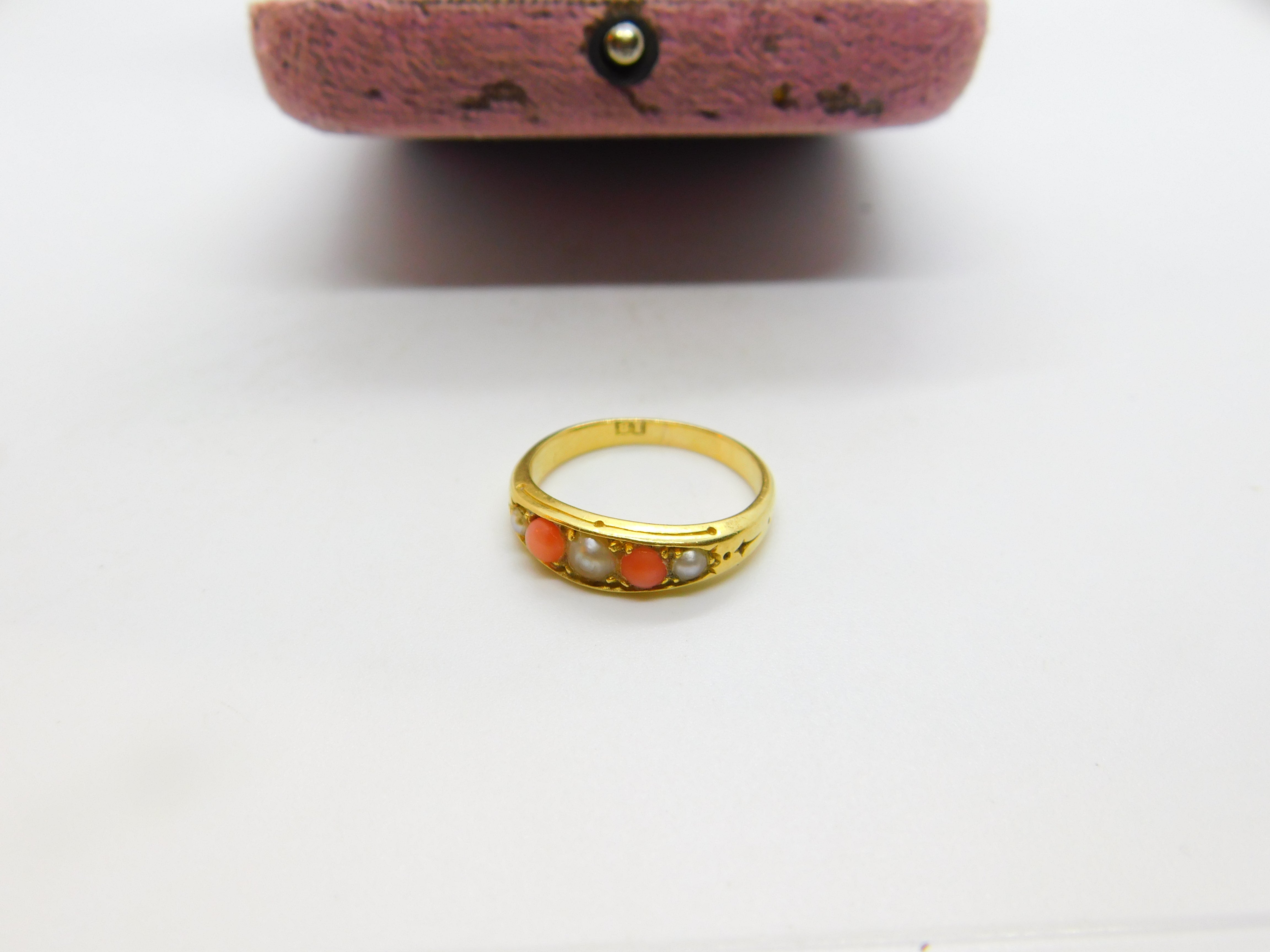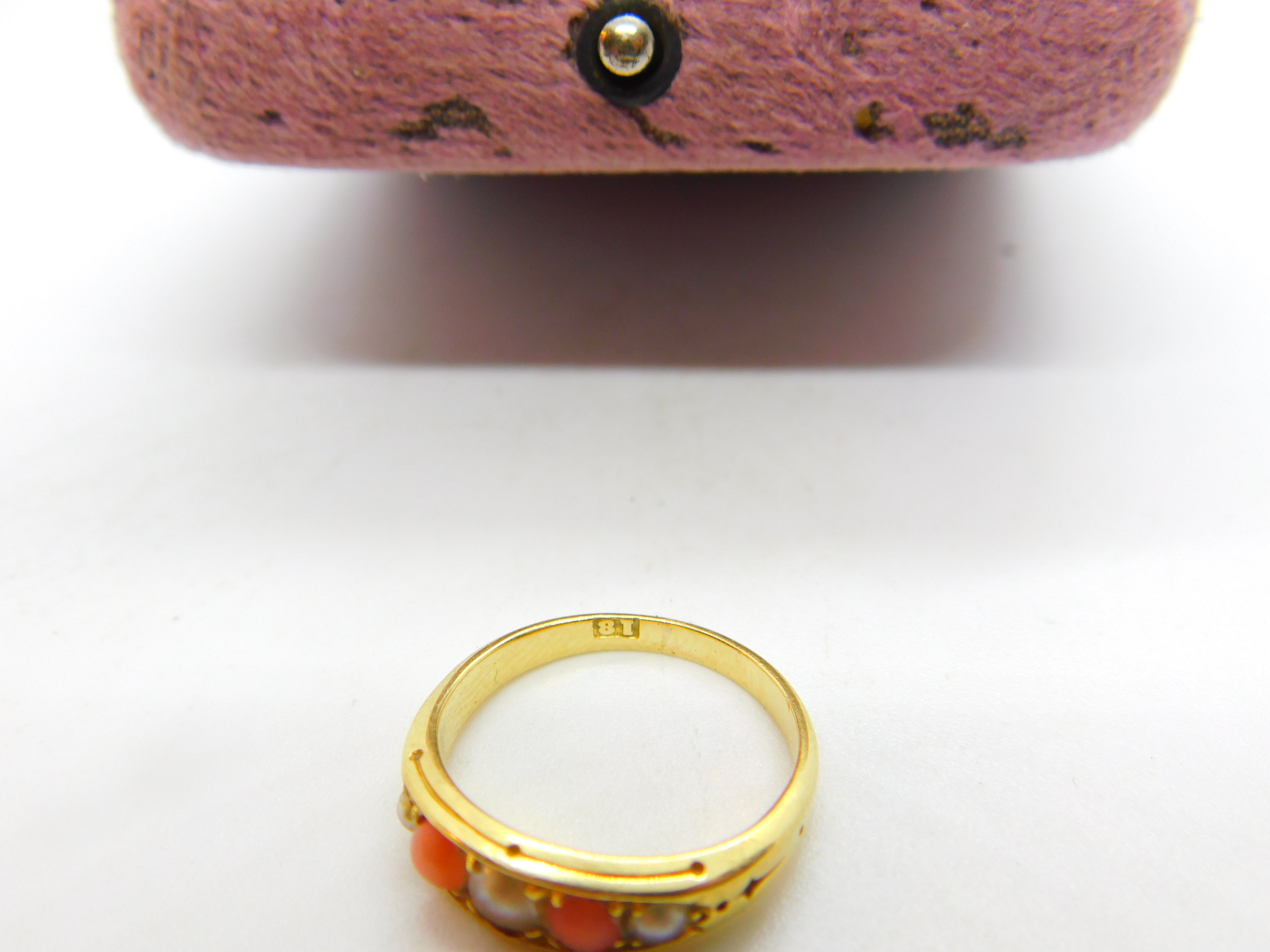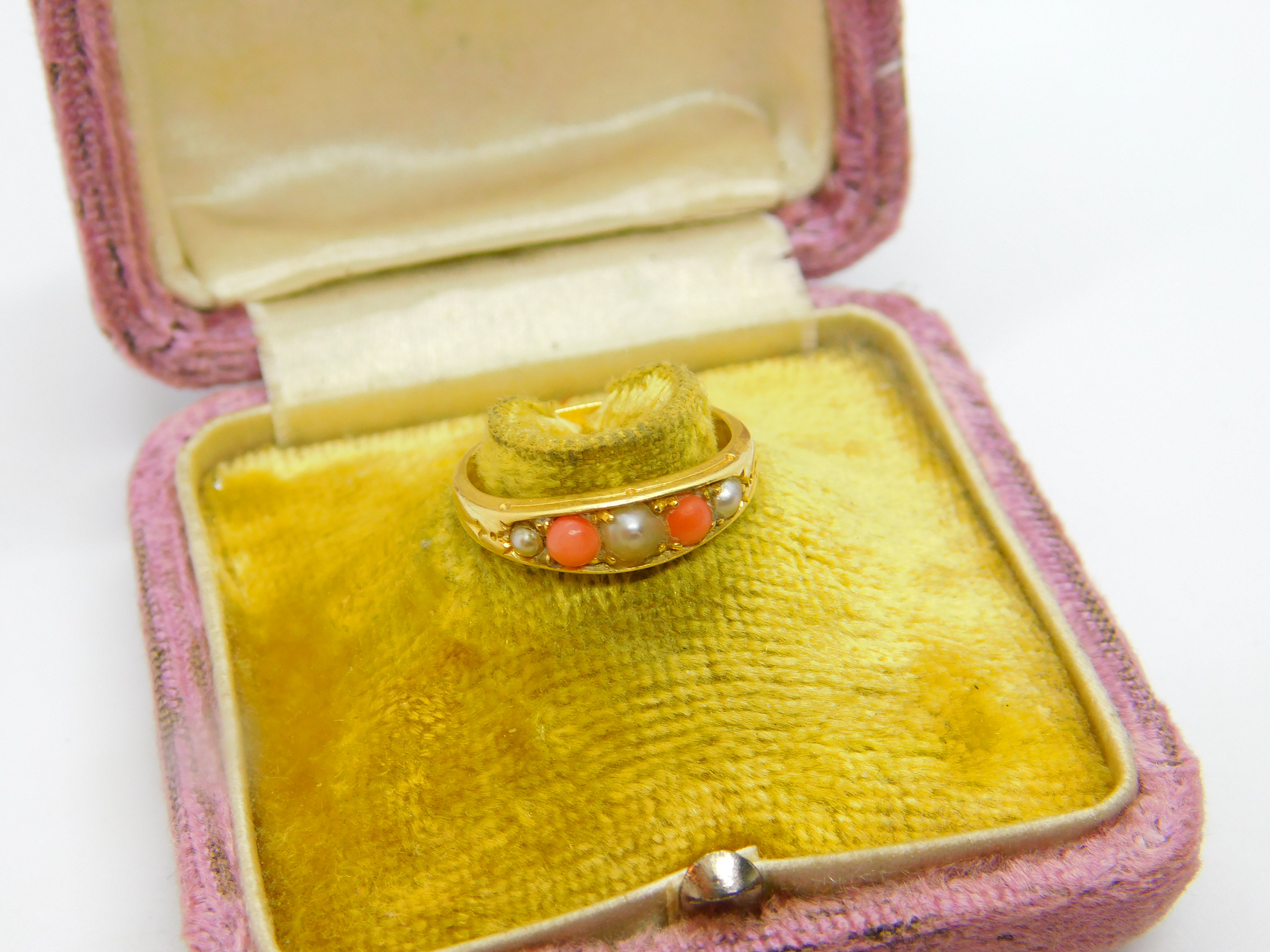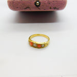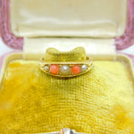 Victorian 18ct Yellow Gold, Red Coral & Seed Pearl Boat Ring c1880 Antique