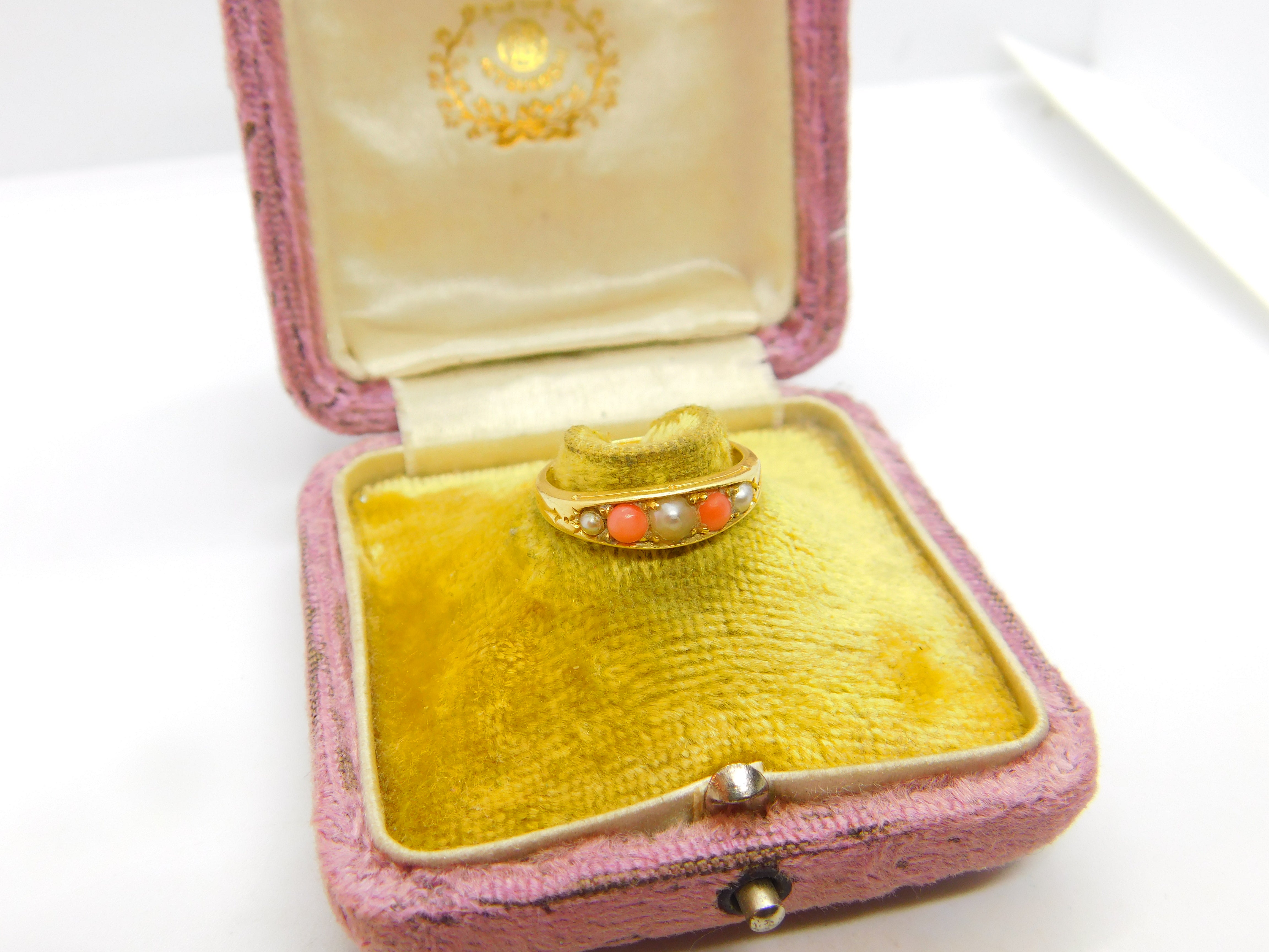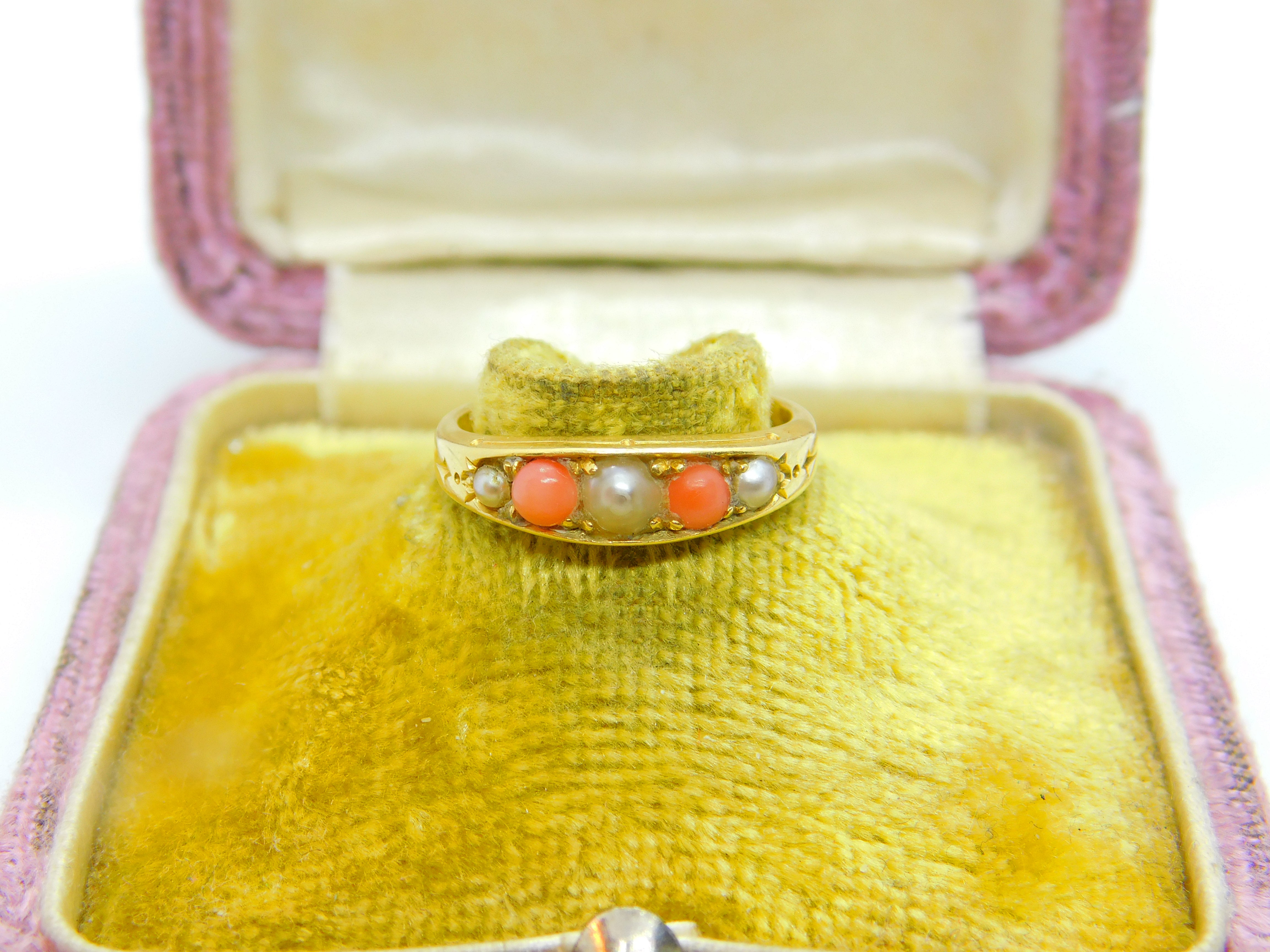 Details: A fantastic and wonderfully designed antique Victorian 18ct yellow gold boat ring set with seed pearl & natural coral hallmarked '18' to the interior and XRF tested c1880. A gorgeous example. This is a wonderful item that would make a perfect gift or addition to any collection. The BOX pictured is for PRESENTATION ONLY and is NOT included in the listings but used to frame the pictures unless specifically stated otherwise.