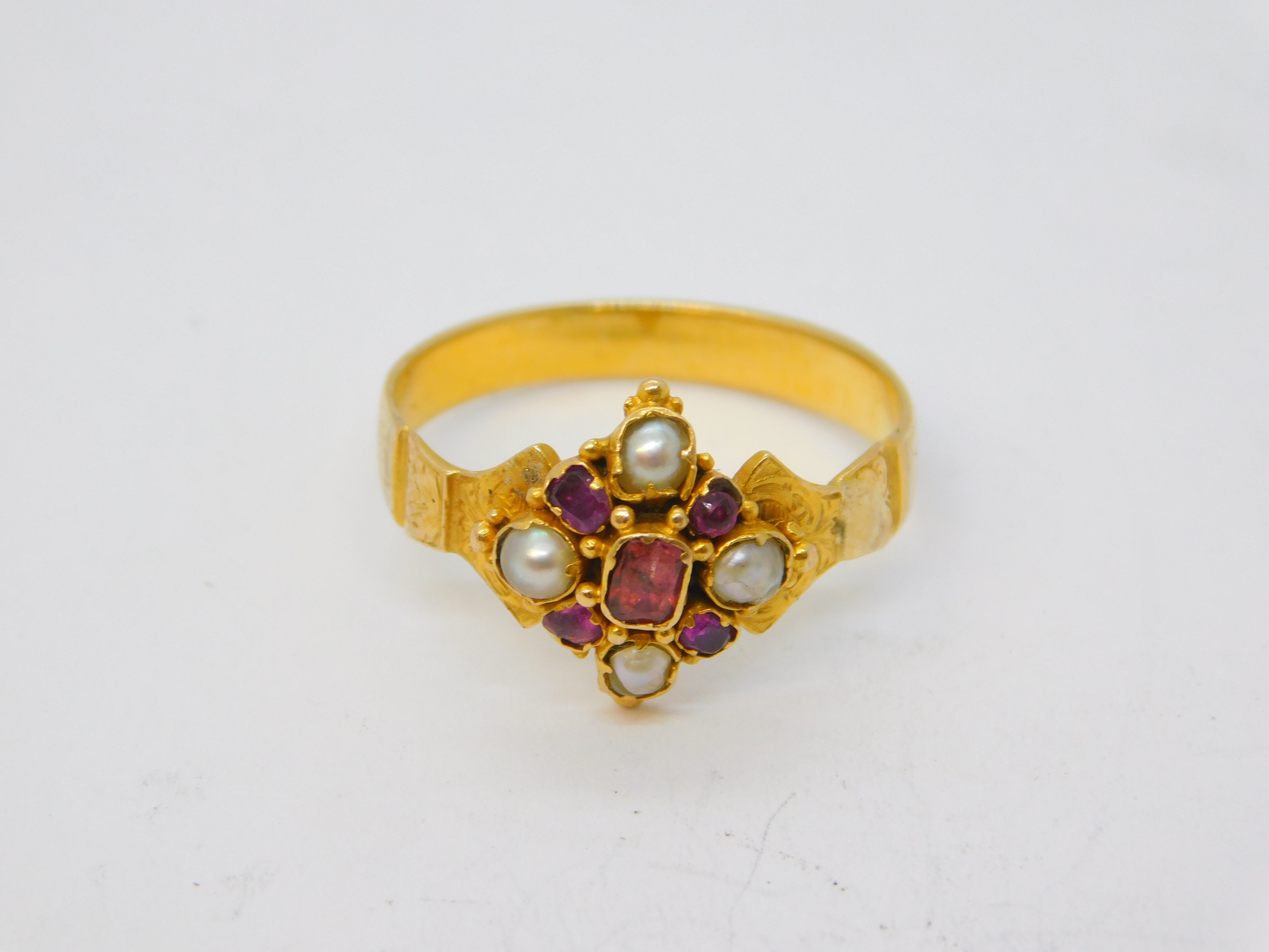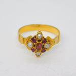 Victorian 18ct Yellow Gold, Ruby & Pearl Set Floral Dress Ring Antique c1860