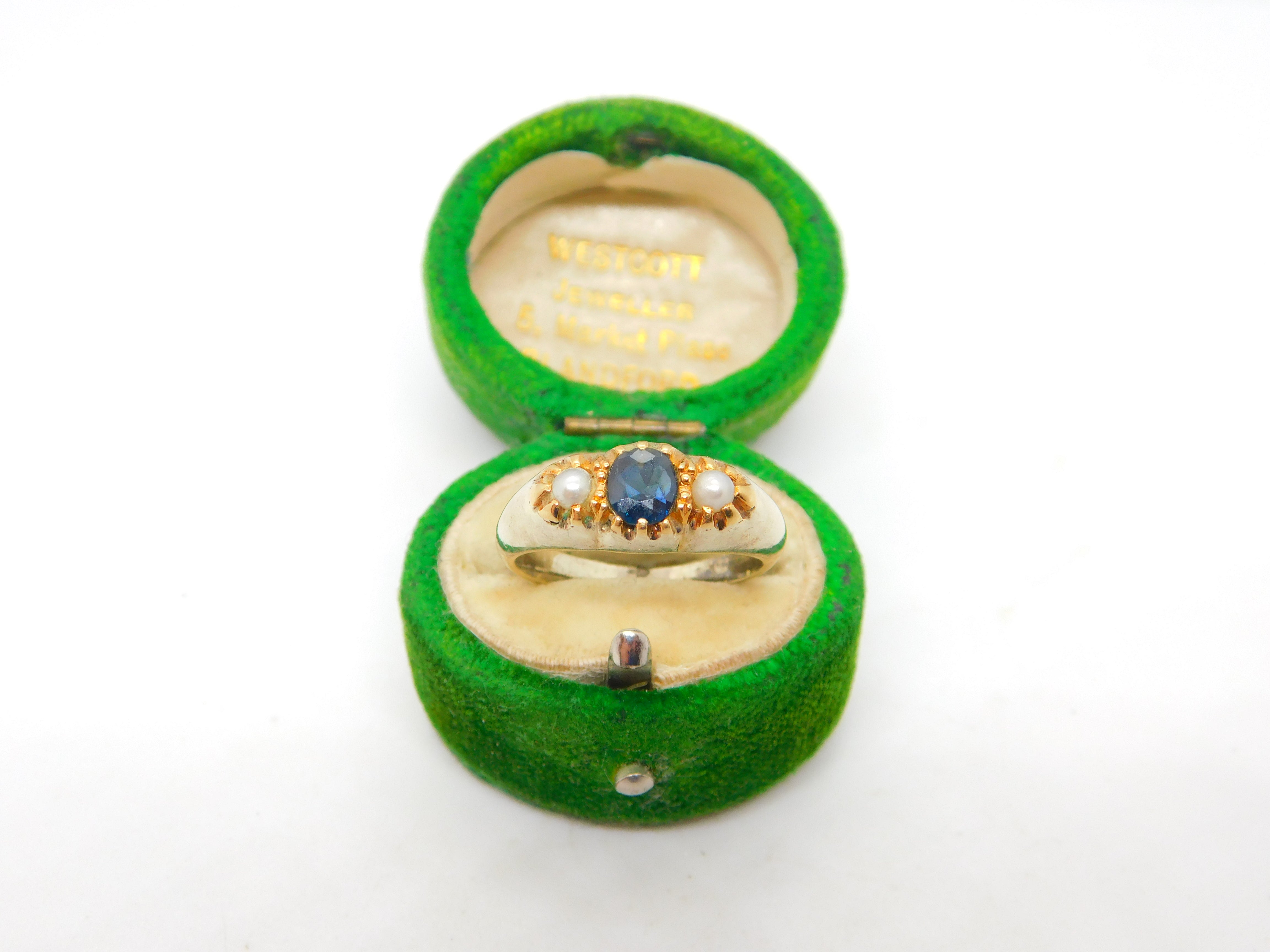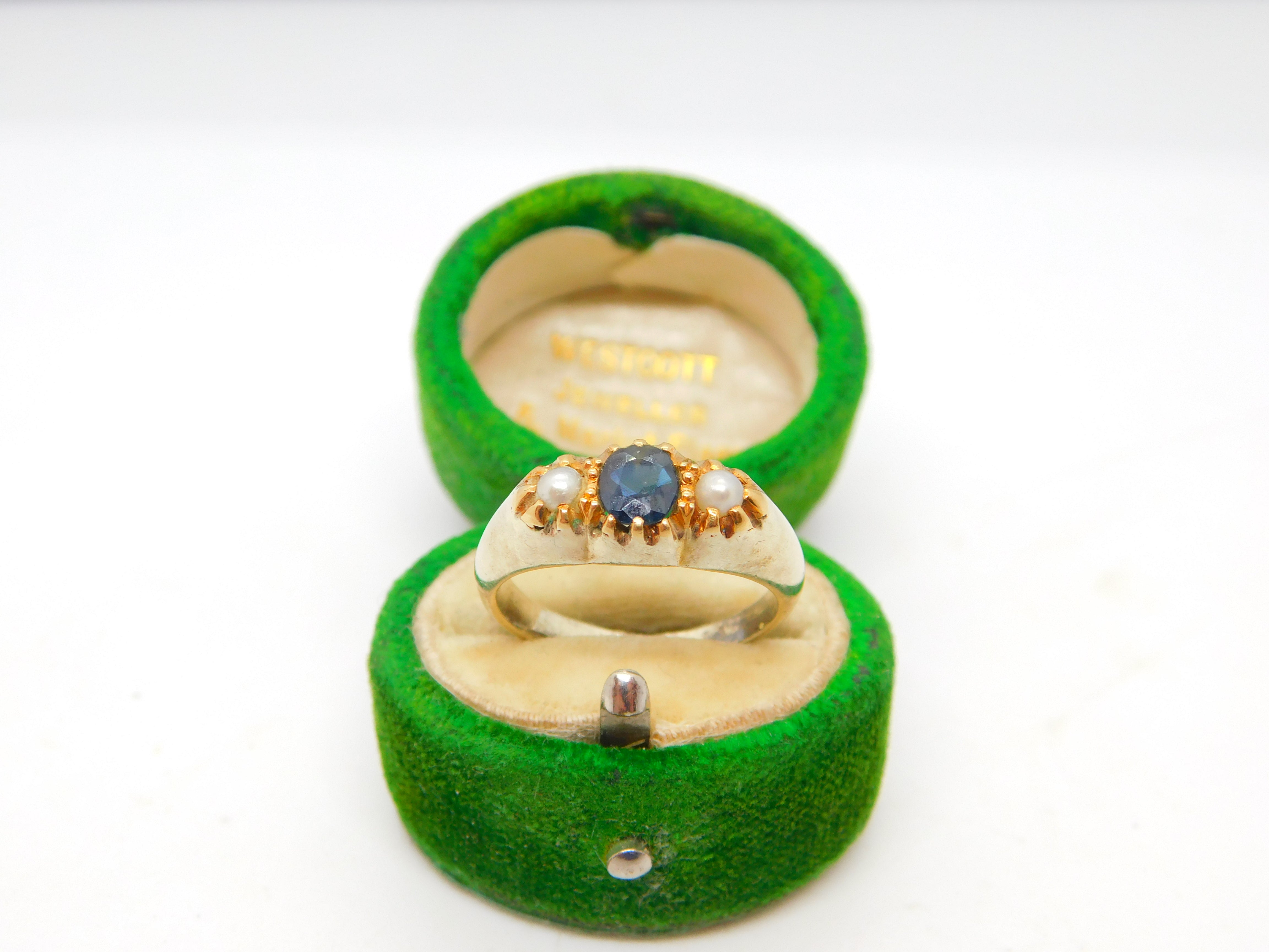 Details: A fantastic and wonderfully designed antique Victorian 18ct yellow gold boat ring set with a central sapphire flanked by two pearls c1880, the gold has been XRF tested as it is unmarked. This is a wonderful item that would make a perfect gift or addition to any collection. The BOX pictured is for PRESENTATION ONLY and is NOT included in the listings but used to frame the pictures unless specifically stated otherwise.