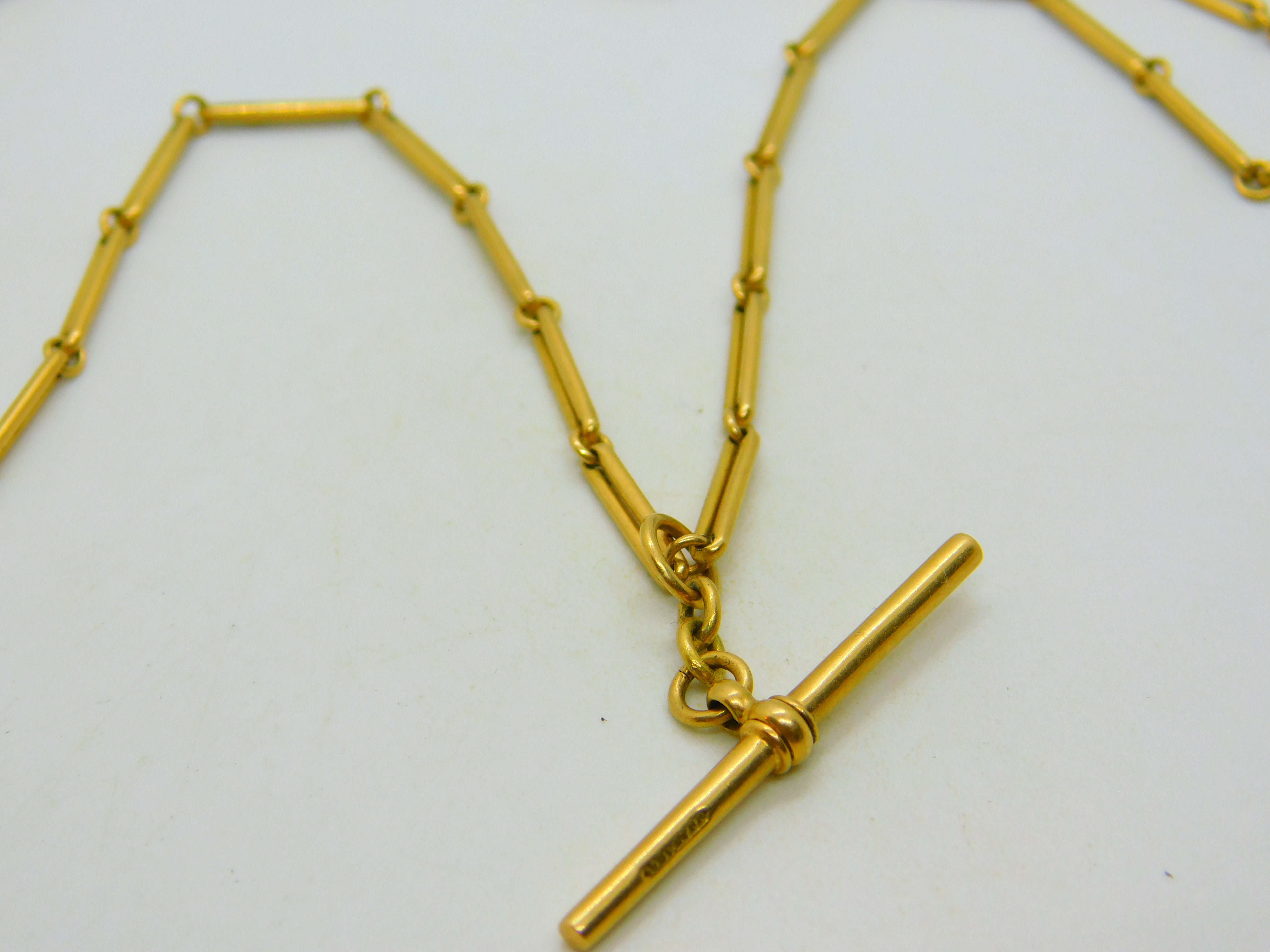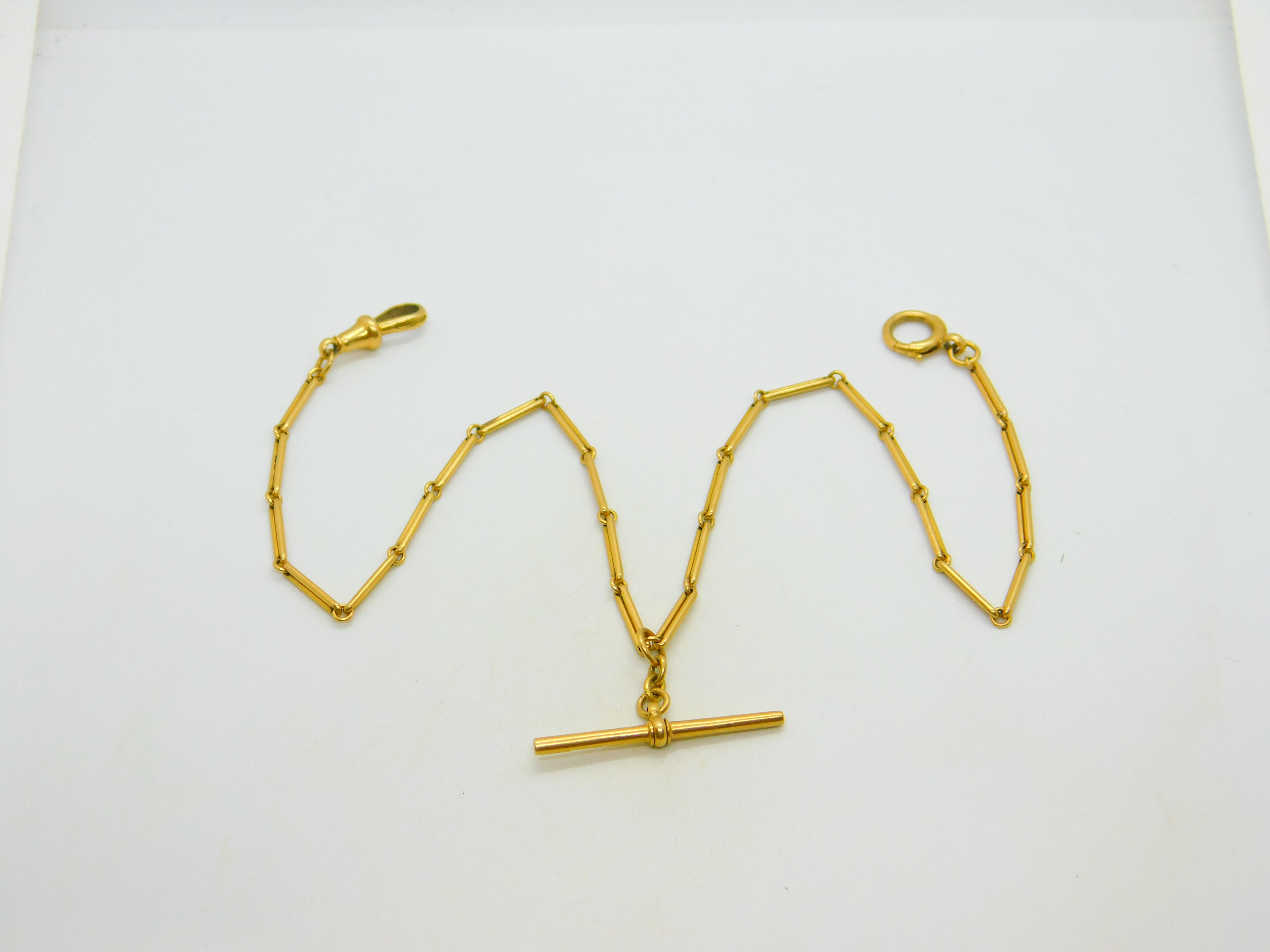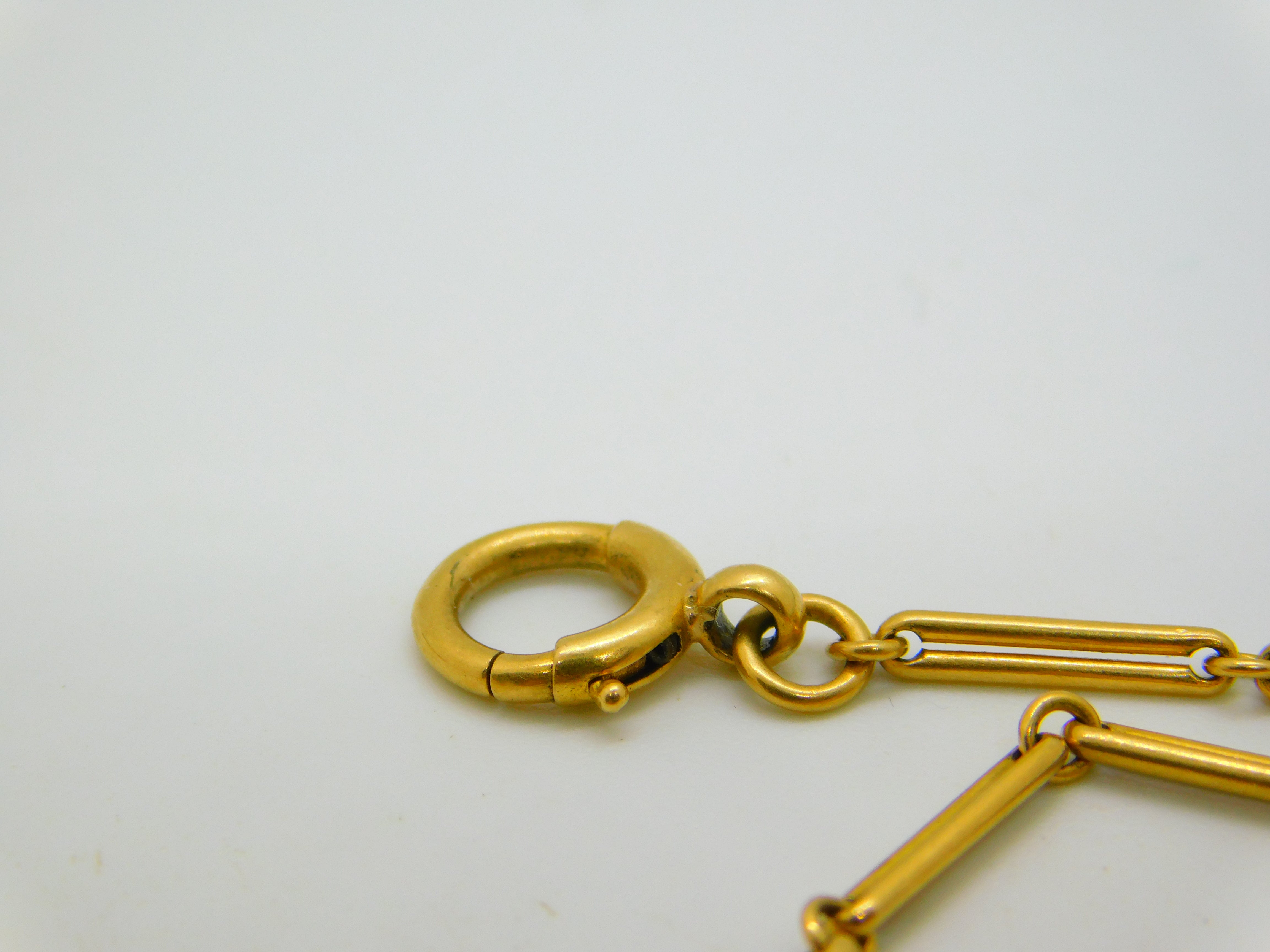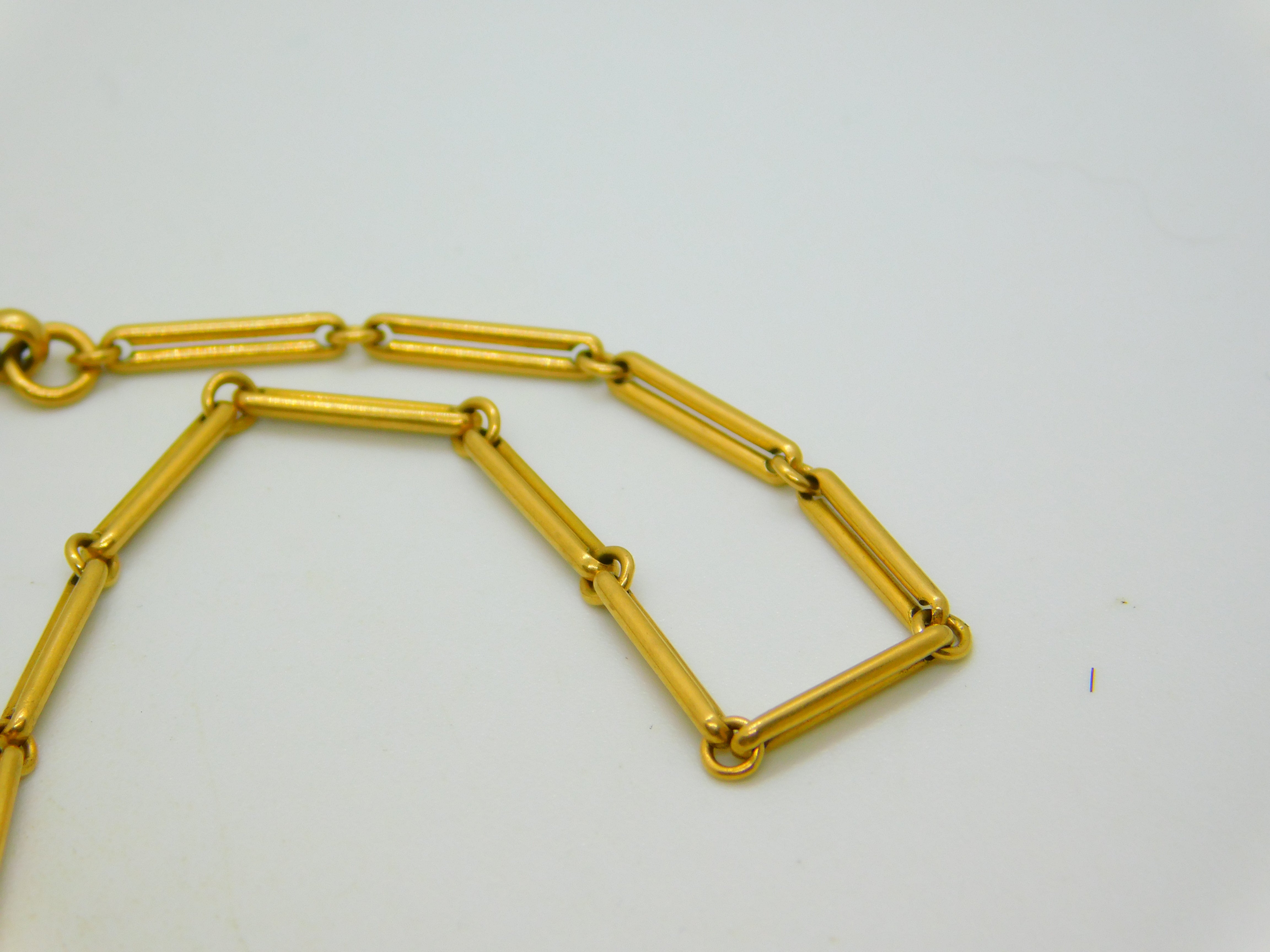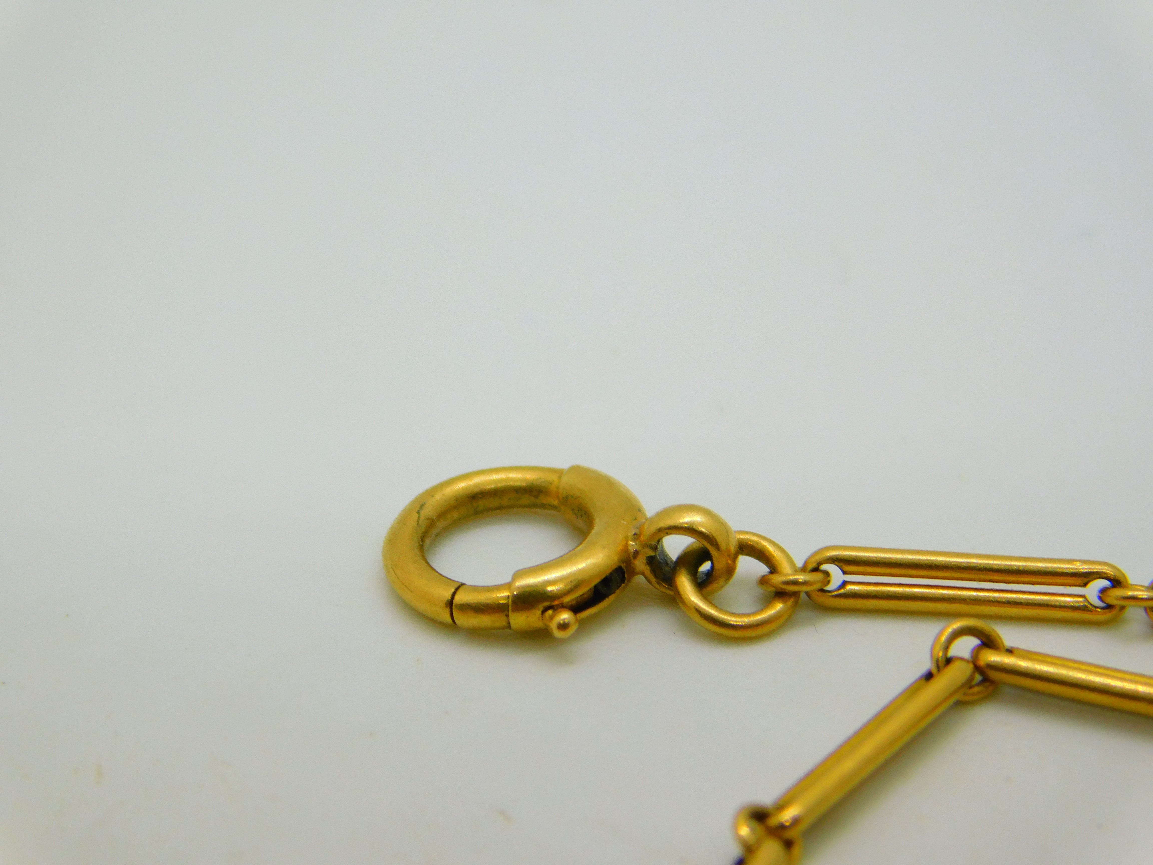 Details: A fantastic and wonderfully designed antique mid-Victorian 18ct yellow gold trombone link albertina watch chain with t-bar, bolt ring and dog clip clasp hallmarked to every aspect with lovely clear hallmarked c1860. Could be worn today as a short necklace but also as a watch chain as originally designed. This is a wonderful item that would make a perfect gift or addition to any collection. The BOX pictured is for PRESENTATION ONLY and is NOT included in the listings but used to frame the pictures unless specifically stated otherwise.