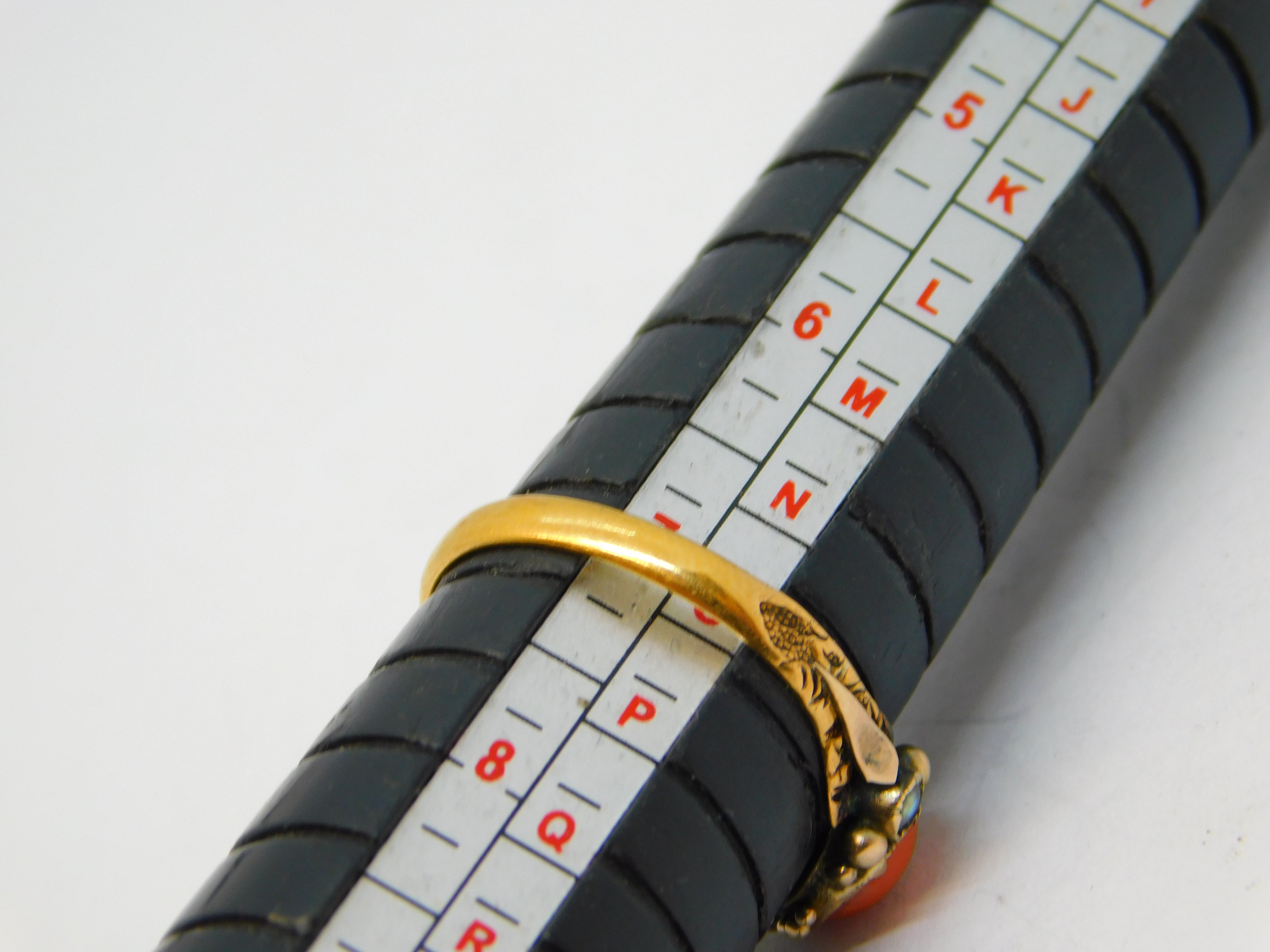 Details: A fantastic and wonderfully designed antique mid-victorian 22ct yellow gold dress ring set with section of red coral flanked by seed pearls hallmarked London 1864 to the interior. This is a wonderful item that would make a perfect gift or addition to any collection. We are more than happy to provide XRF reports for items upon request.