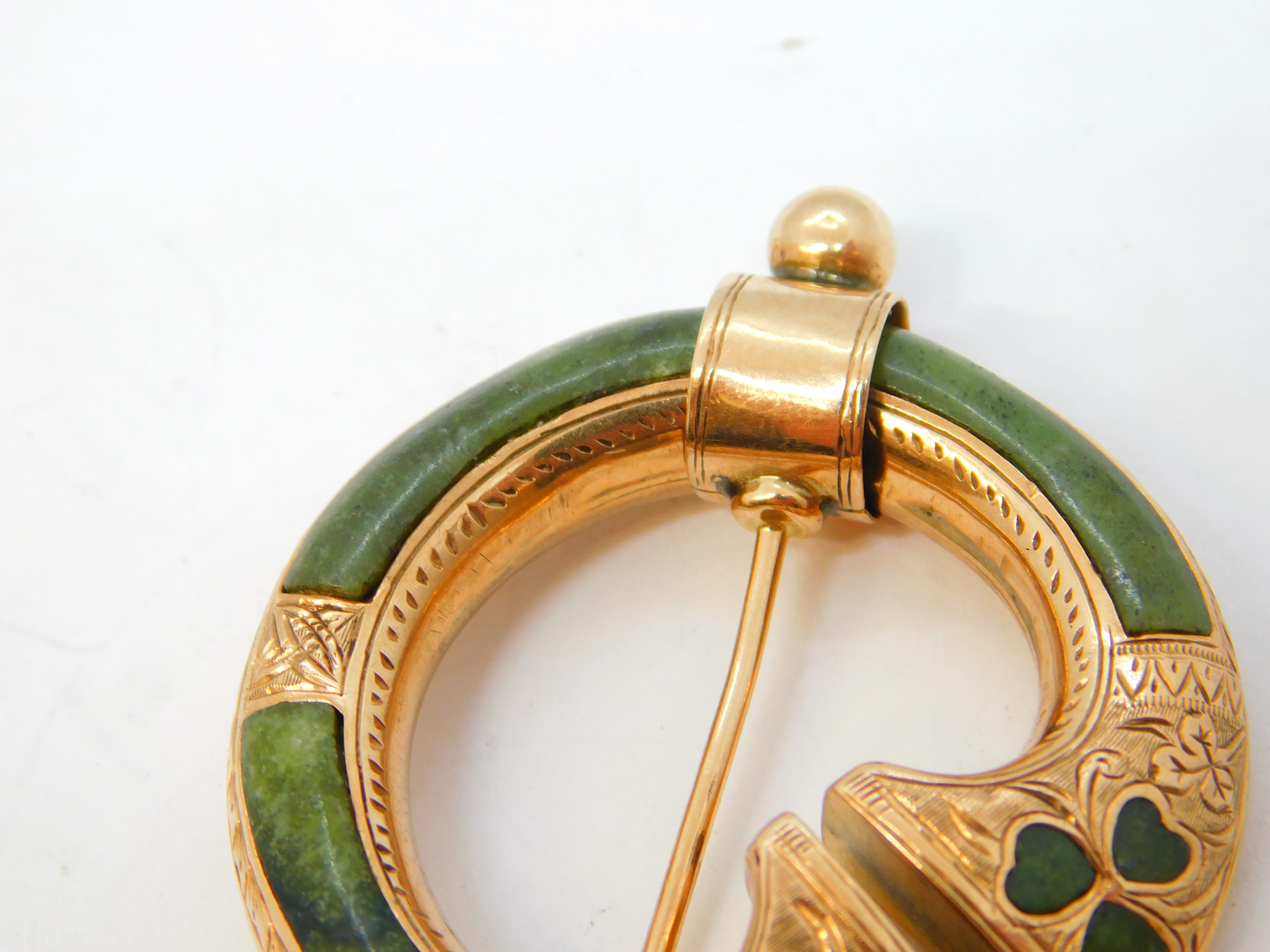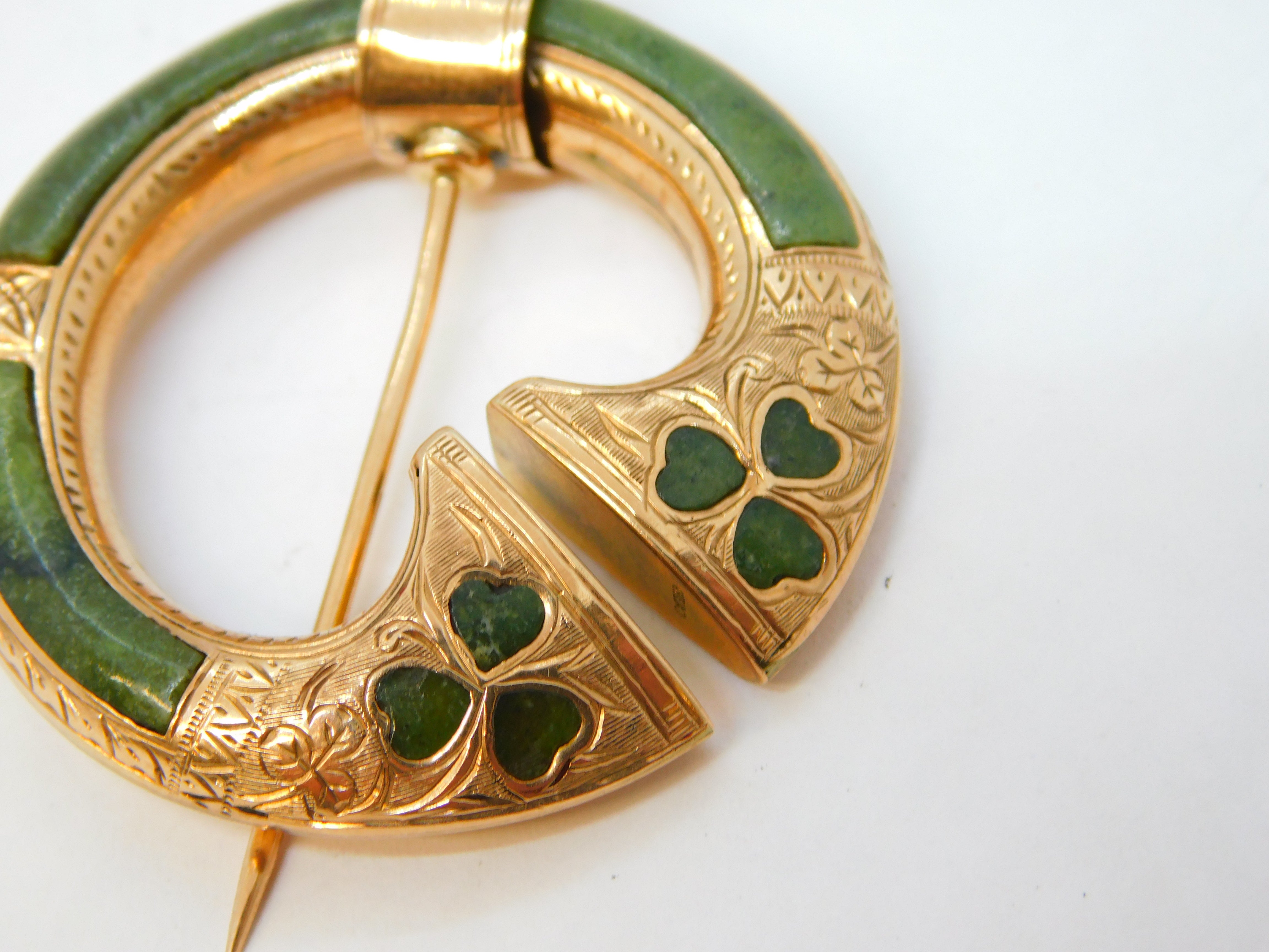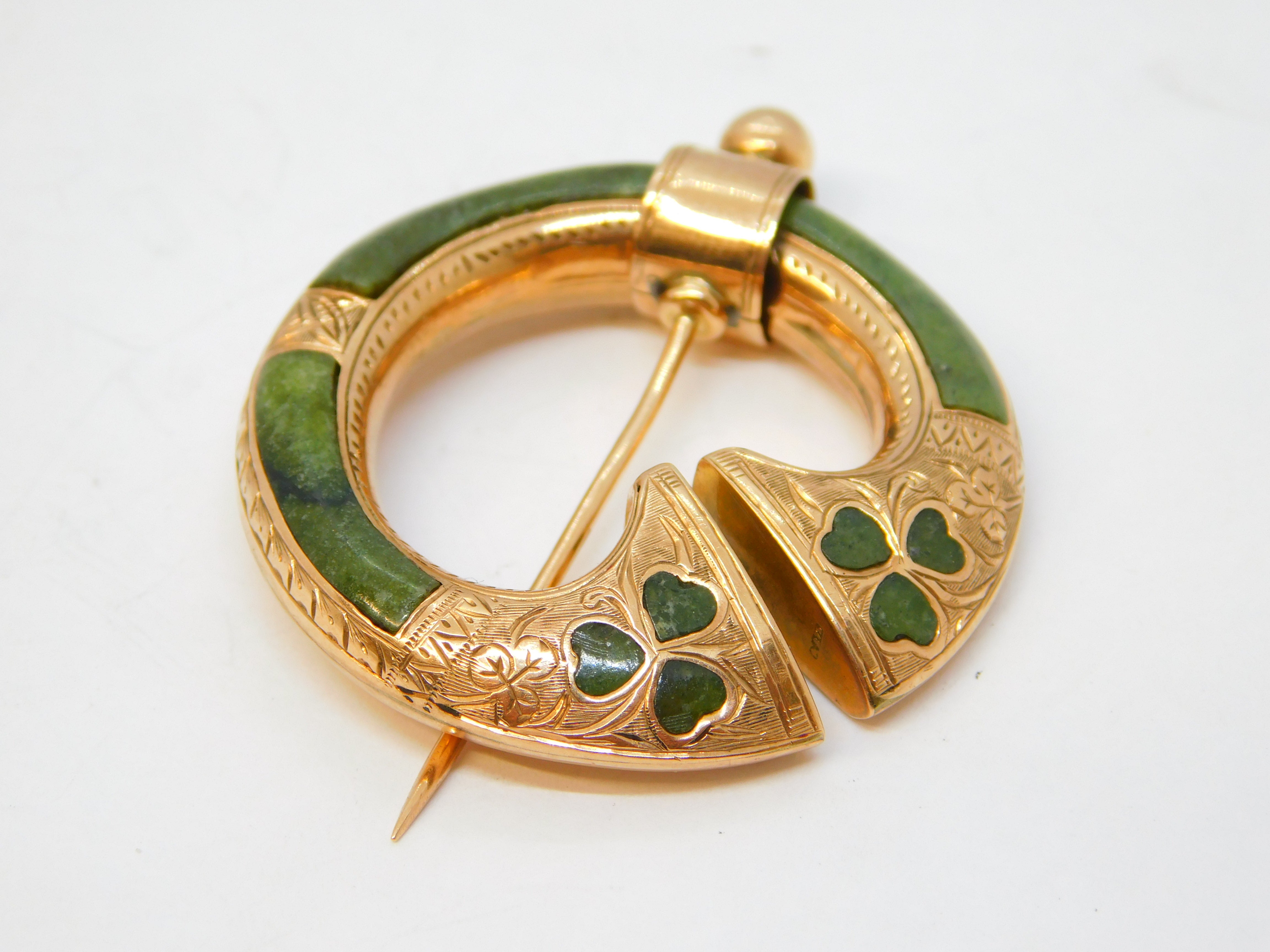 Details: A fantastic and wonderfully designed antique Victorian 9ct yellow gold Irish or Scottish penannular brooch set with section of connemara marble in lovely shamrock patterns hallmarked to the reverse c1880. This is a wonderful item that would make a perfect gift or addition to any collection. We are more than happy to provide XRF reports for items upon request.