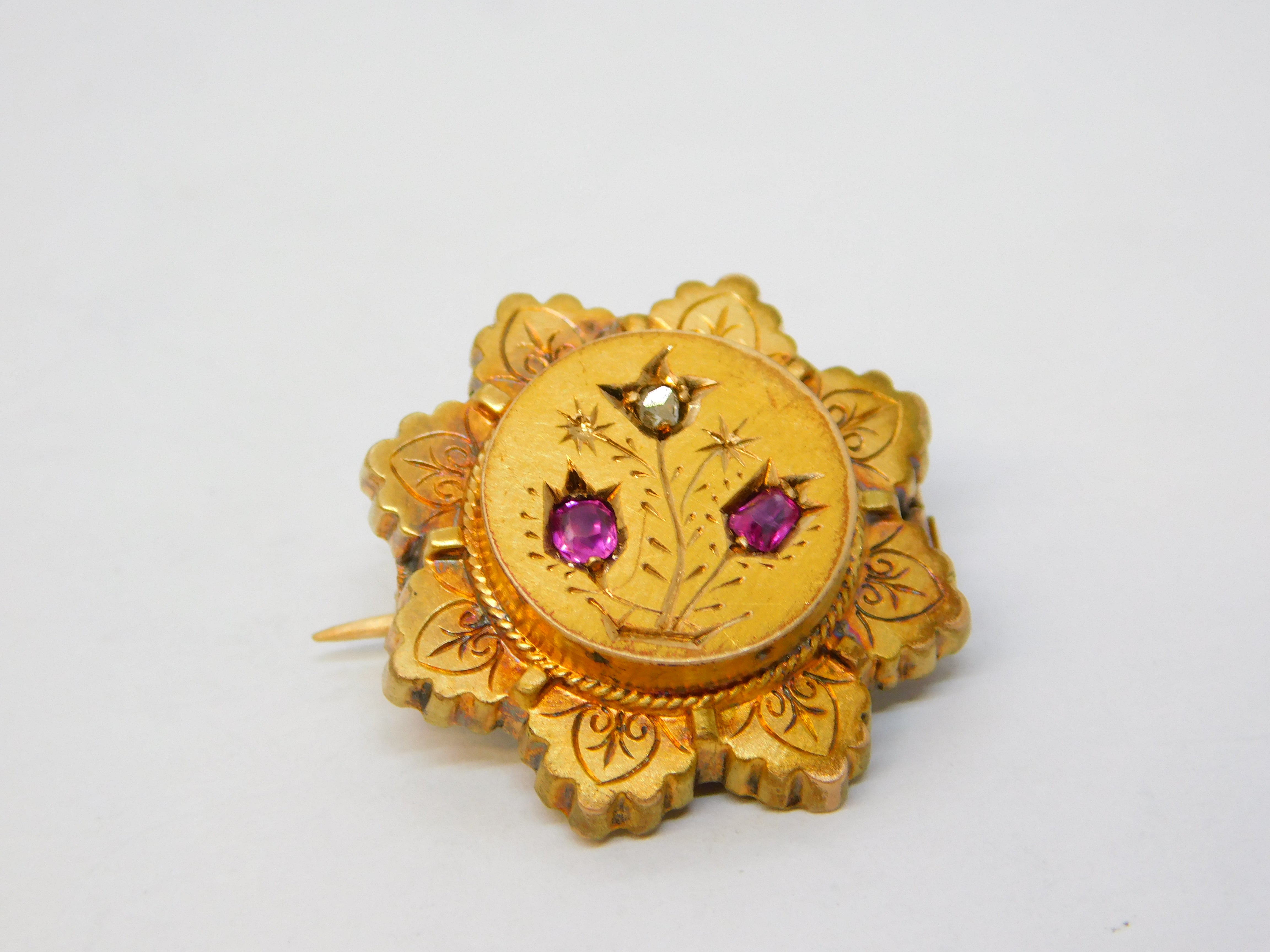 Details: A fantastic and wonderfully designed antique Victorian 9ct yellow gold floral brooch with locket to the reverse set with old-cut diamond and two rubies c1880, the gold has been XRF tested as it is unmarked. This is a wonderful item that would make a perfect gift or addition to any collection.
