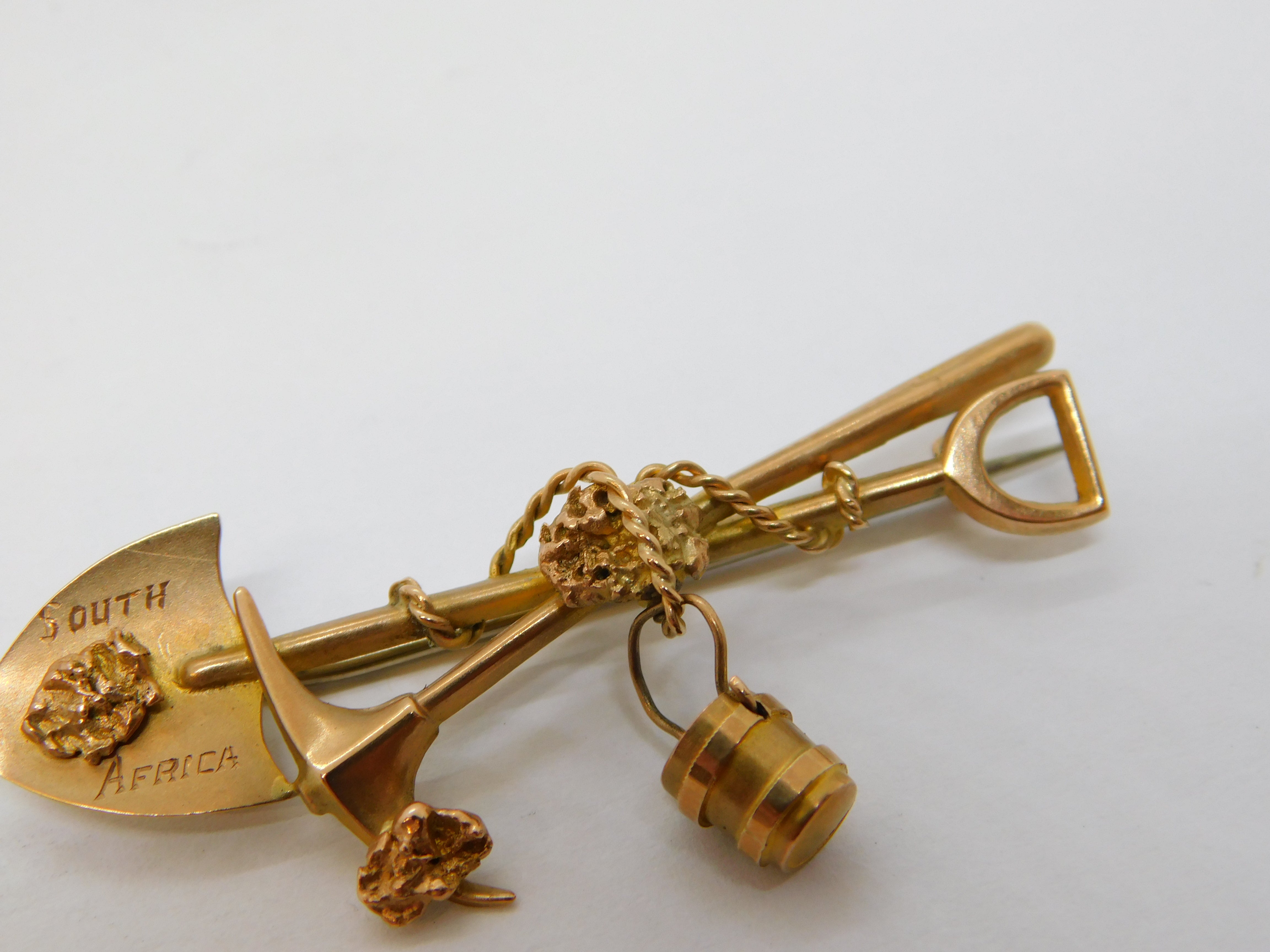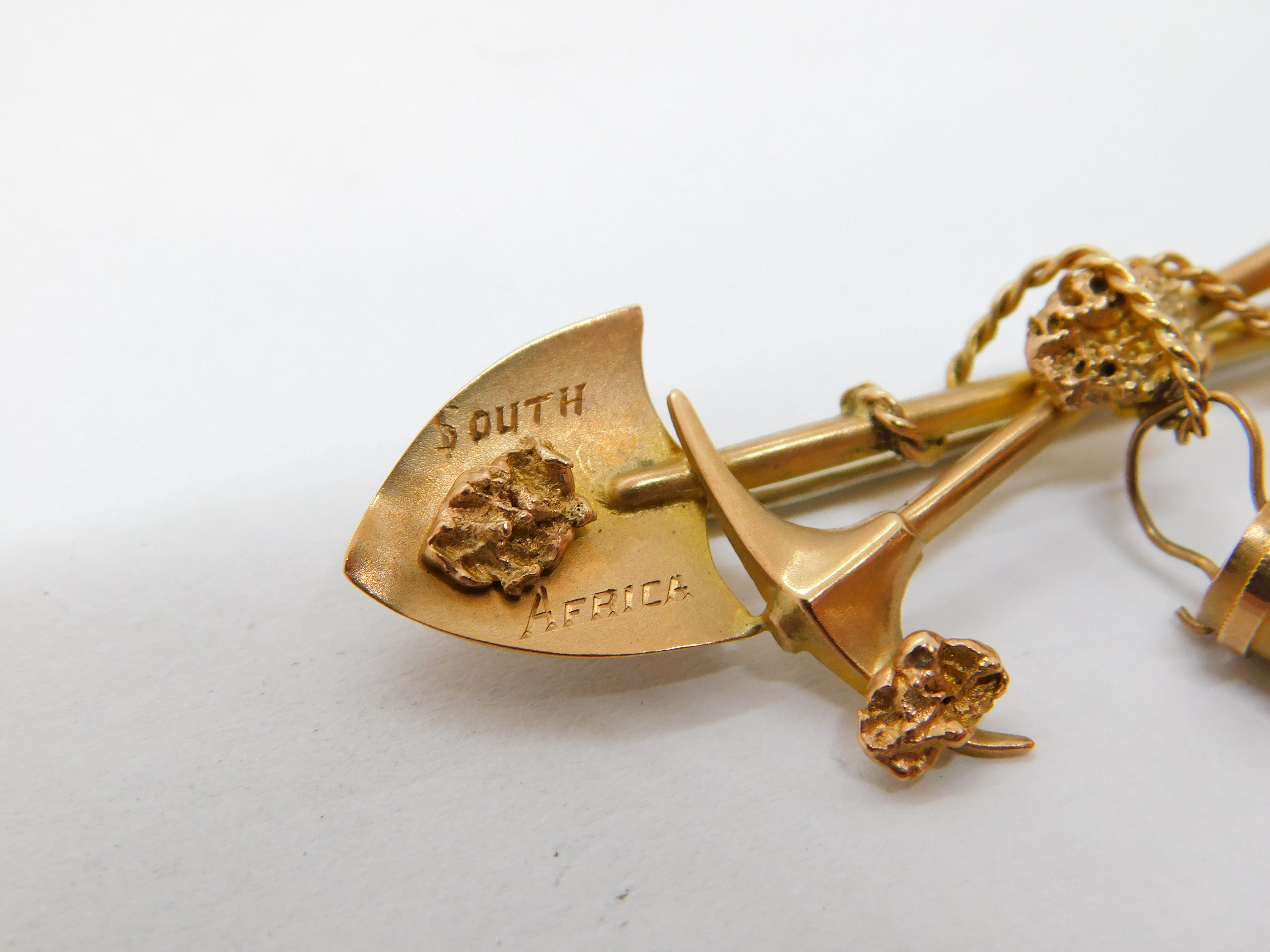 Details: A fantastic and wonderfully designed antique Victorian 9ct yellow gold South African Miner's brooch in the form of a shovel & pick with bucket and gold nugget to the central area engraved South Africa, hallmarked Birmingham 1897 to the reverse of the brooch. This is a wonderful item that would make a perfect gift or addition to any collection.