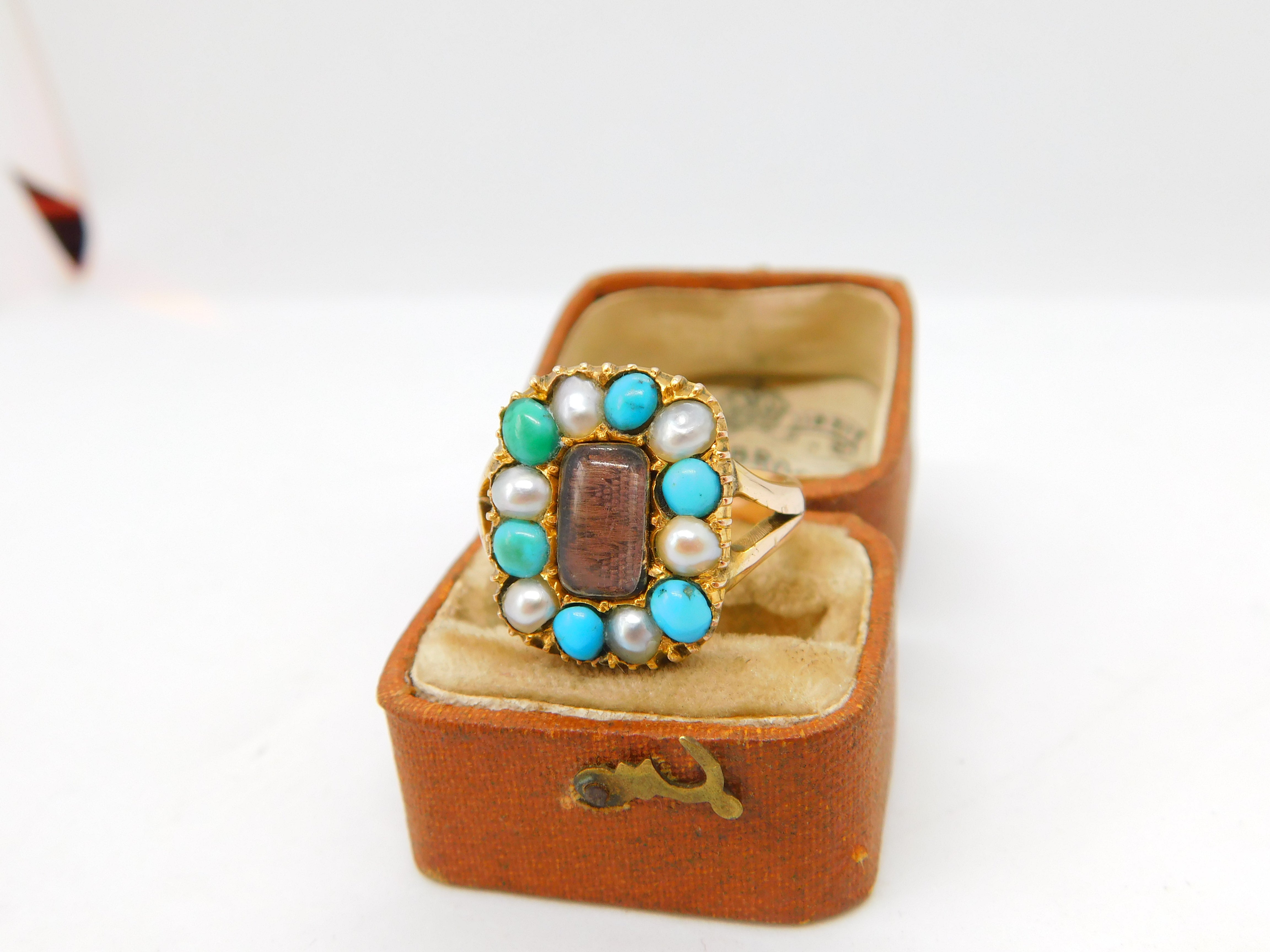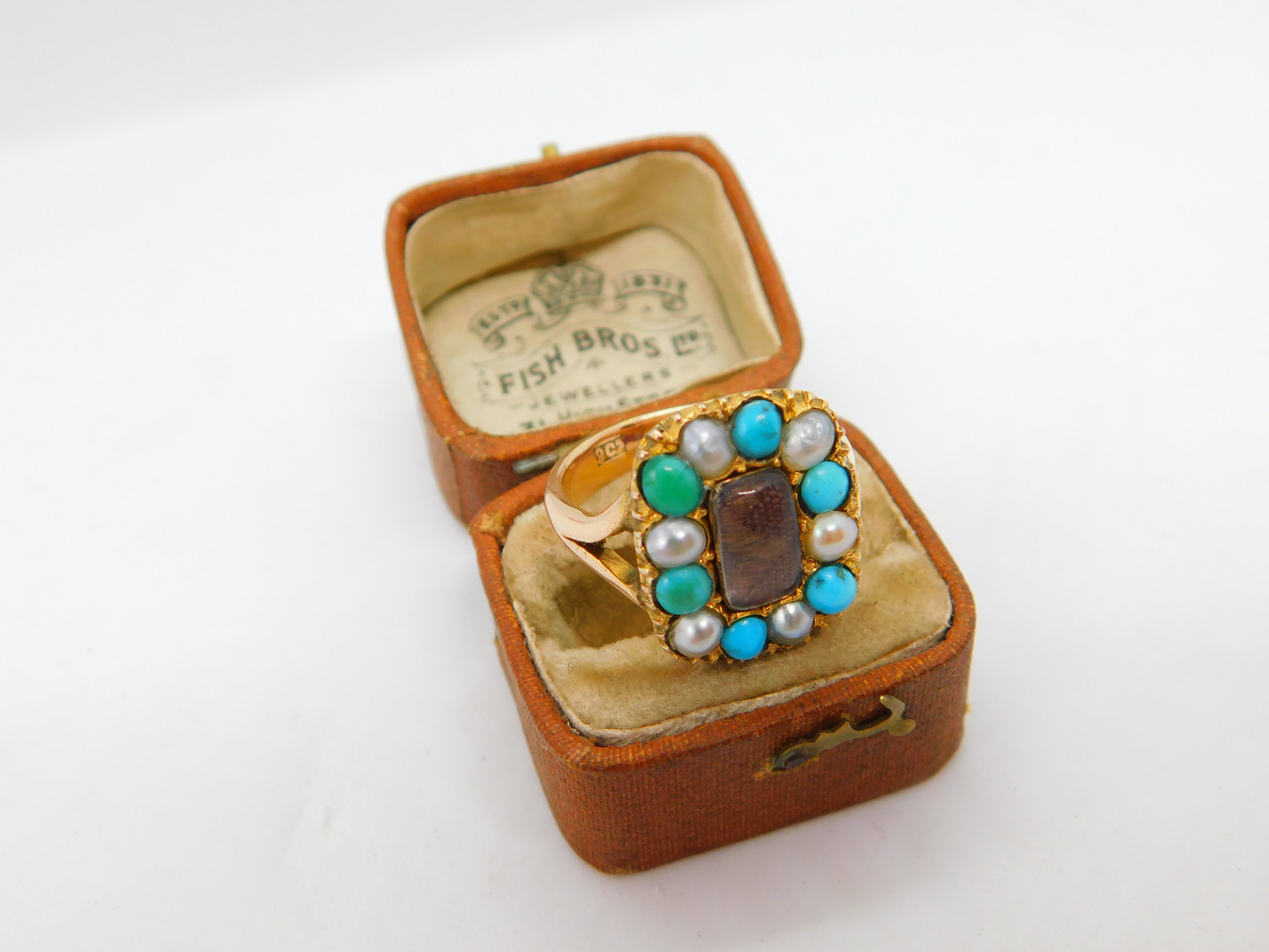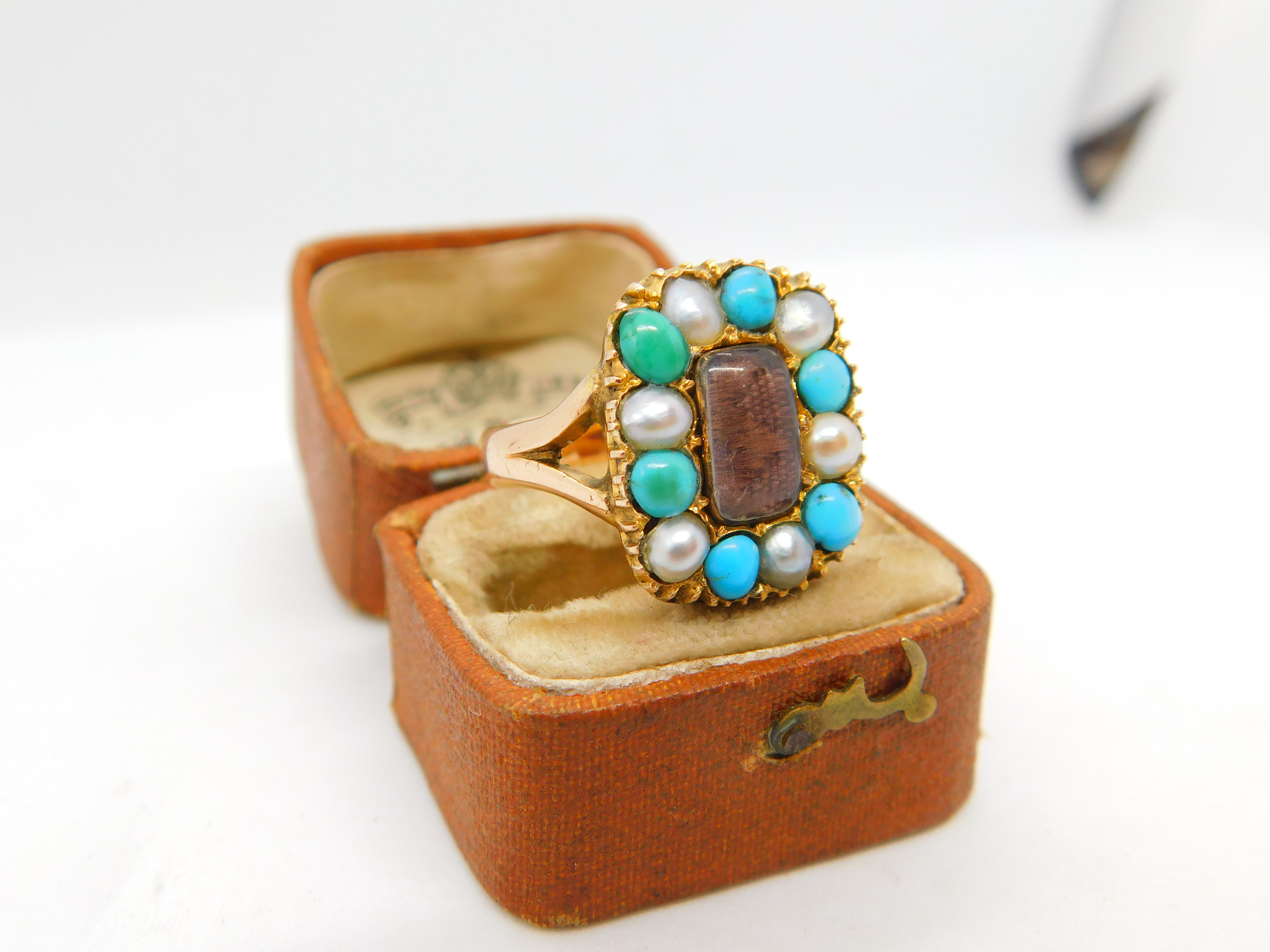 Details: A fantastic and wonderfully designed antique Victorian 9ct yellow gold mourning ring with woven hair surrounded by turquoise & pearls hallmarked 9ct to the interior c1840. This is a wonderful item that would make a perfect gift or addition to any collection. The BOX pictured is for PRESENTATION ONLY and is NOT included in the listings but used to frame the pictures unless specifically stated otherwise.
