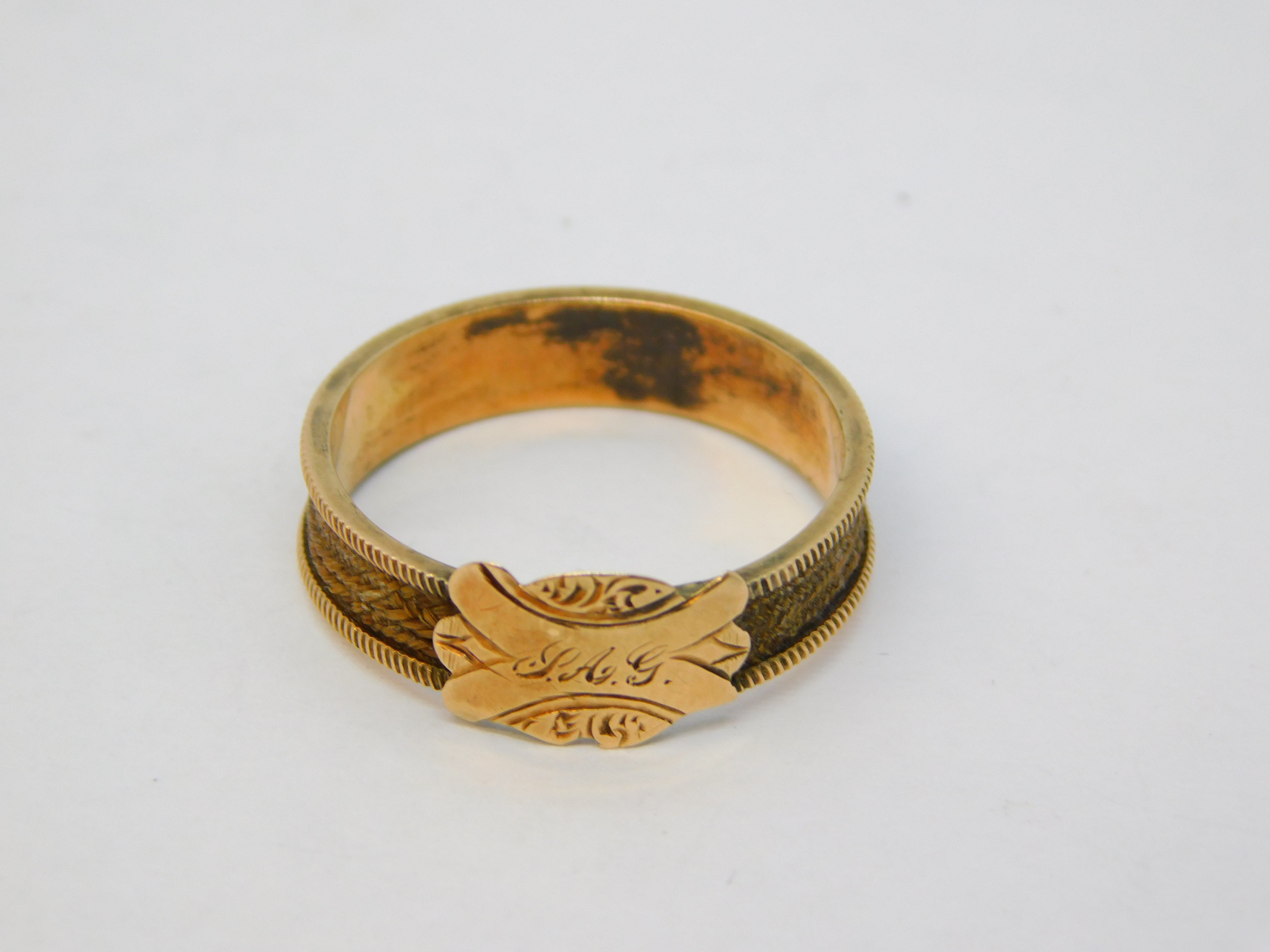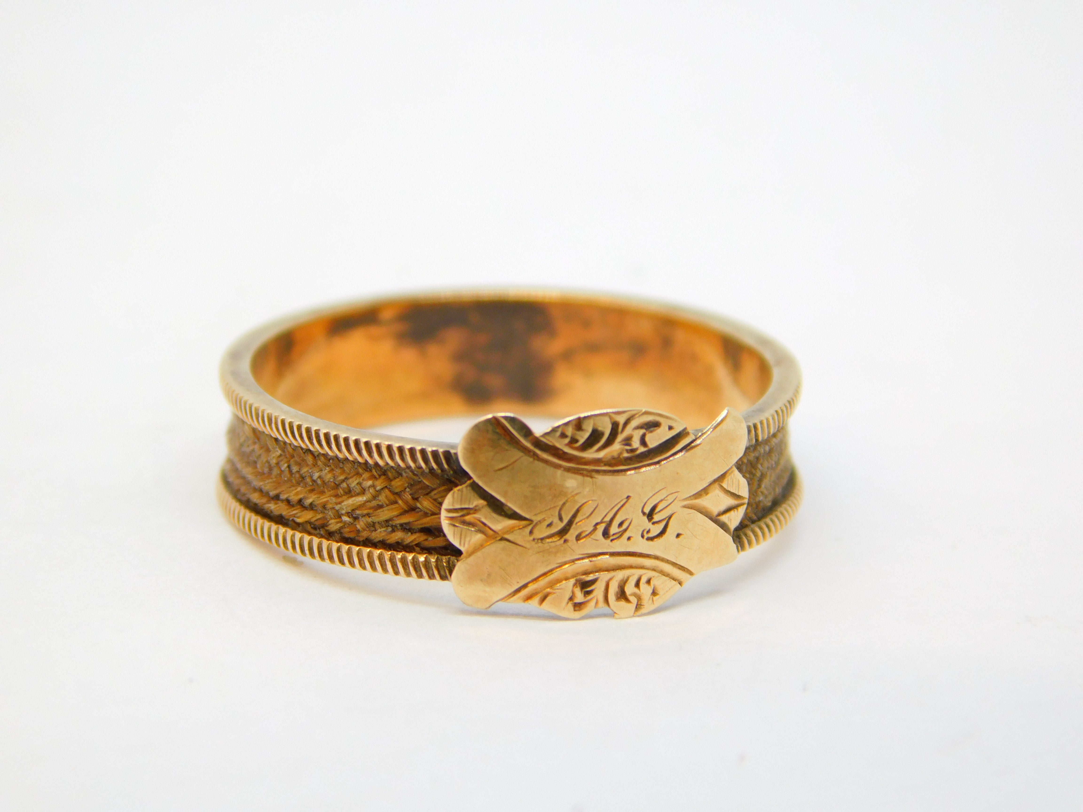 Details: A fantastic and wonderfully designed antique early-Victorian 9ct gold mourning band ring set with woven hair to the outer band, engraved initials to the cartouche c1840, the gold has been XRF tested as it is unmarked. This is a wonderful item that would make a perfect gift or addition to any collection.