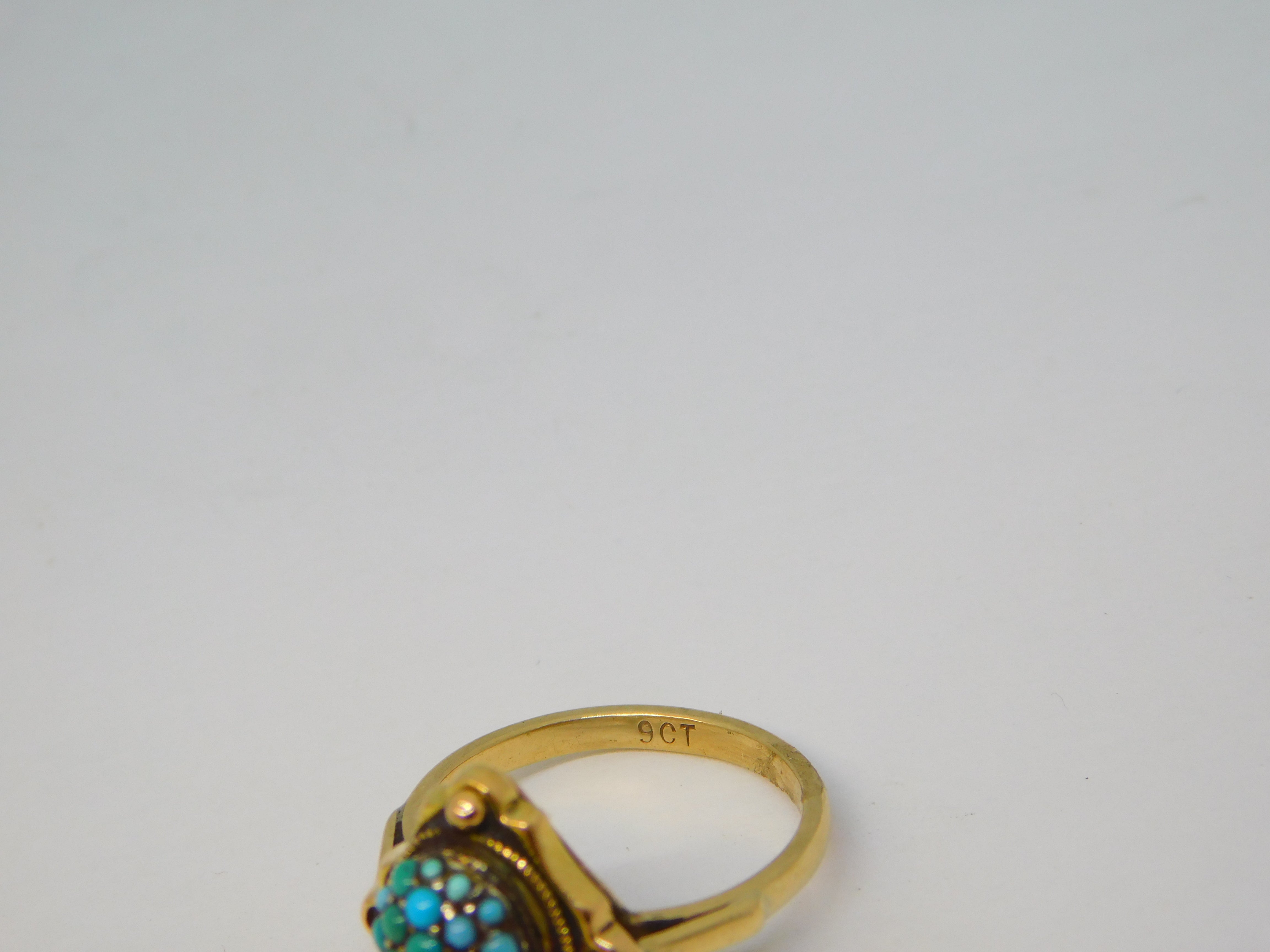 Details: A fantastic and wonderfully designed antique Victorian 9ct yellow gold dress ring with pave set turquoise throughout hallmarked to the interior band '9ct' c1890. This is a wonderful item that would make a perfect gift or addition to any collection. The BOX pictured is for PRESENTATION ONLY and is NOT included in the listings but used to frame the pictures unless specifically stated otherwise.