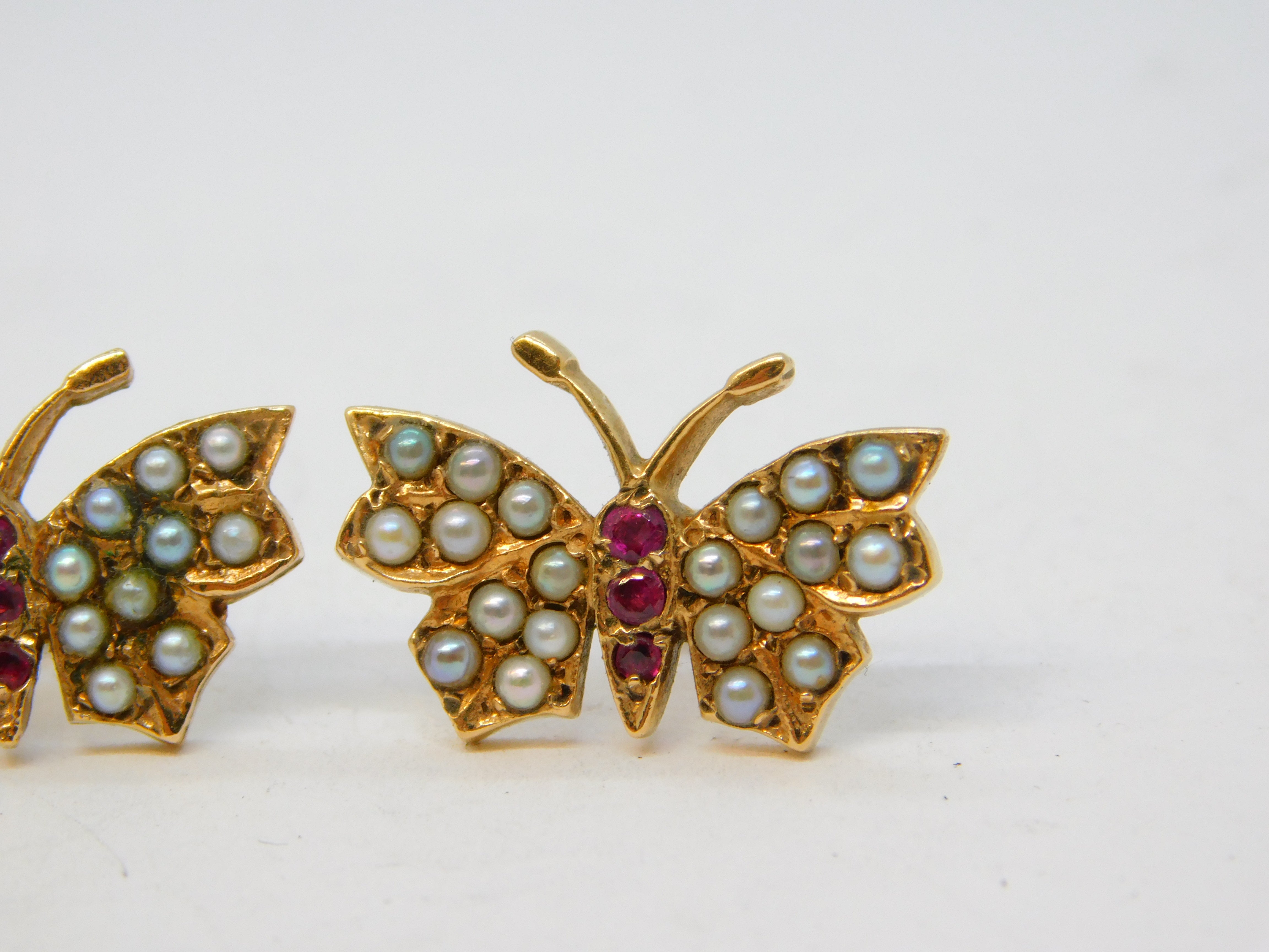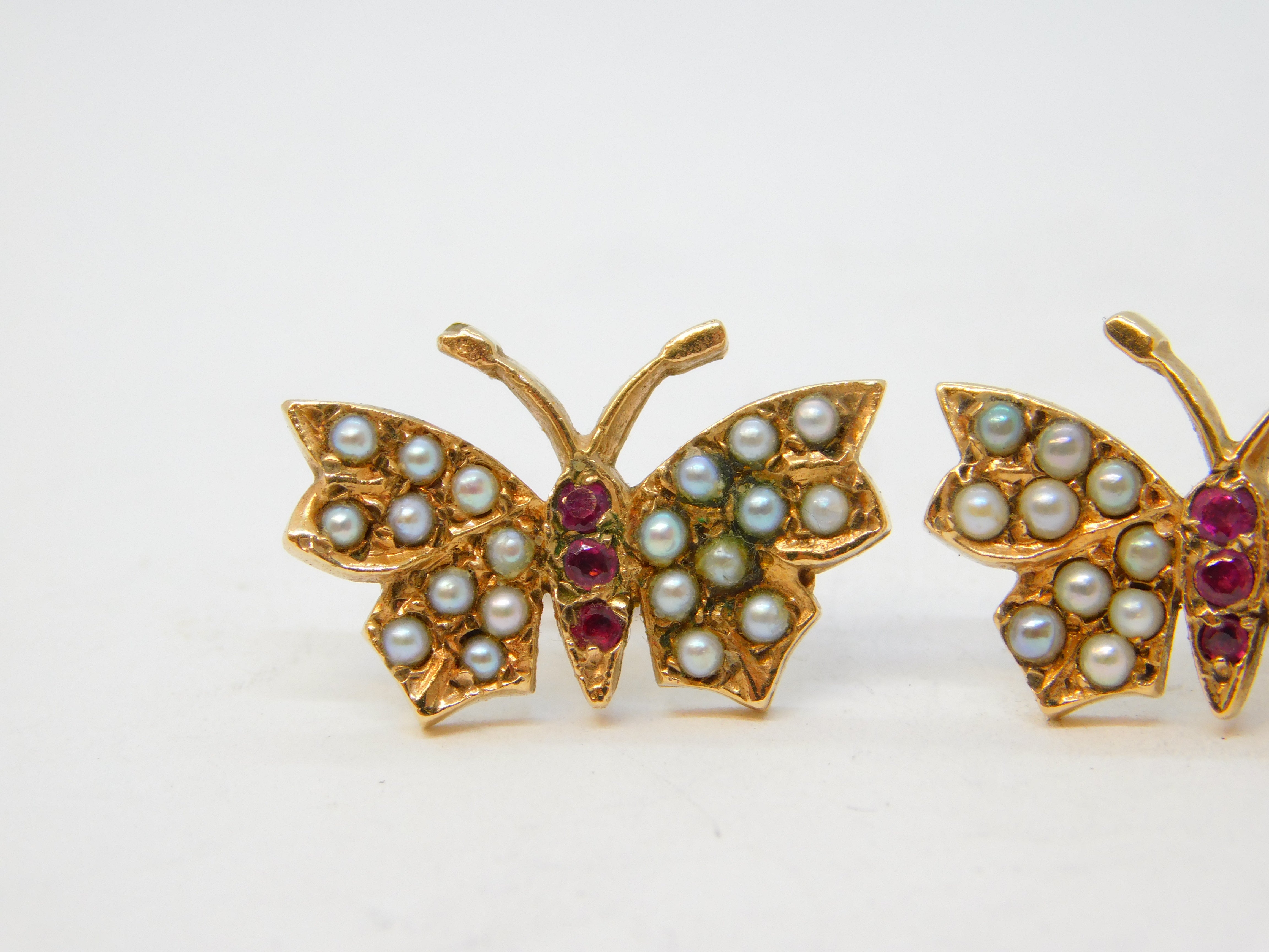 Details: A fantastic and wonderfully designed antique Victorian 9ct yellow gold pair of butterfly stud earrings set with graduating seed pearls and central rubies c1880, the gold has been XRF tested please refer to the pictures for report. This is a wonderful item that would make a perfect gift or addition to any collection. We are more than happy to provide XRF reports for items upon request.