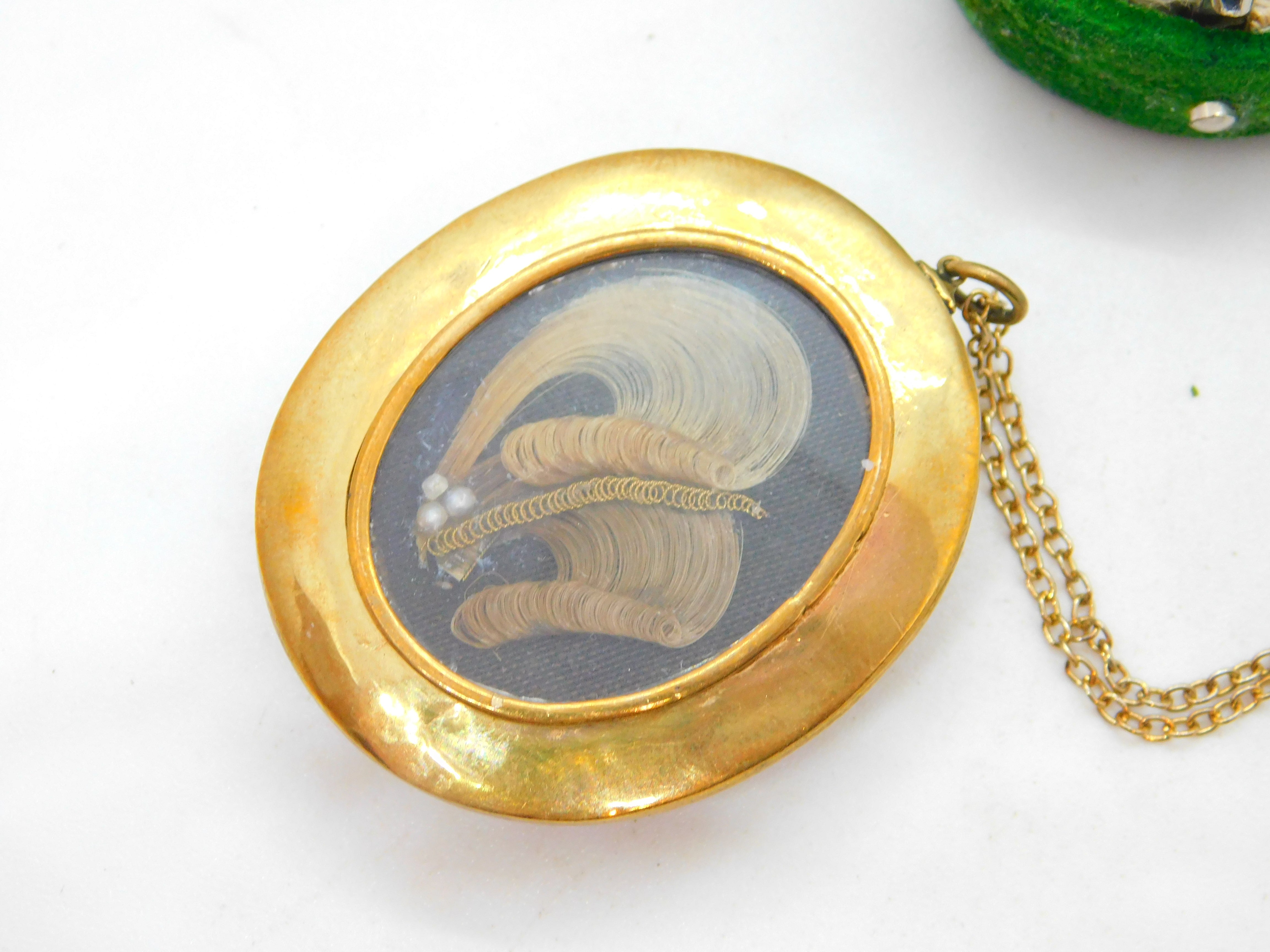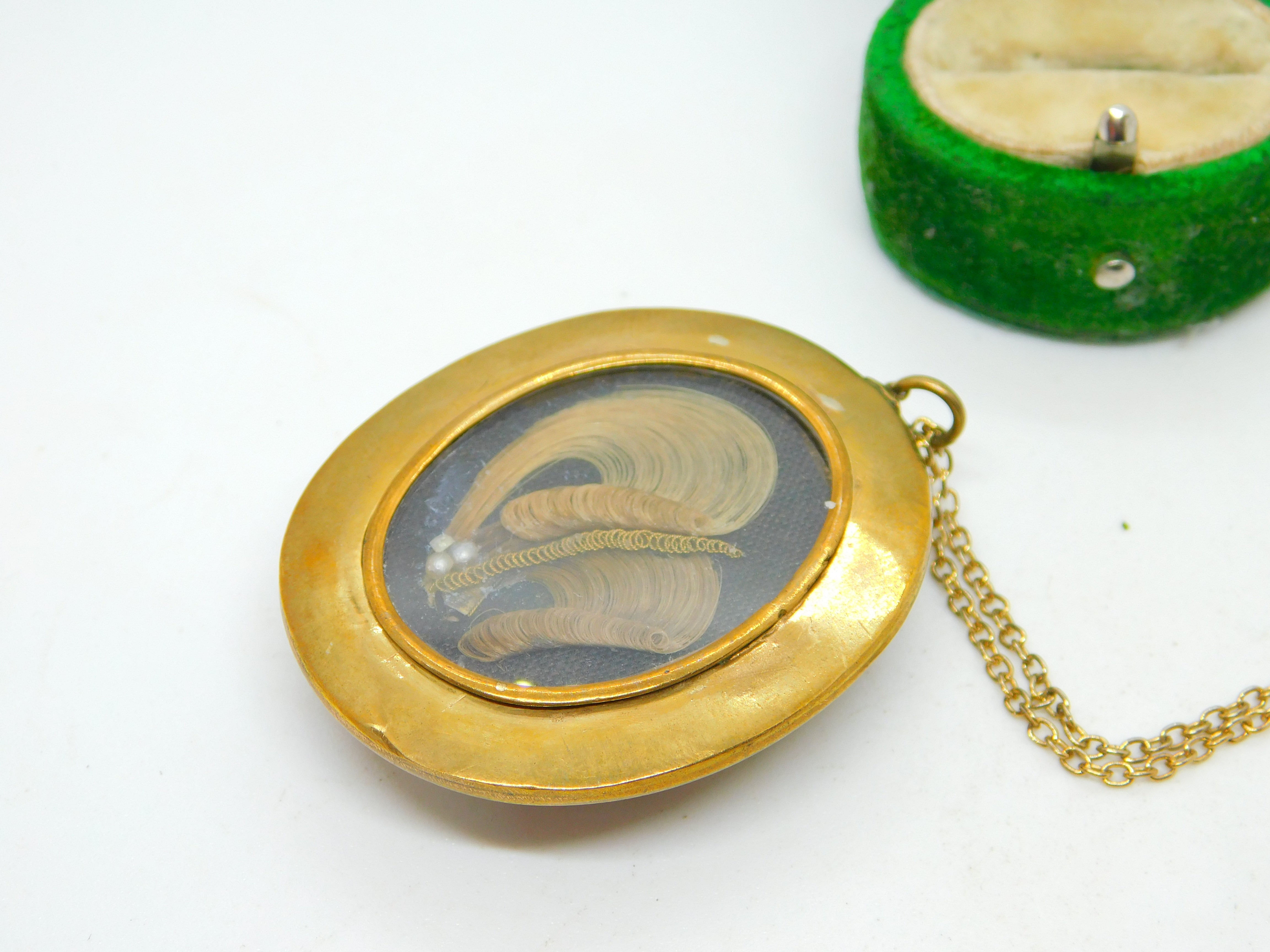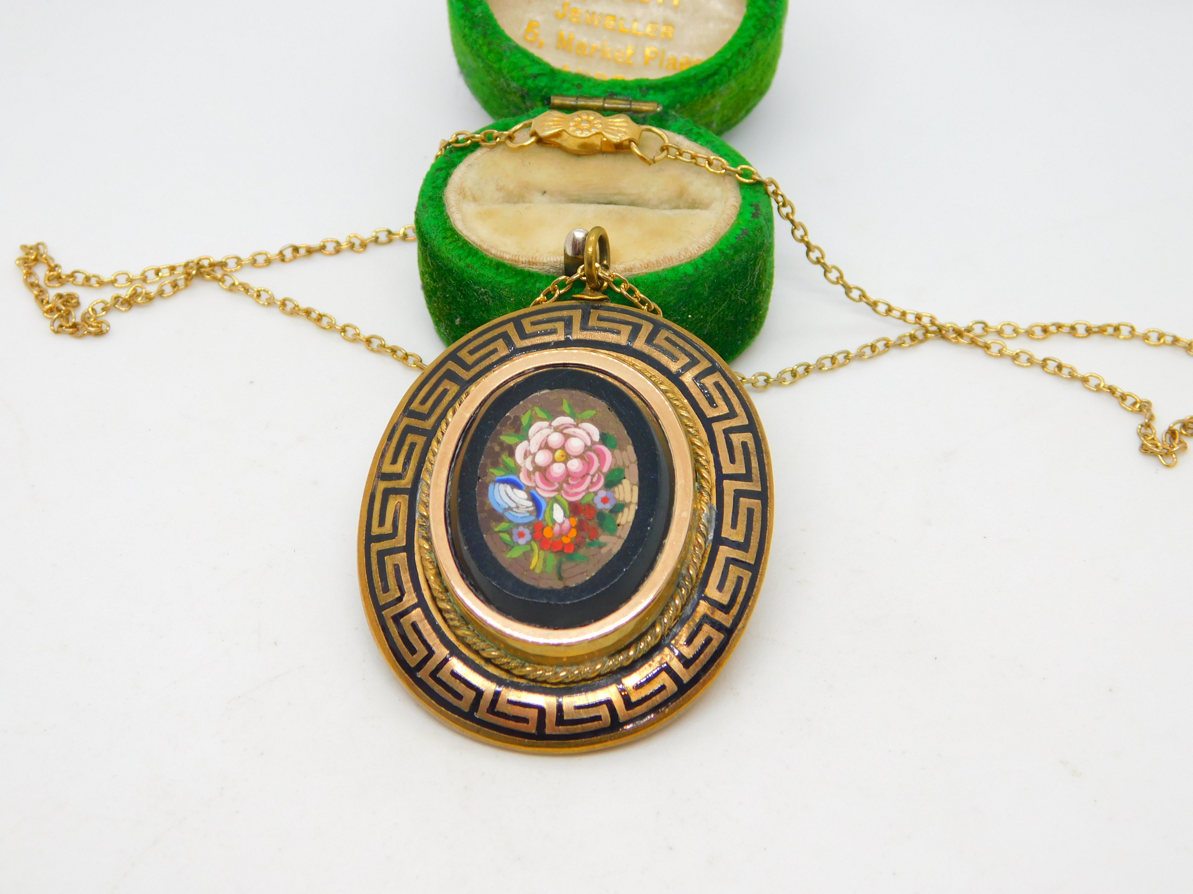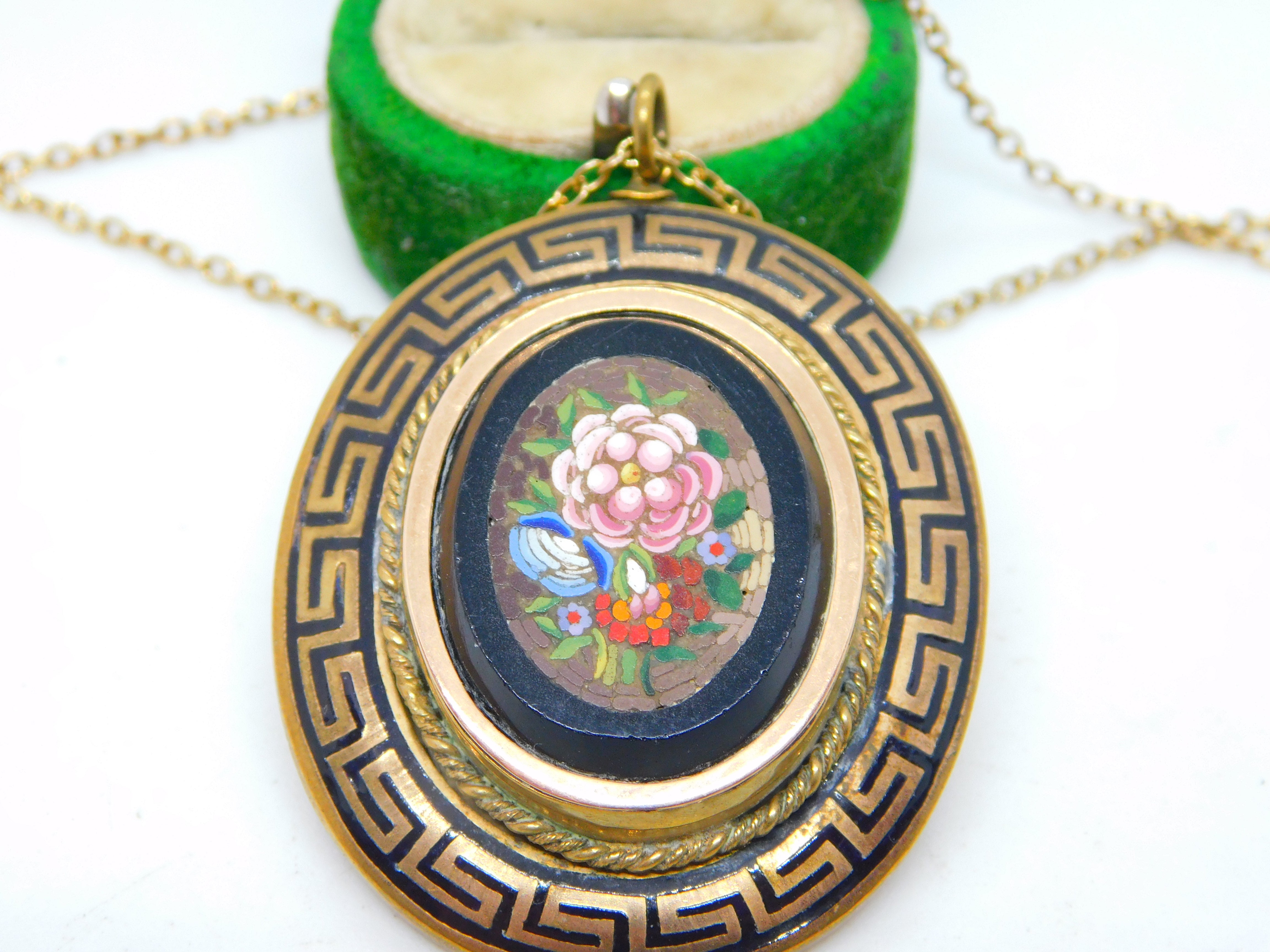 Details: A fantastic and wonderfully designed antique Victorian pinchbeck mourning pendant adorned to the edge with black enamel in greek key pattern, set with floral micro-mosaic to the centre and woven hair to the reverse locket c1860, set of a rolled gold cable link chain necklace. This is a wonderful item that would make a perfect gift or addition to any collection. The BOX pictured is for PRESENTATION ONLY and is NOT included in the listings but used to frame the pictures unless specifically stated otherwise.