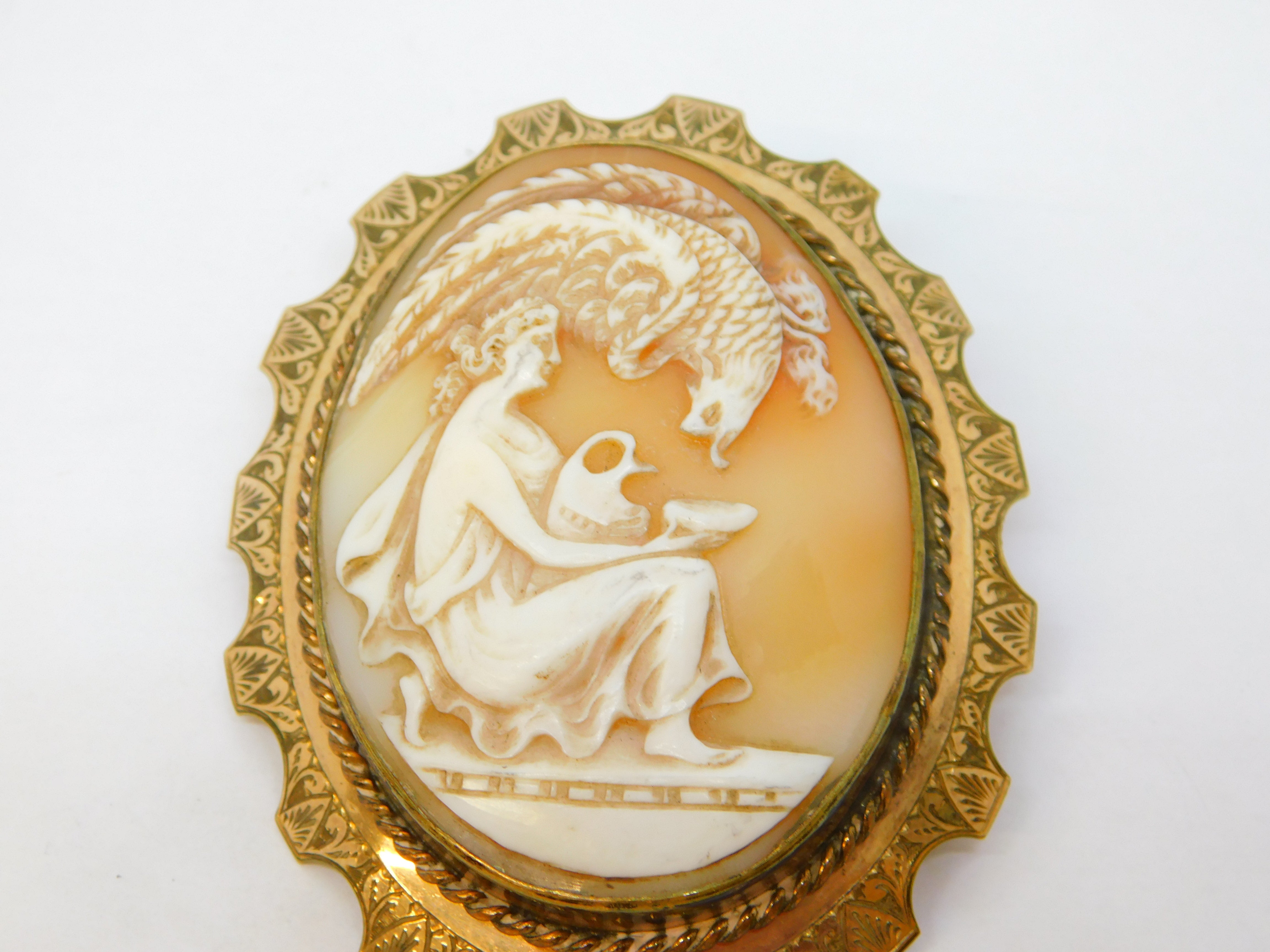 Details: A fantastic and wonderfully designed antique Victorian rolled gold mounted large carved shell cameo depicting the goddess hebe with the eagle c1860, marked rolled gold to the reverse. This is a wonderful item that would make a perfect gift or addition to any collection.