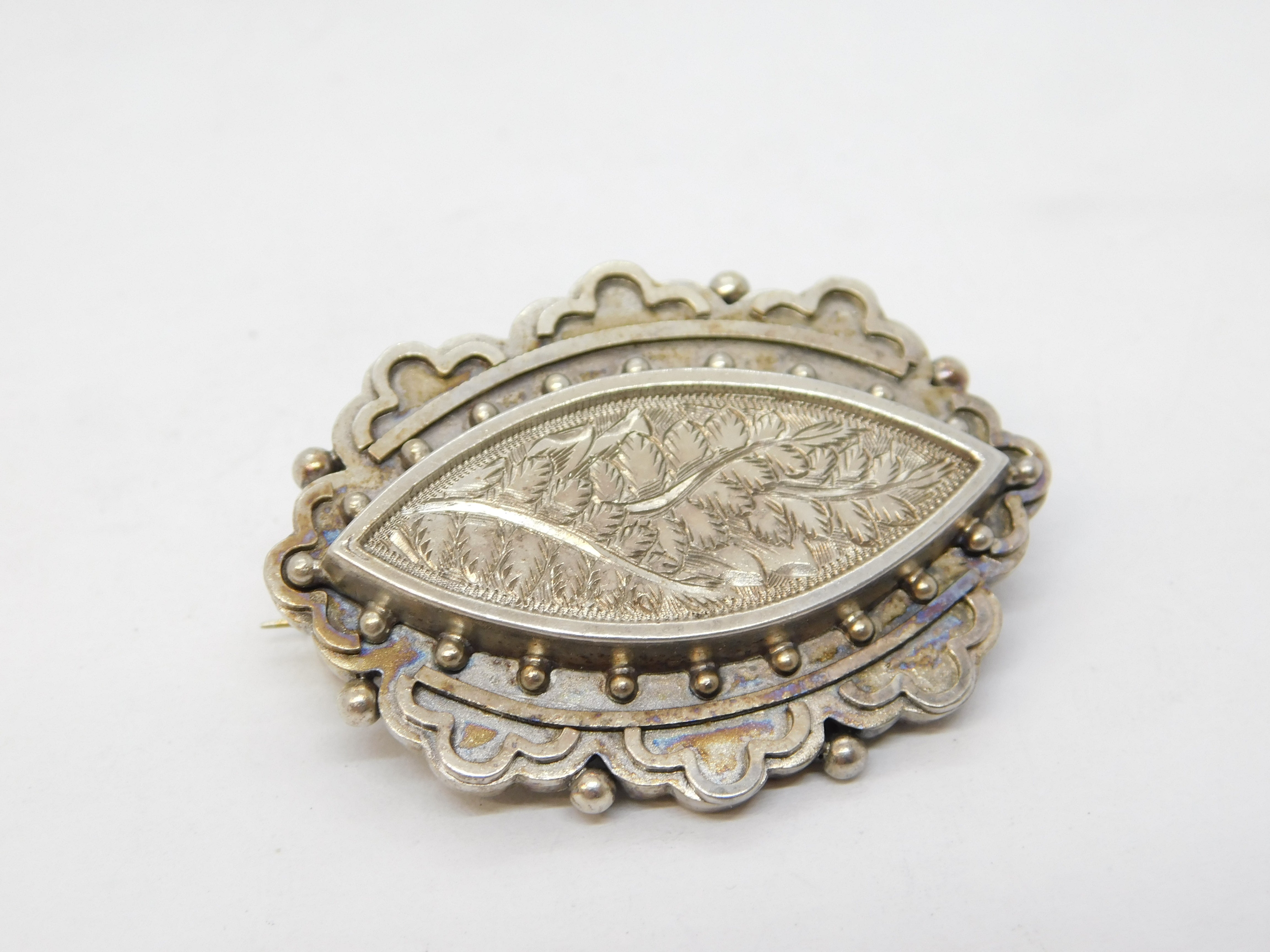 Details: A fantastic and wonderfully designed antique Victorian sterling silver fern leaf pattern mourning brooch with lovely detailing hallmarked Birmingham 1885 by H. Bros. This is a wonderful item that would make a perfect gift or addition to any collection.