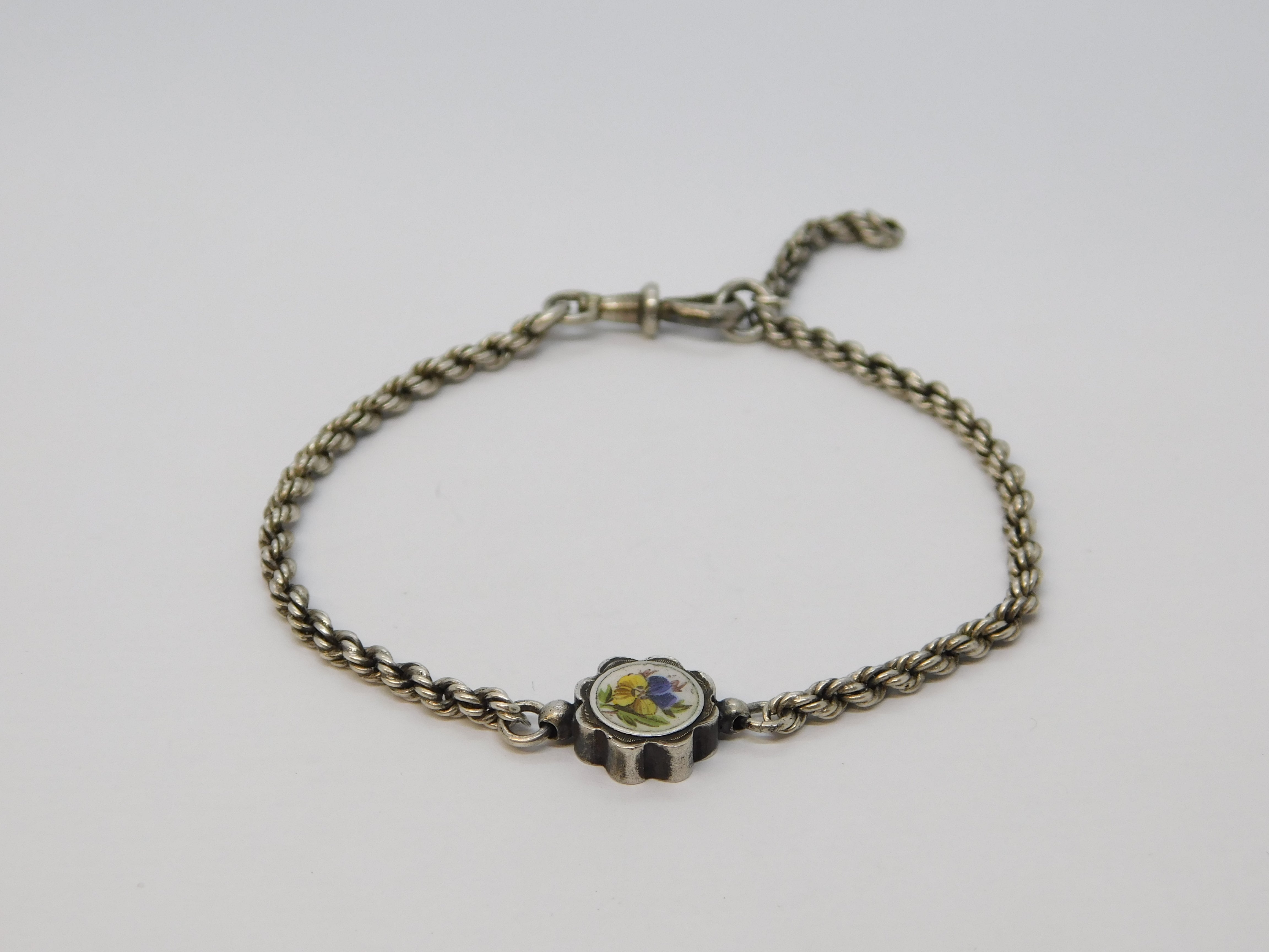 Victorian Sterling Silver & Floral Enamel Sweetheart Bracelet Antique c1890