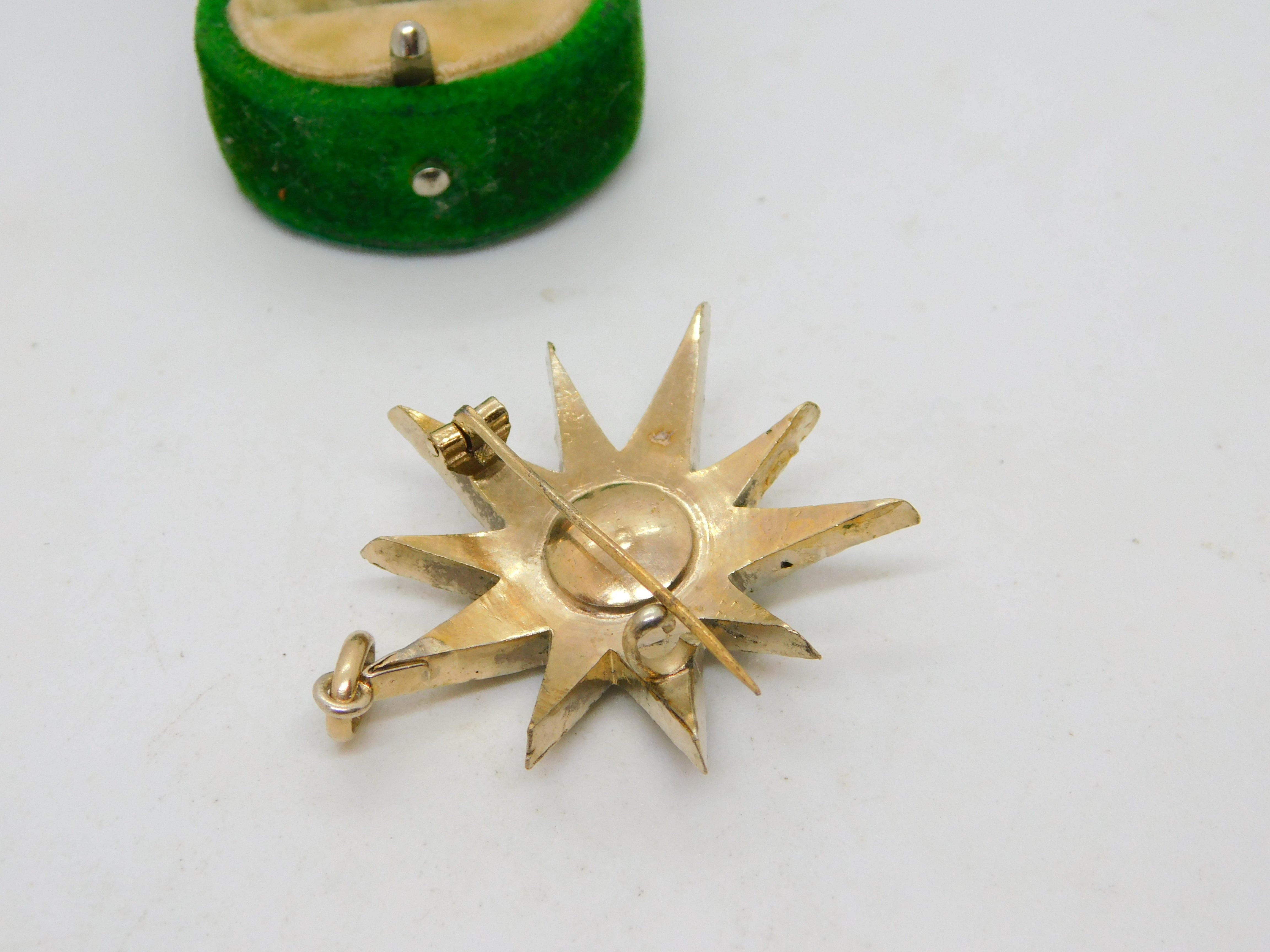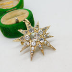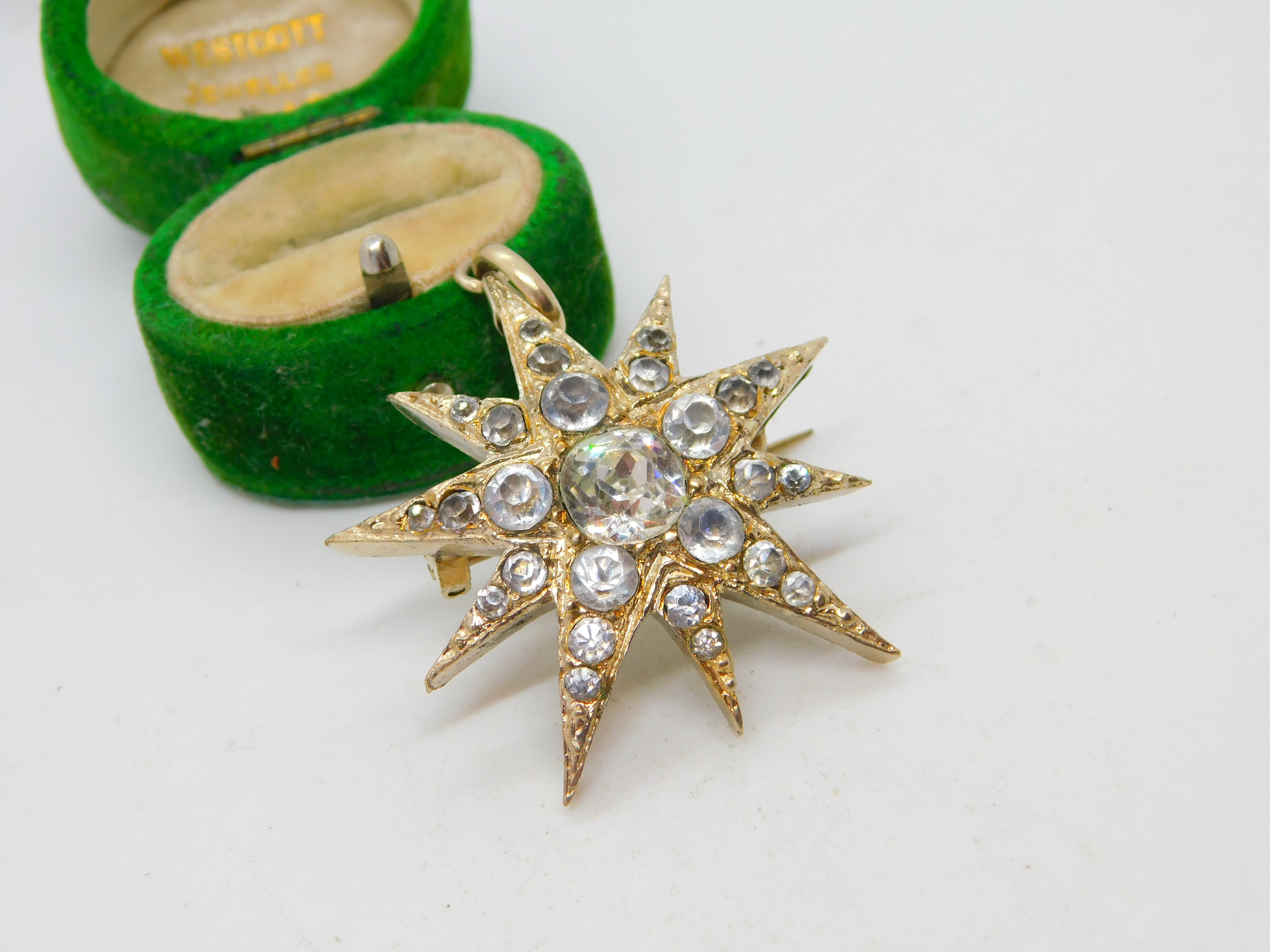 Details: A fantastic and wonderfully designed antique Victorian sterling silver gilt & paste set starburst drop pendant or brooch c1880, the gold has been XRF tested as it is unmarked. This is a wonderful item that would make a perfect gift or addition to any collection. The BOX pictured is for PRESENTATION ONLY and is NOT included in the listings but used to frame the pictures unless specifically stated otherwise.