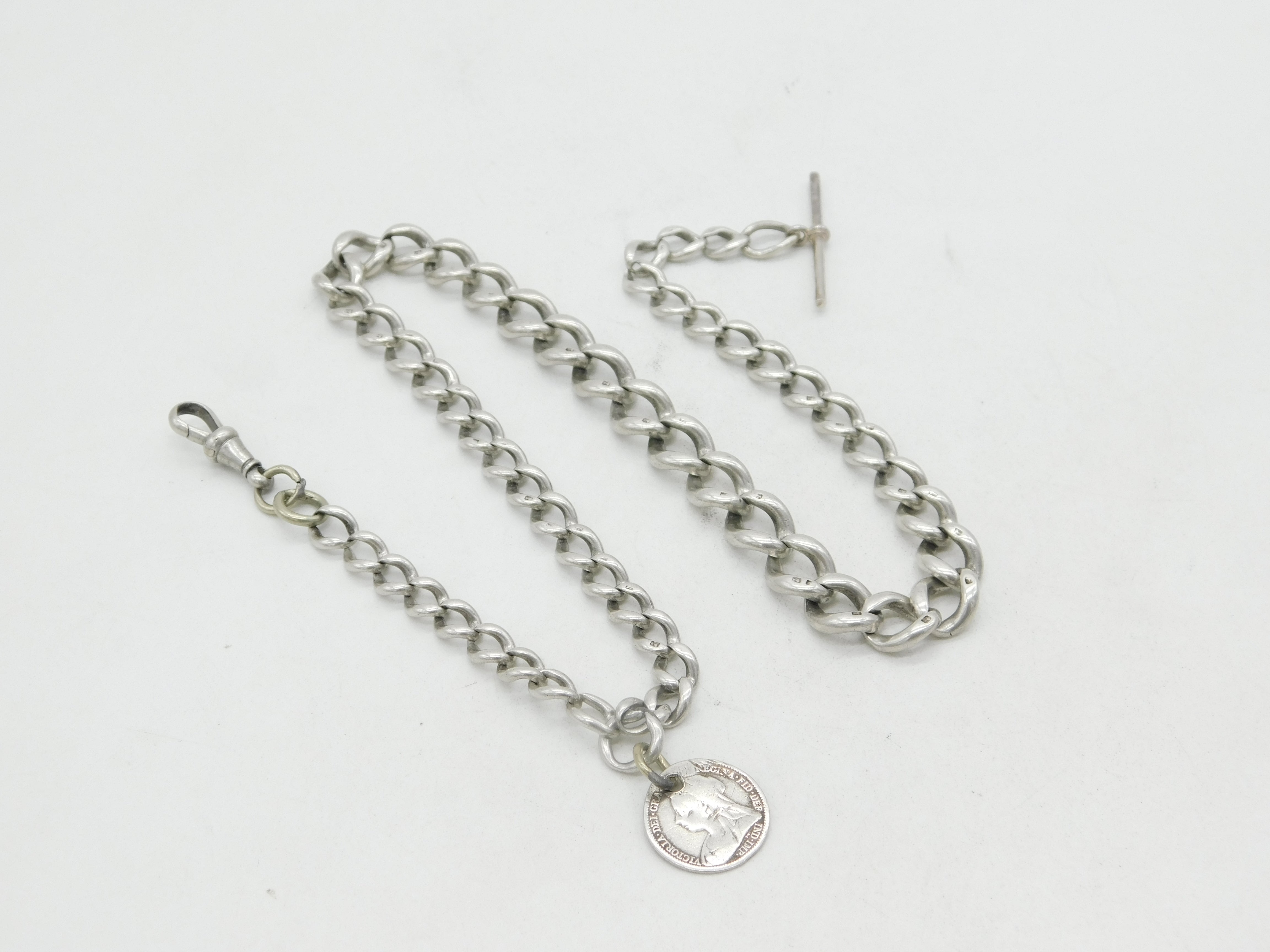 Details: A fantastic and wonderfully designed antique Victorian sterling silver graduating single albert watch chain with t-bar and coin fob, hallmarked to every link of the watch chain, the t-bar is more modern and is just hallmarked silver. This is a wonderful item that would make a perfect gift or addition to any collection.