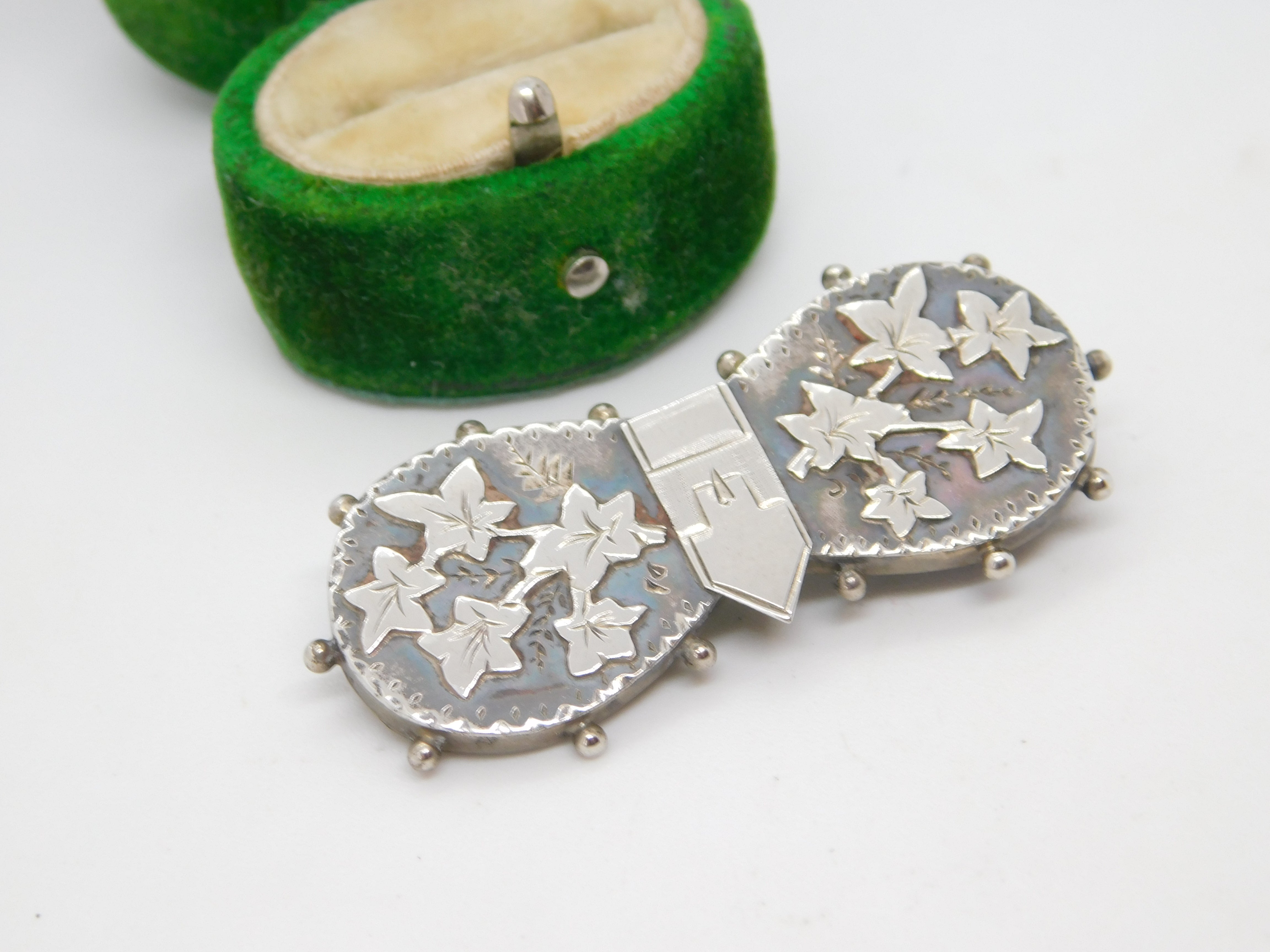 Victorian Sterling Silver Ivy Leaf & Buckle Sweetheart Brooch Antique 1884