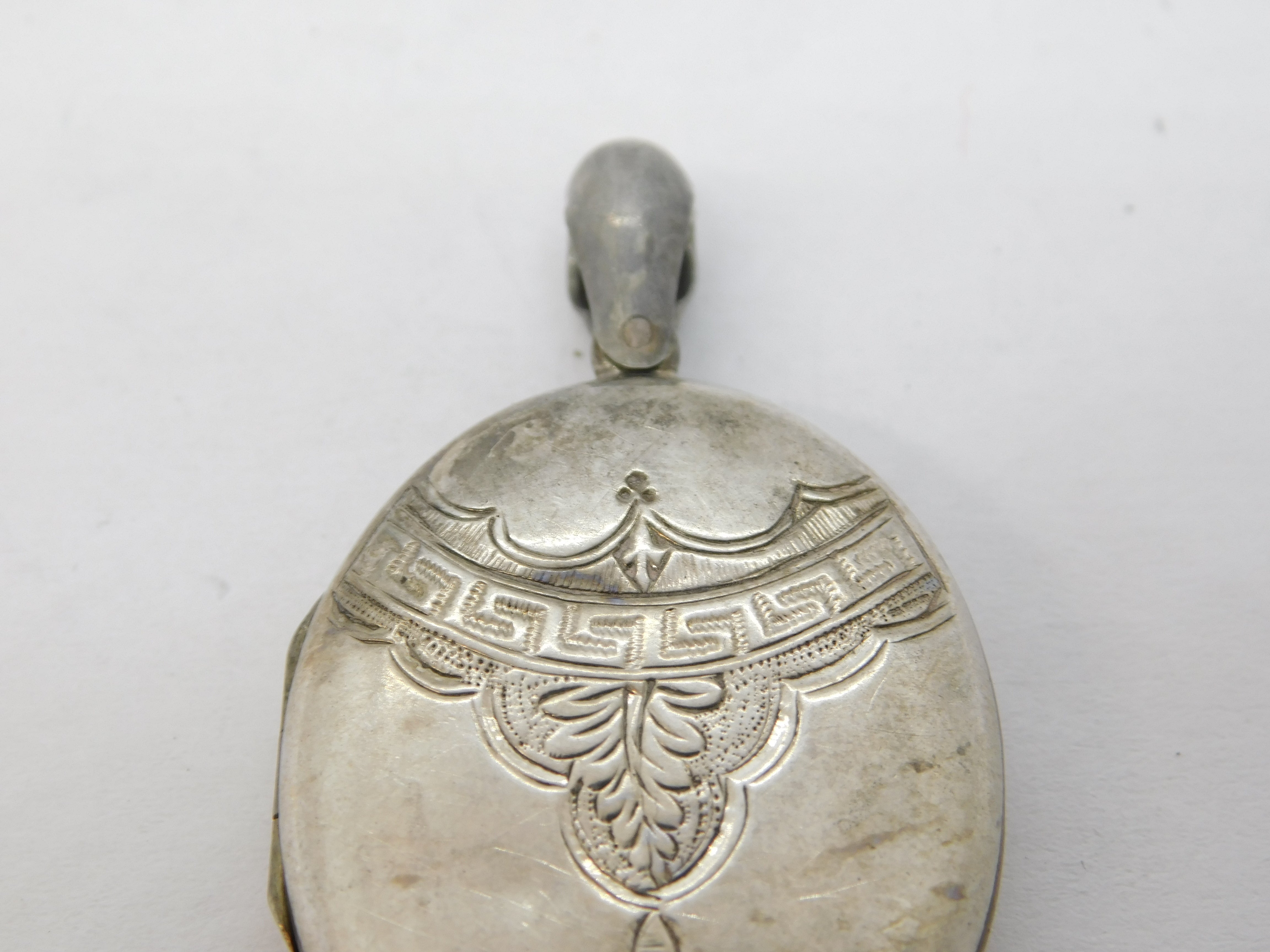 Details: A fantastic and wonderfully designed antique Victorian sterling silver sweetheart locket pendant set with greek key and fern pattern c1880, the silver has been tested. This is a wonderful item that would make a perfect gift or addition to any collection.