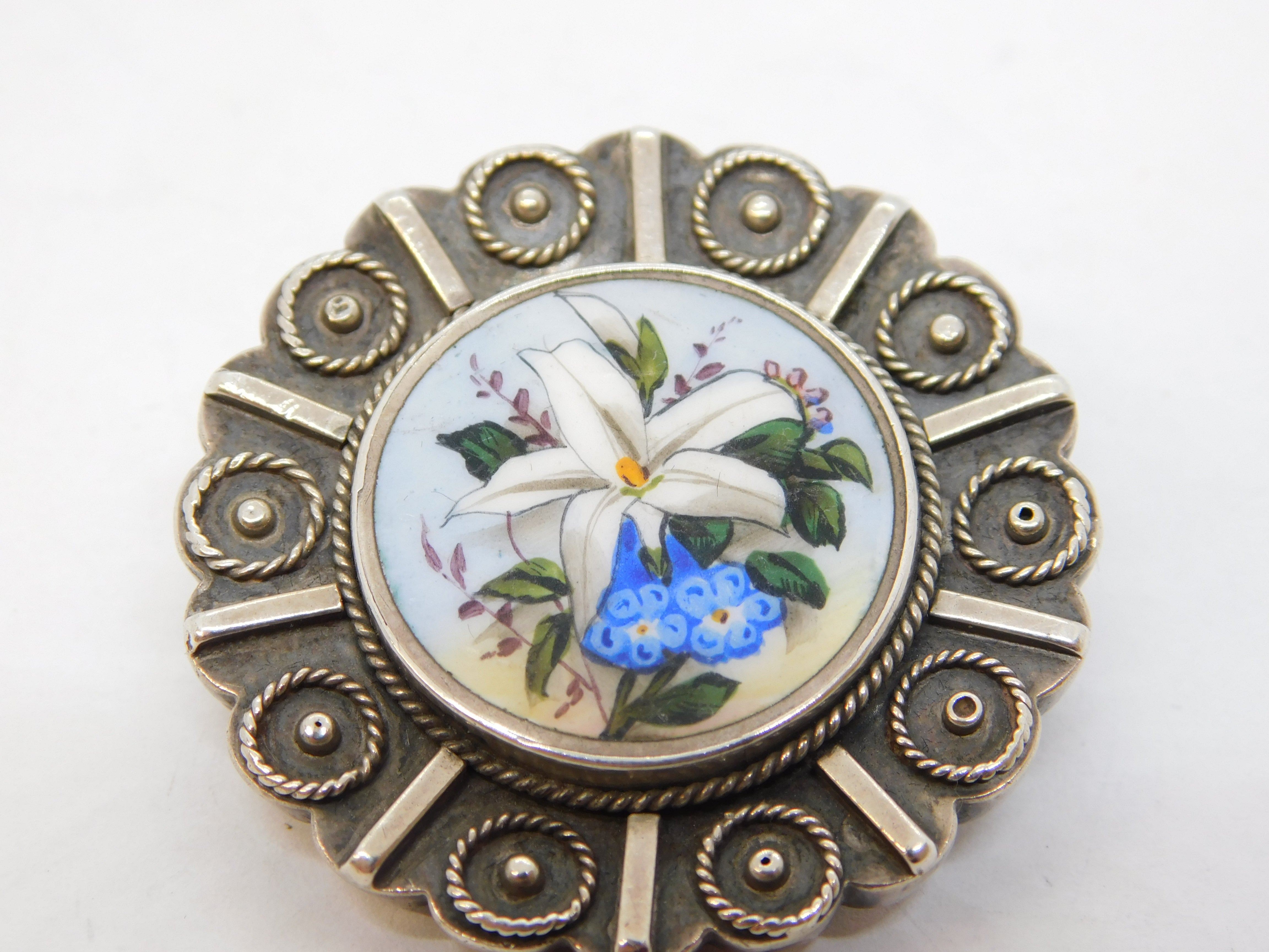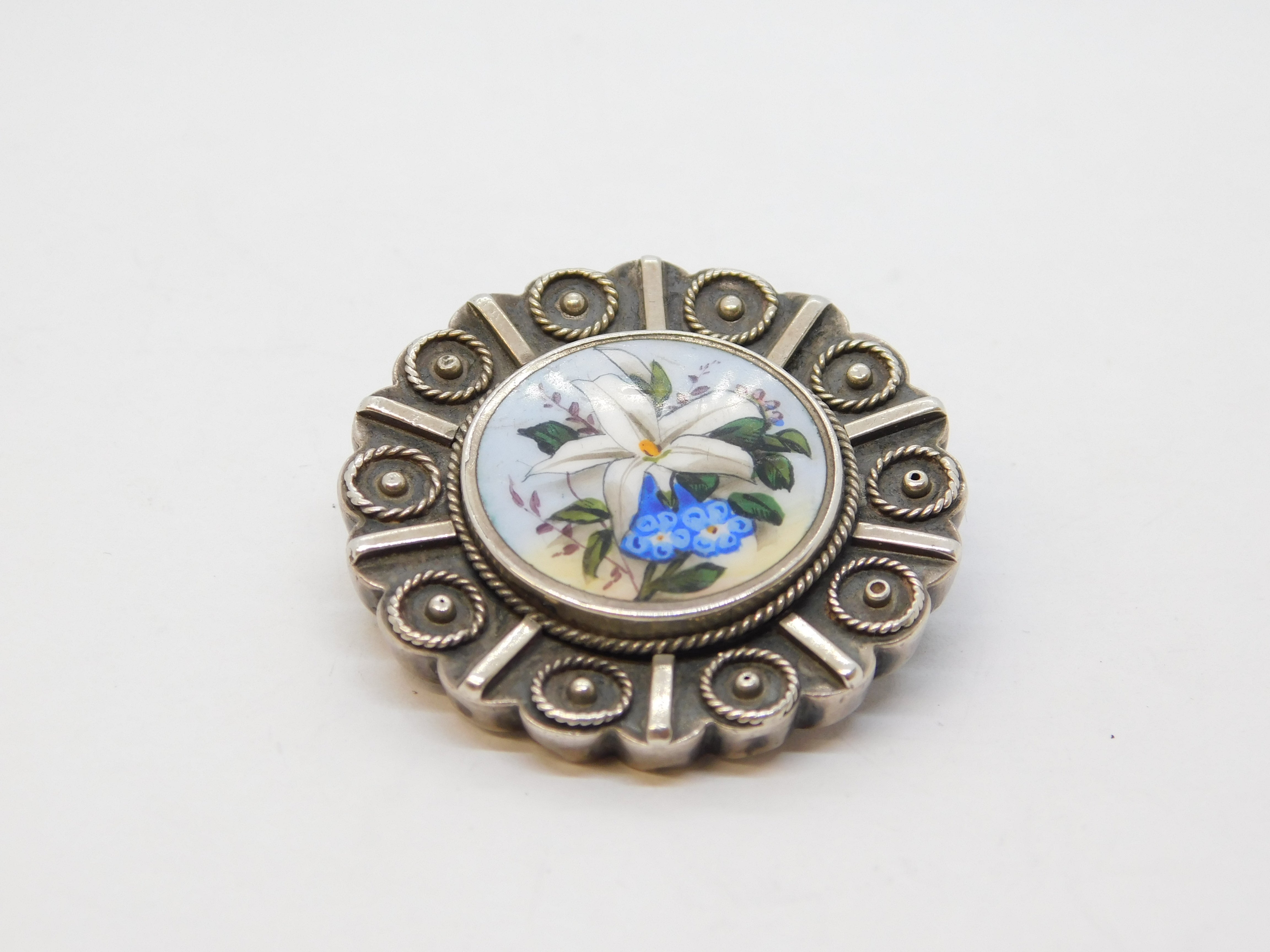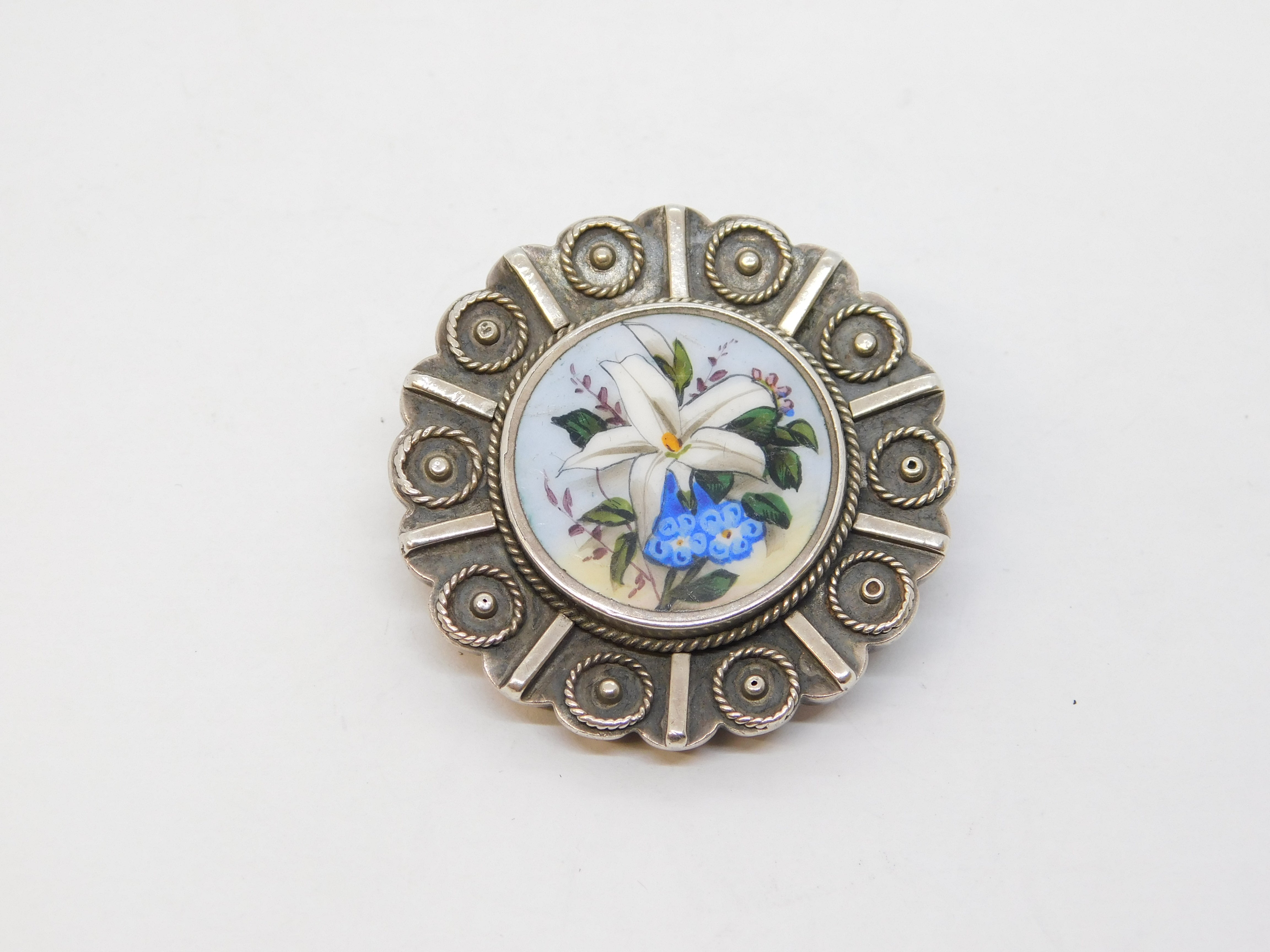 Details: A fantastic and wonderfully designed antique Victorian sterling silver mourning locket brooch with superb enamel plaque depicting a lily flower alongside forget-me-nots marked with makers mark to the reverse and XRF tested. The enamel is in good condition. This is a wonderful item that would make a perfect gift or addition to any collection.