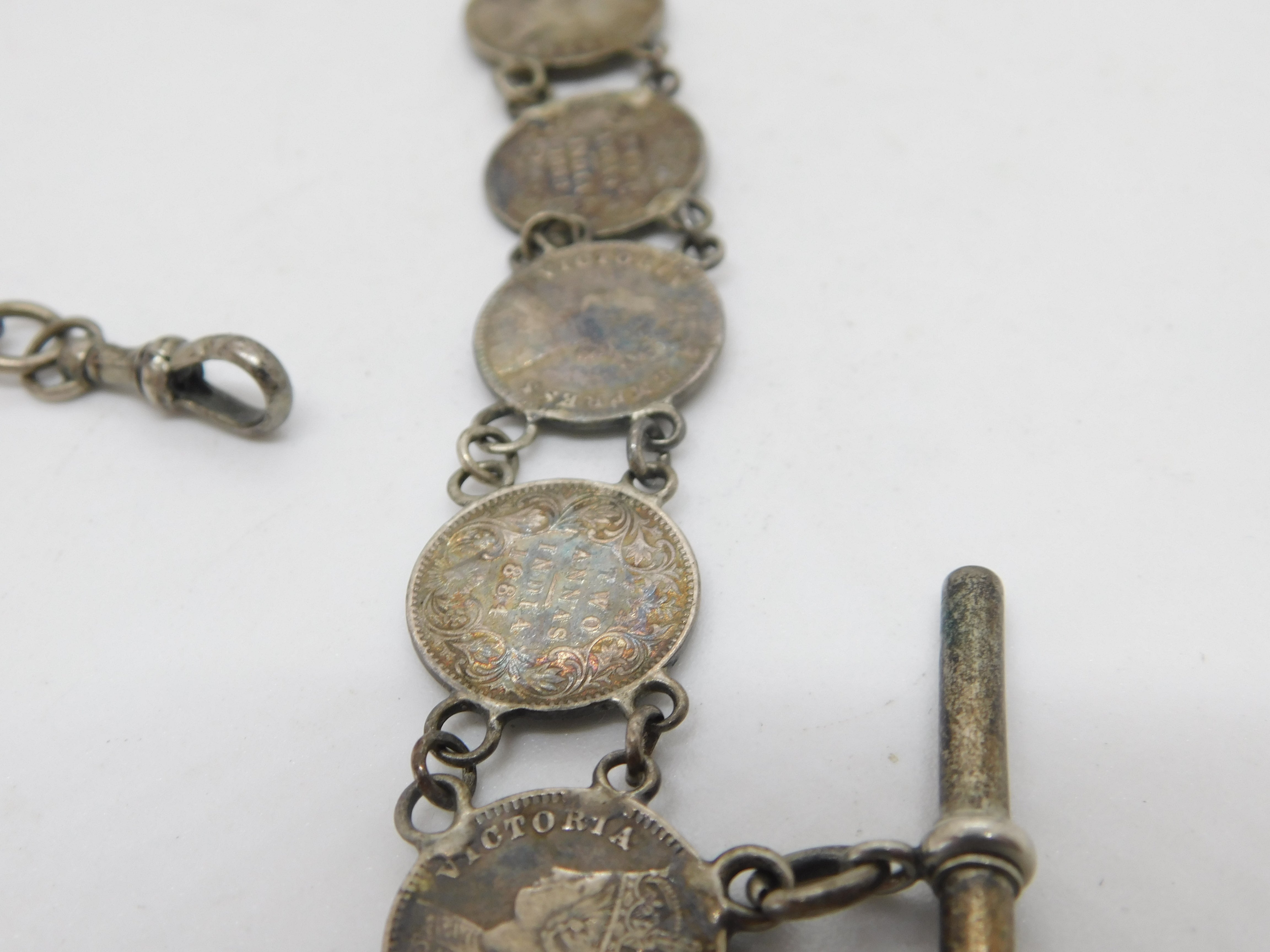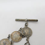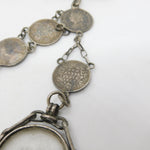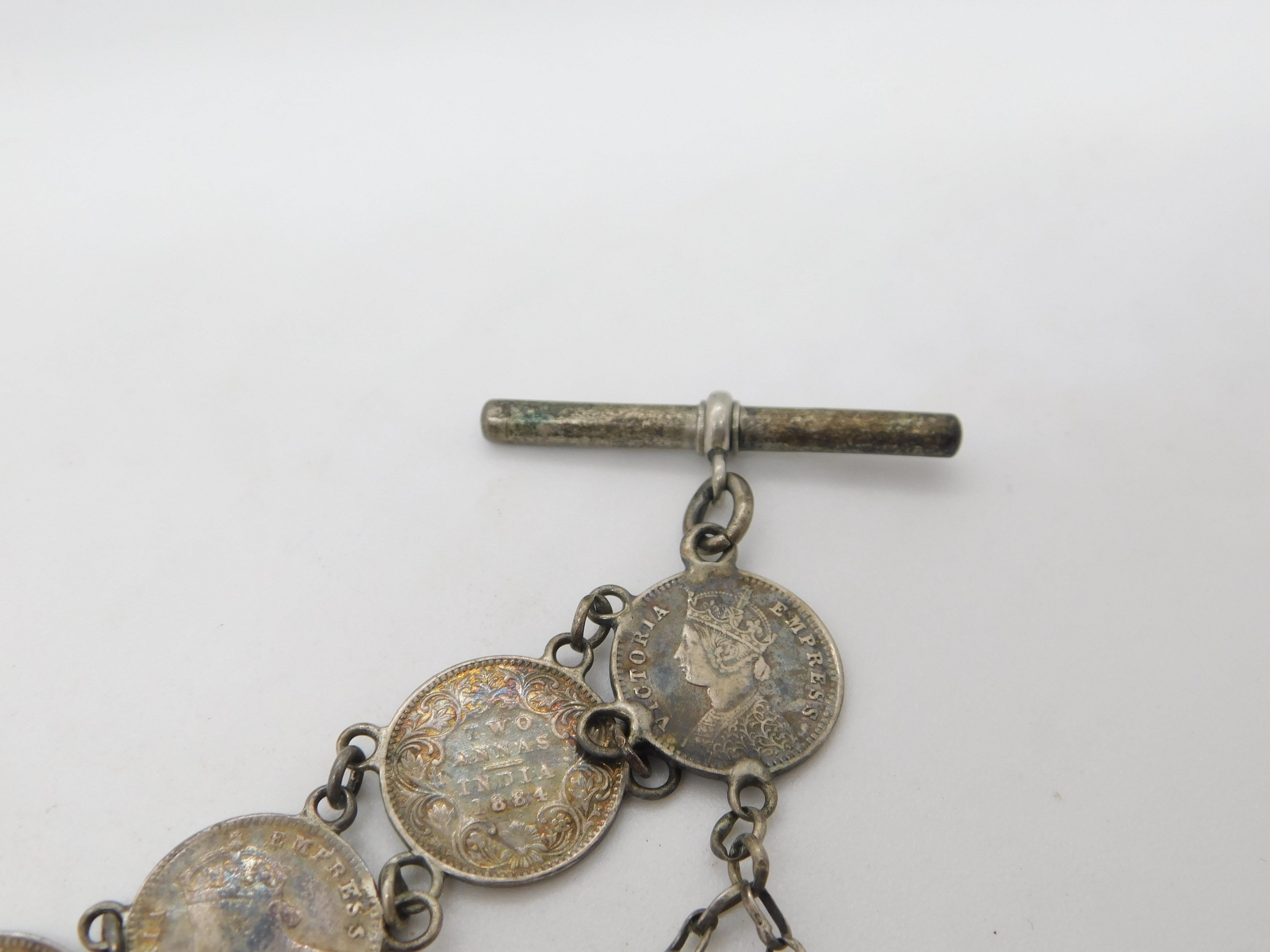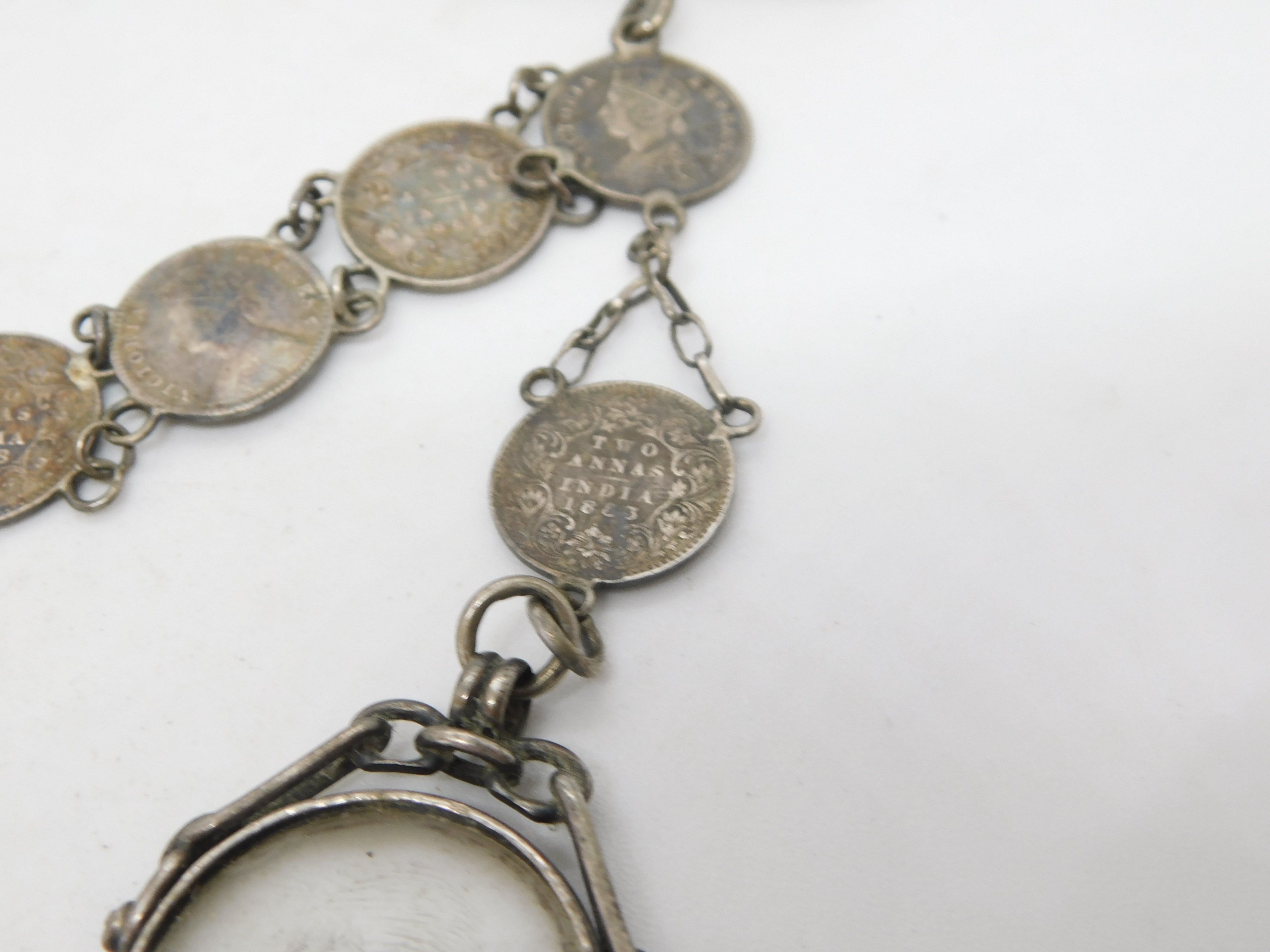 Details: A fantastic and wonderfully designed antique Victorian sterling silver watch chain formed from Indian two annas coins with a variety of differing dates pre-1888 along with a t-bar, dog clip and portrait locket (missing one part of the glas), hallmarked Birmingham 1888 and the coins are sterling silver. This is a wonderful item that would make a perfect gift or addition to any collection. The BOX pictured is for PRESENTATION ONLY and is NOT included in the listings but used to frame the pictures unless specifically stated otherwise.