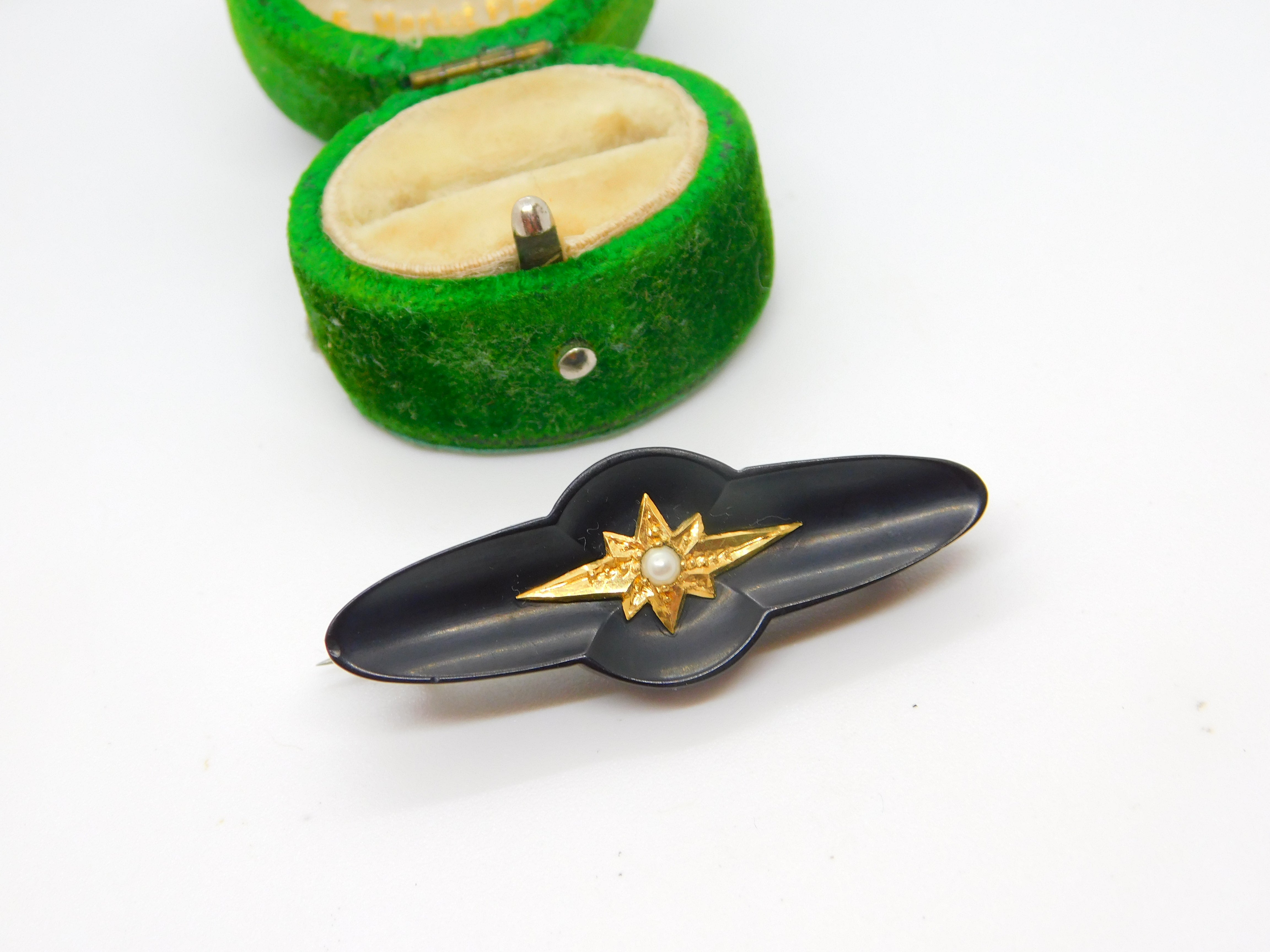 Victorian Whitby Jet, 9ct Gold & Seed Pearl Mourning Brooch Antique c1880
