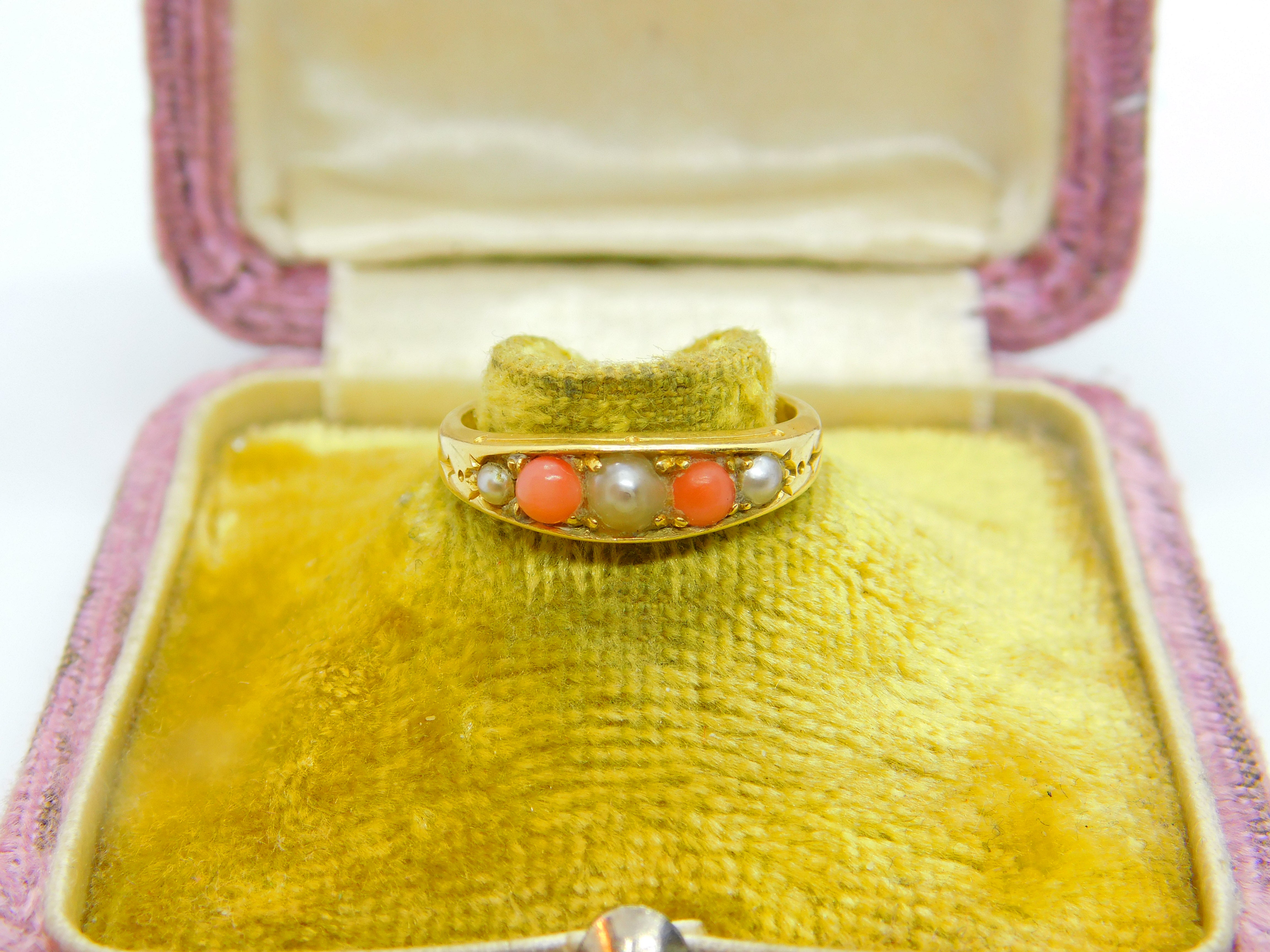 Victorian 18ct Yellow Gold, Red Coral & Seed Pearl Boat Ring c1880 Antique