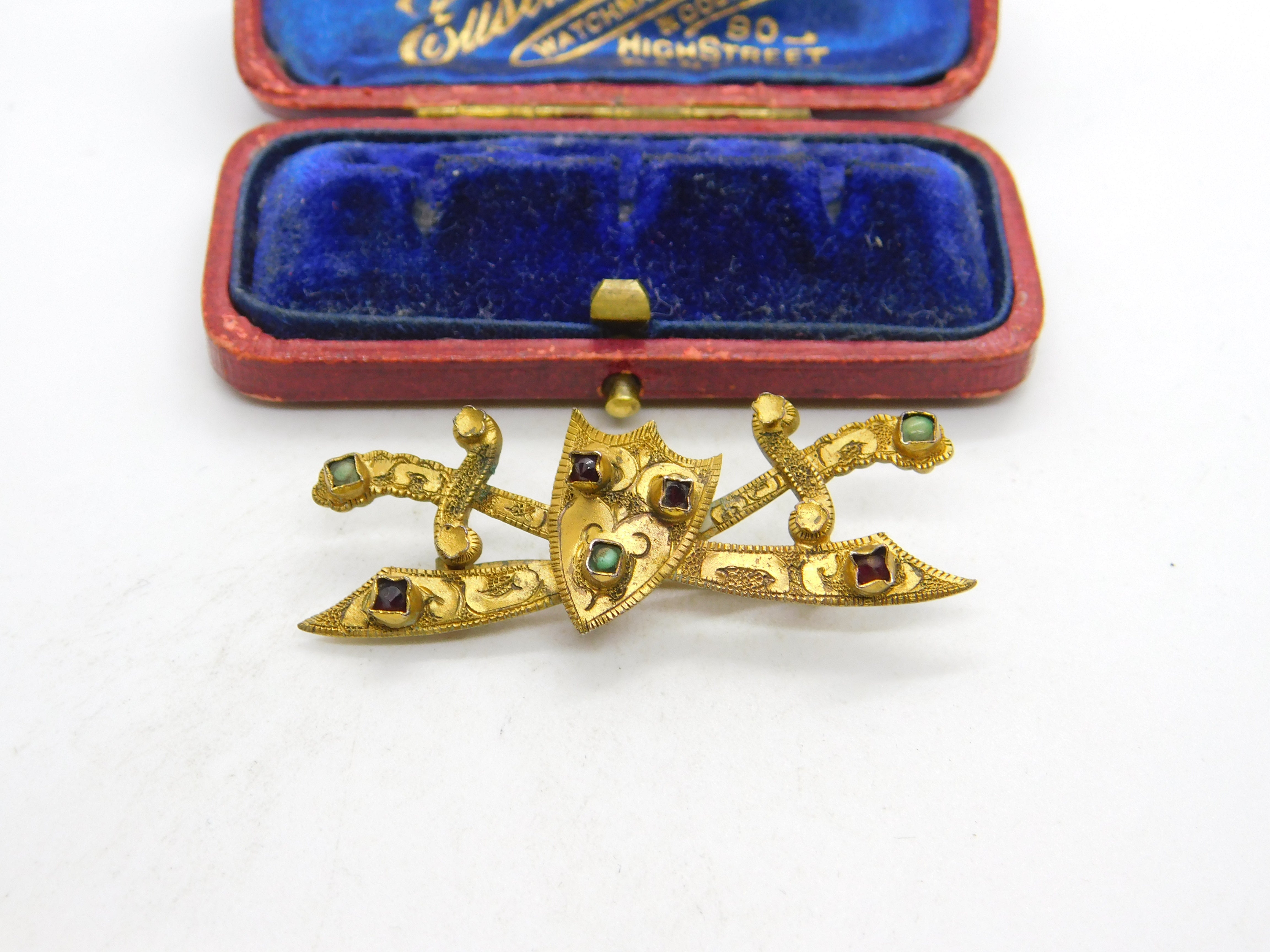 Victorian Pinchbeck, Turquoise & Garnet Set Cross Sword Brooch c1880