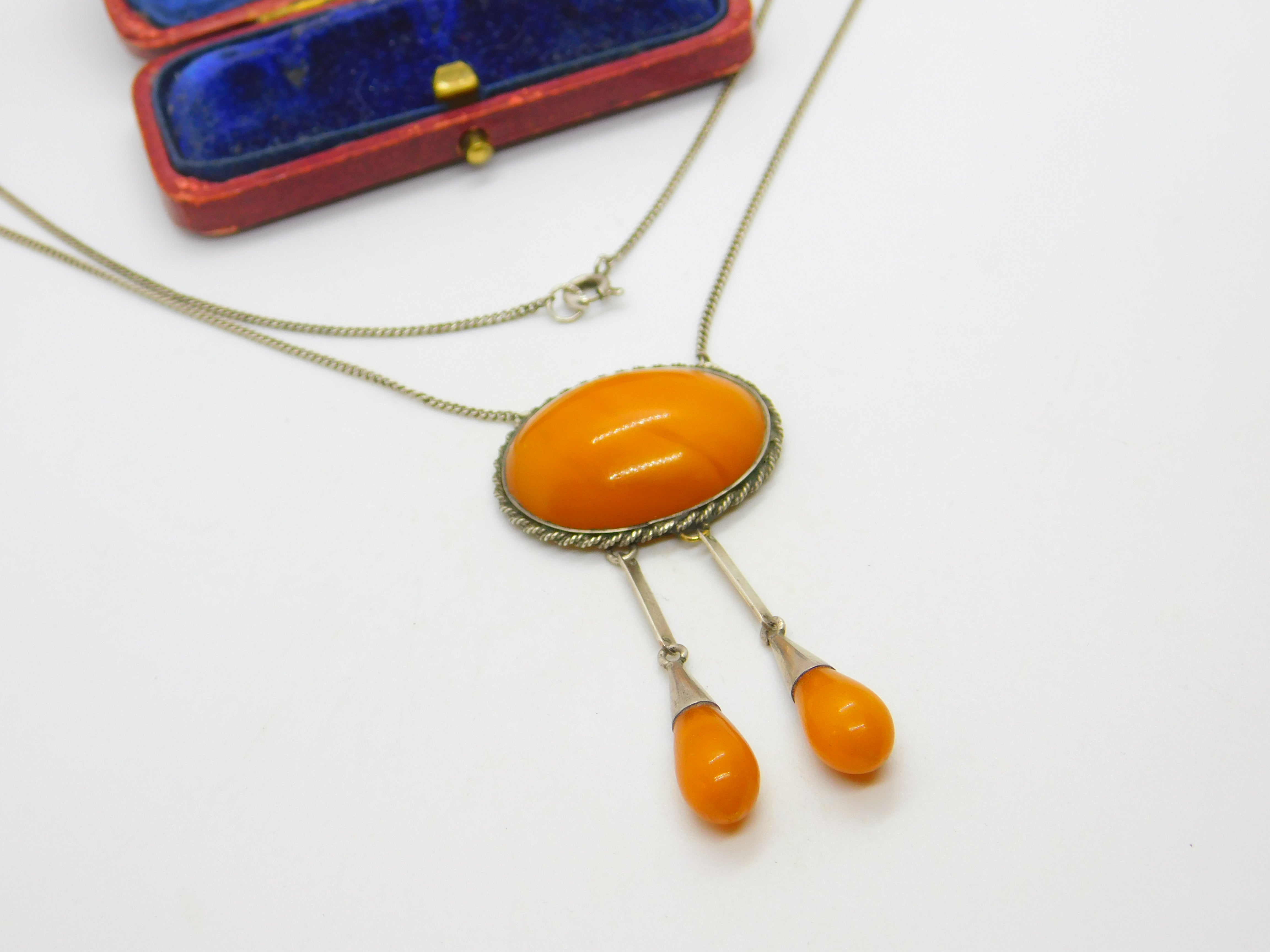 Victorian Sterling Silver Natural Egg Yolk Amber Lavalier Drop Necklace c1900